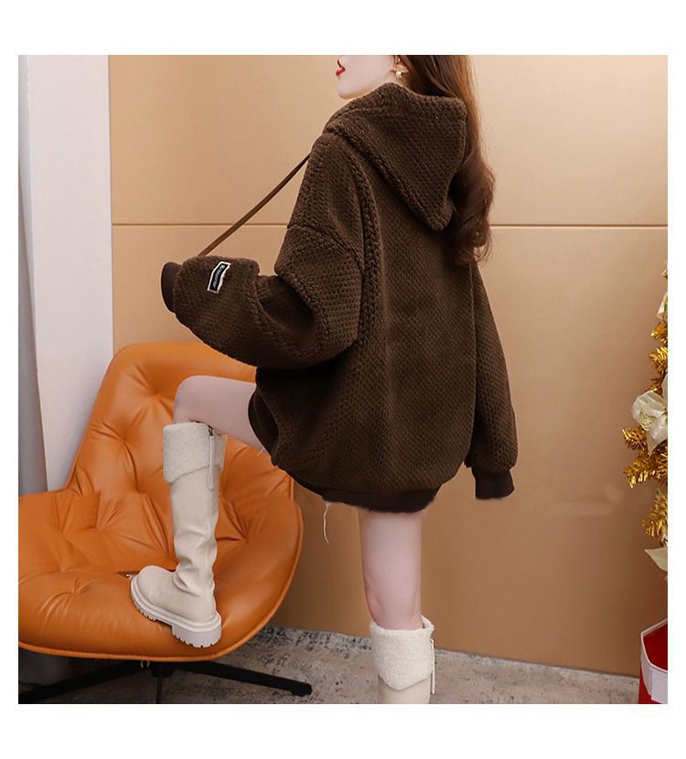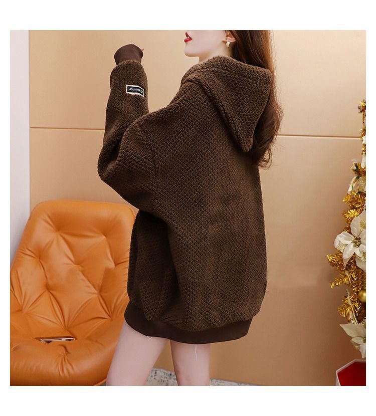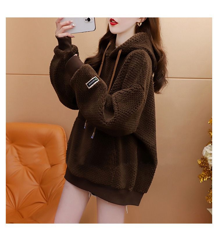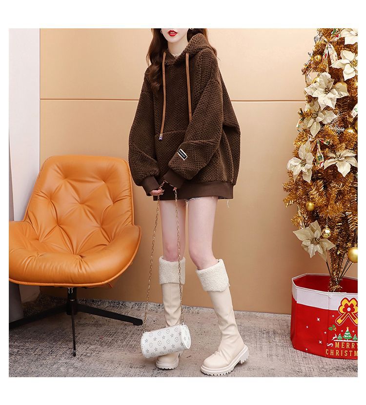 기모 두꺼운 후드 스웨트 셔츠 여성의 2025 년 새로운 가을과 겨울 폭발 서양식 느슨한 디자인 감각 양고기 울 재킷