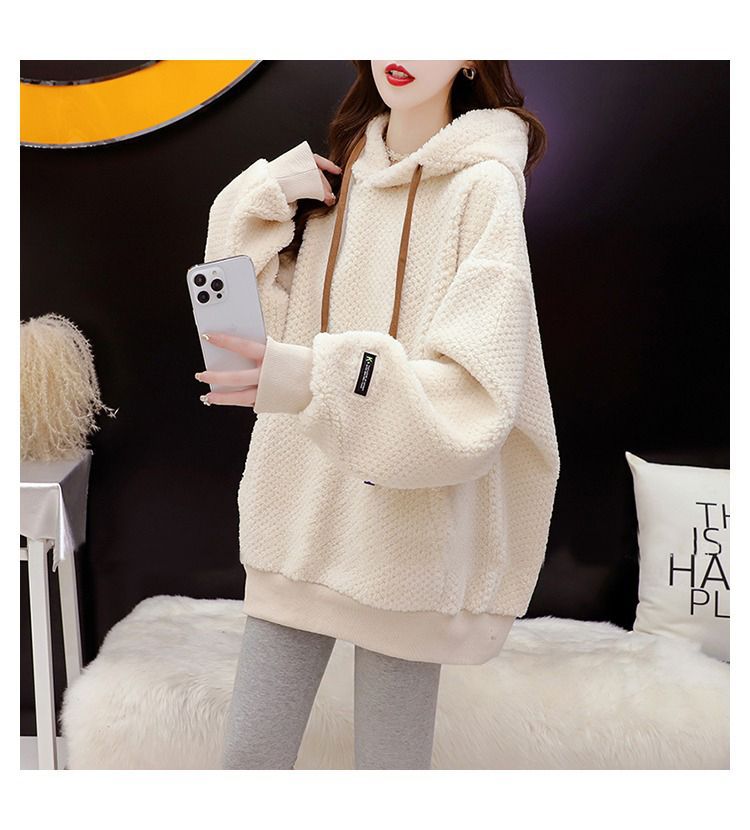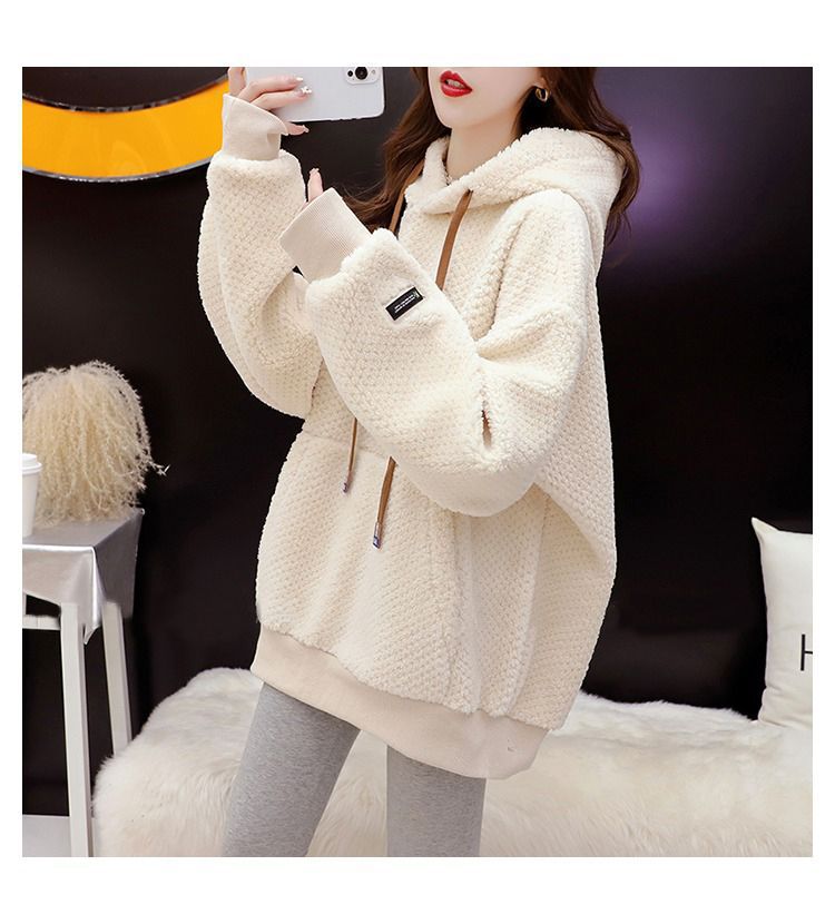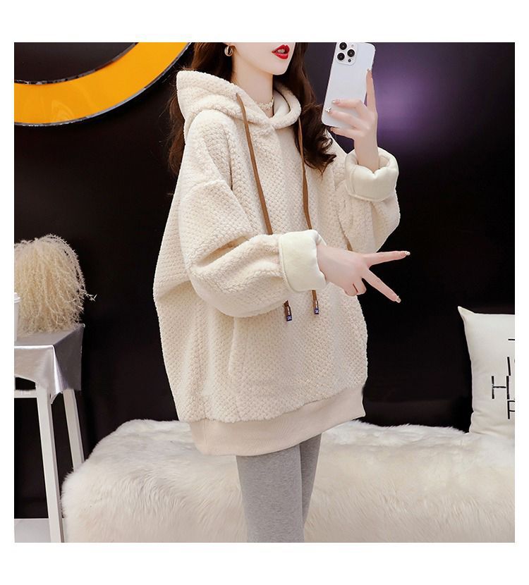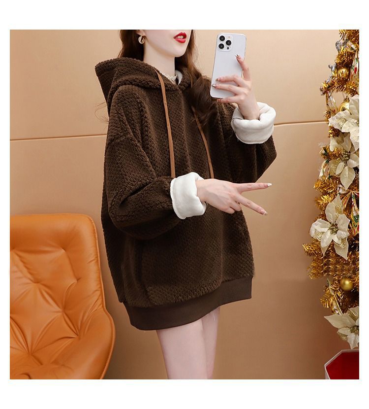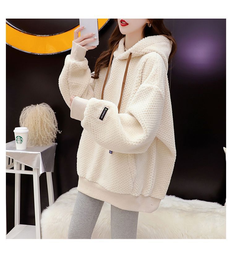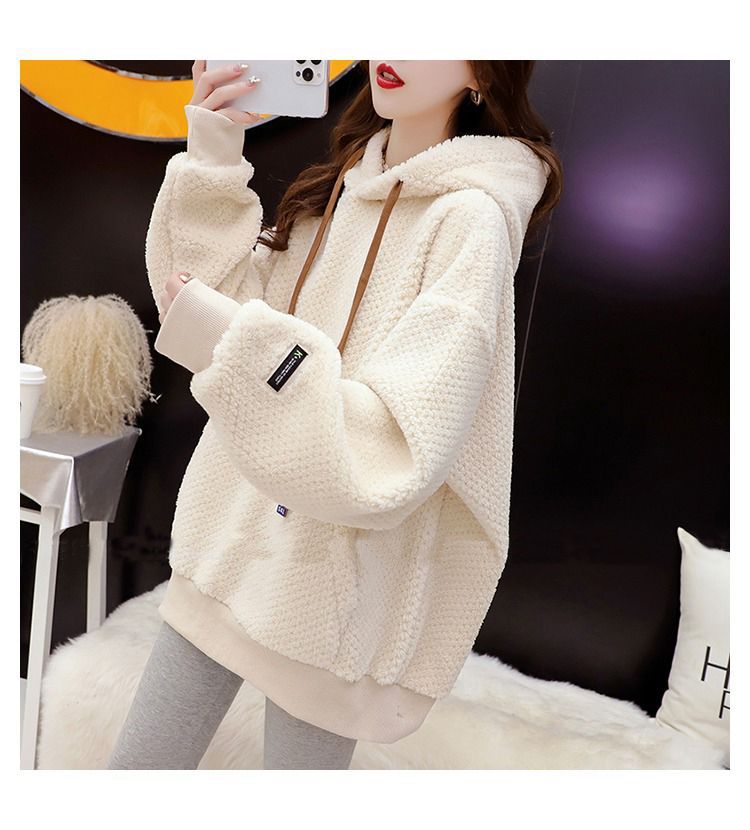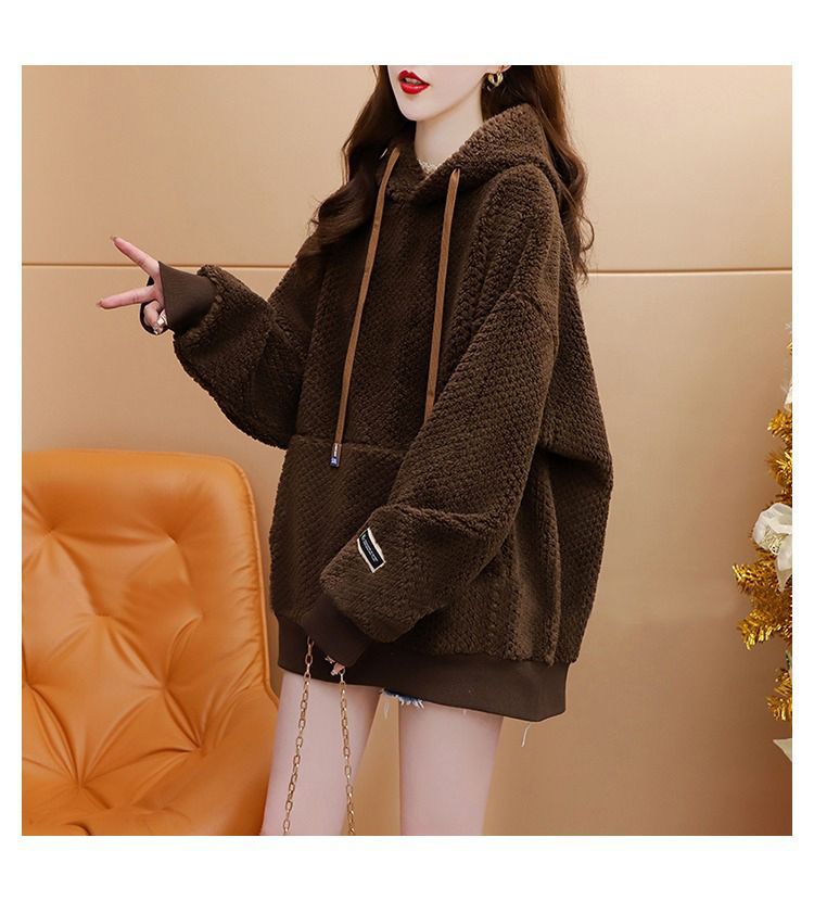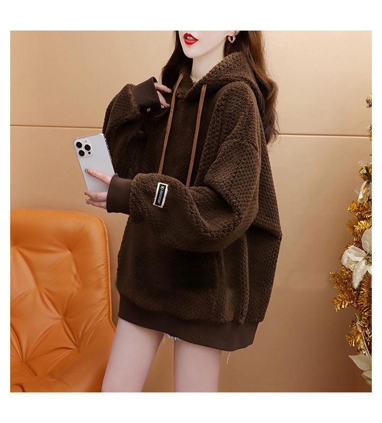 기모 두꺼운 후드 스웨트 셔츠 여성의 2025 년 새로운 가을과 겨울 폭발 서양식 느슨한 디자인 감각 양고기 울 재킷스토어 가기