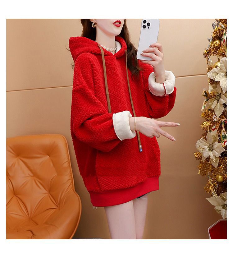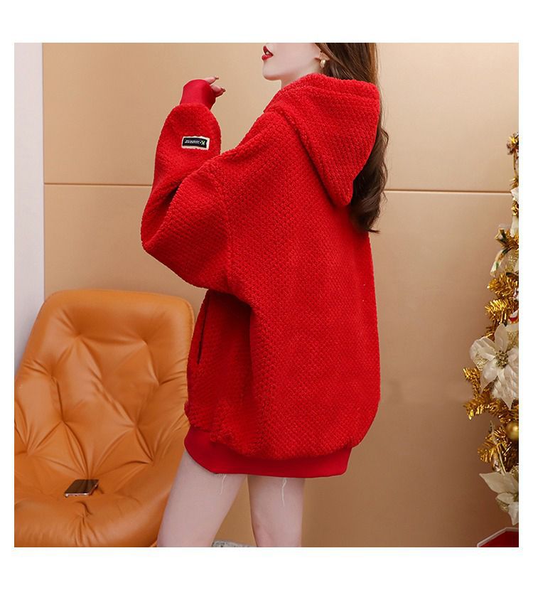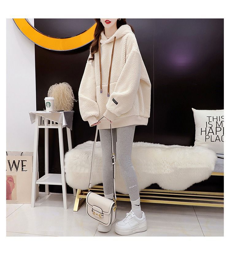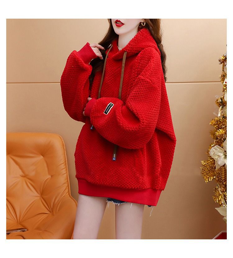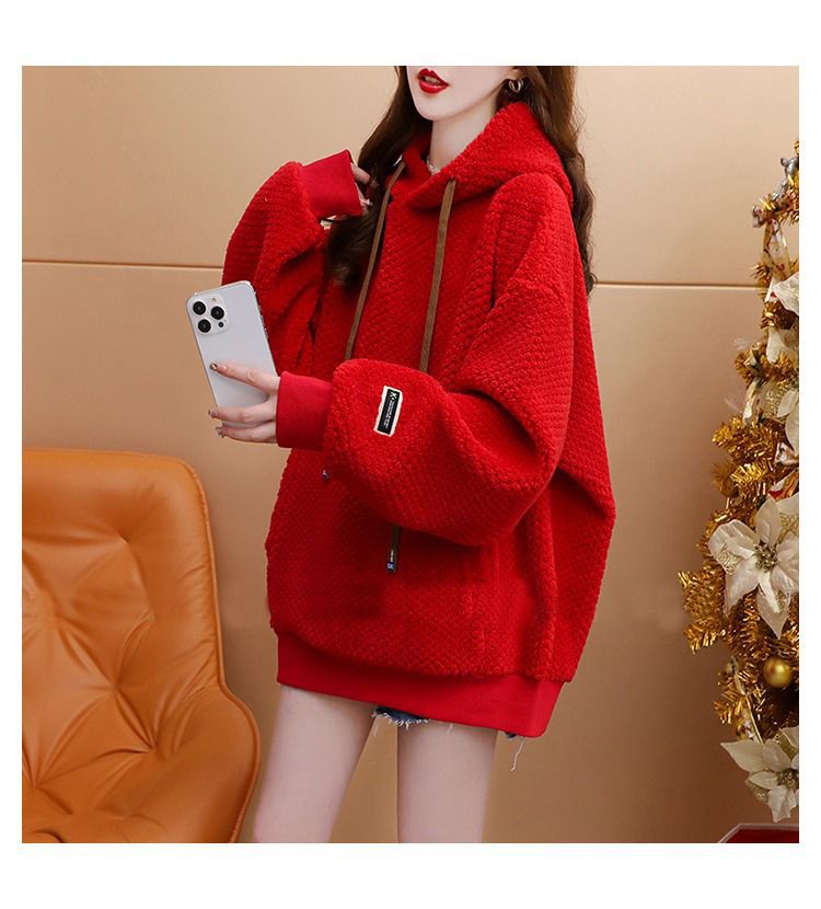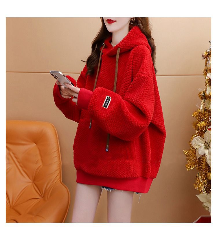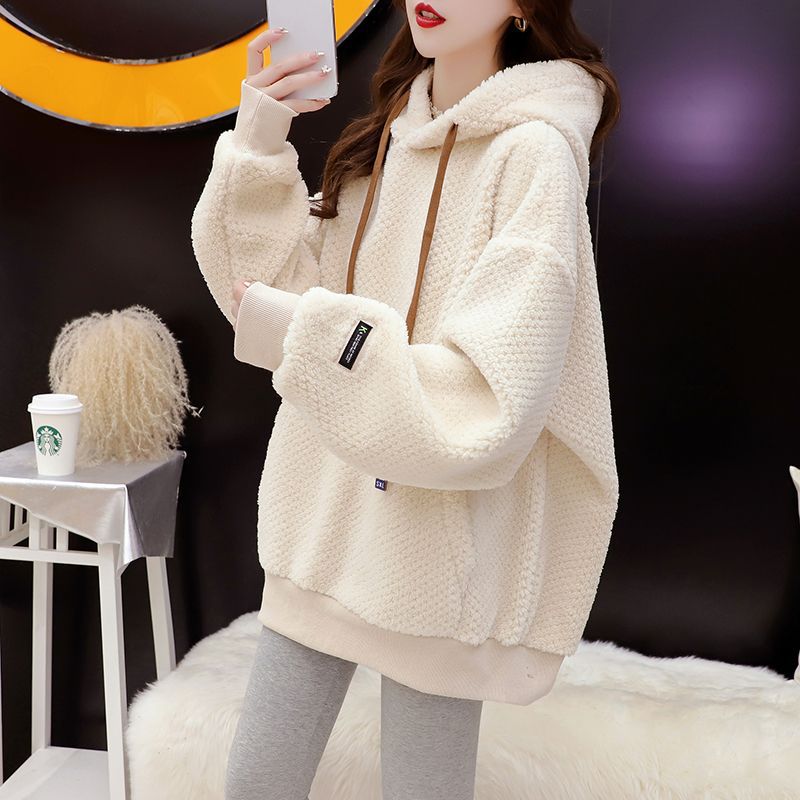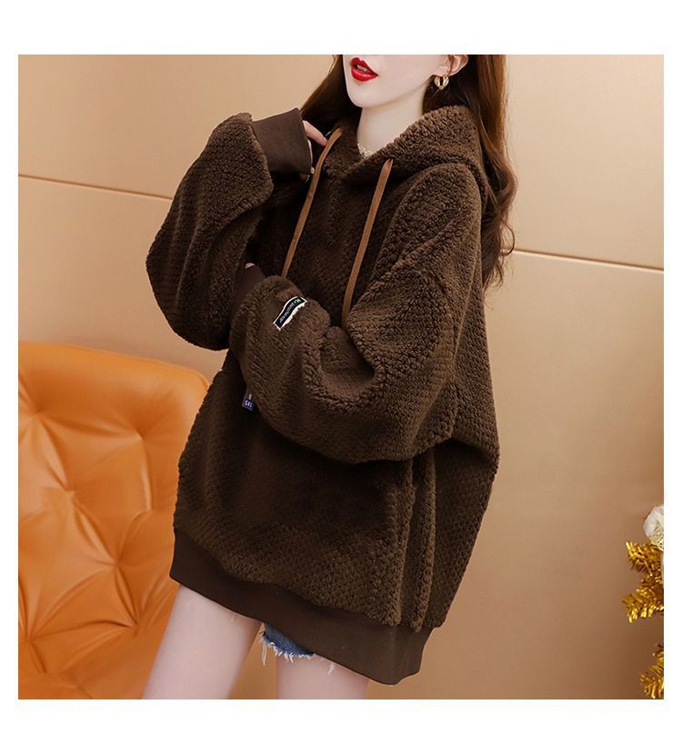 기모 두꺼운 후드 스웨트 셔츠 여성의 2025 년 새로운 가을과 겨울 폭발 서양식 느슨한 디자인 감각 양고기 울 재킷스토어 가기