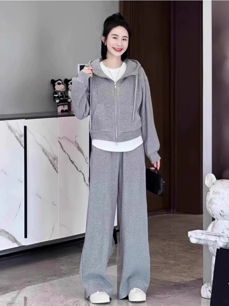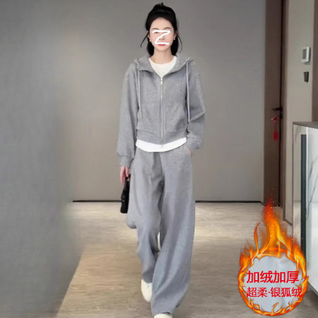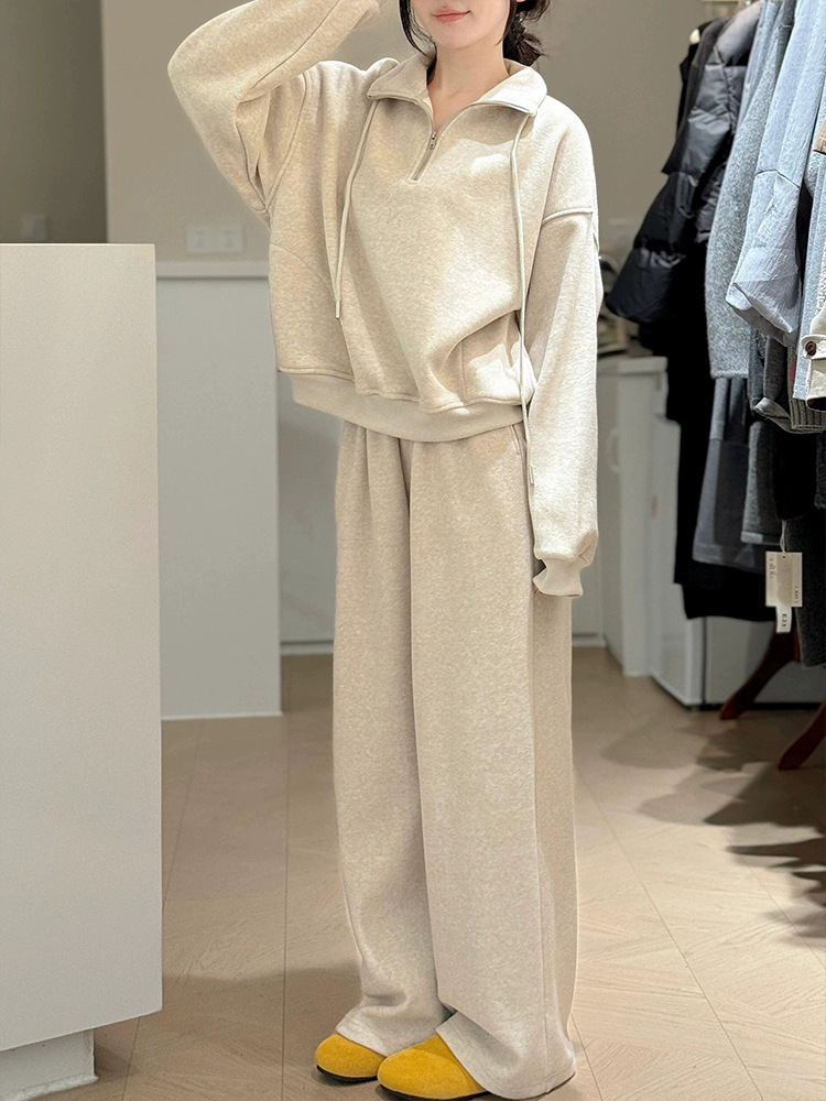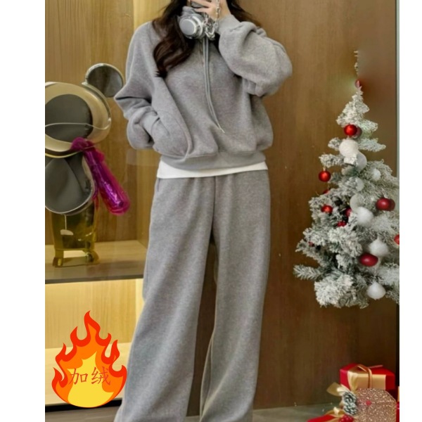 2025 겨울 여성 패션 스포츠 세트 기모 두꺼운 스탠드 칼라 하프 지퍼 투피스 연령 감소 슬리밍 디자인 감각스토어 가기