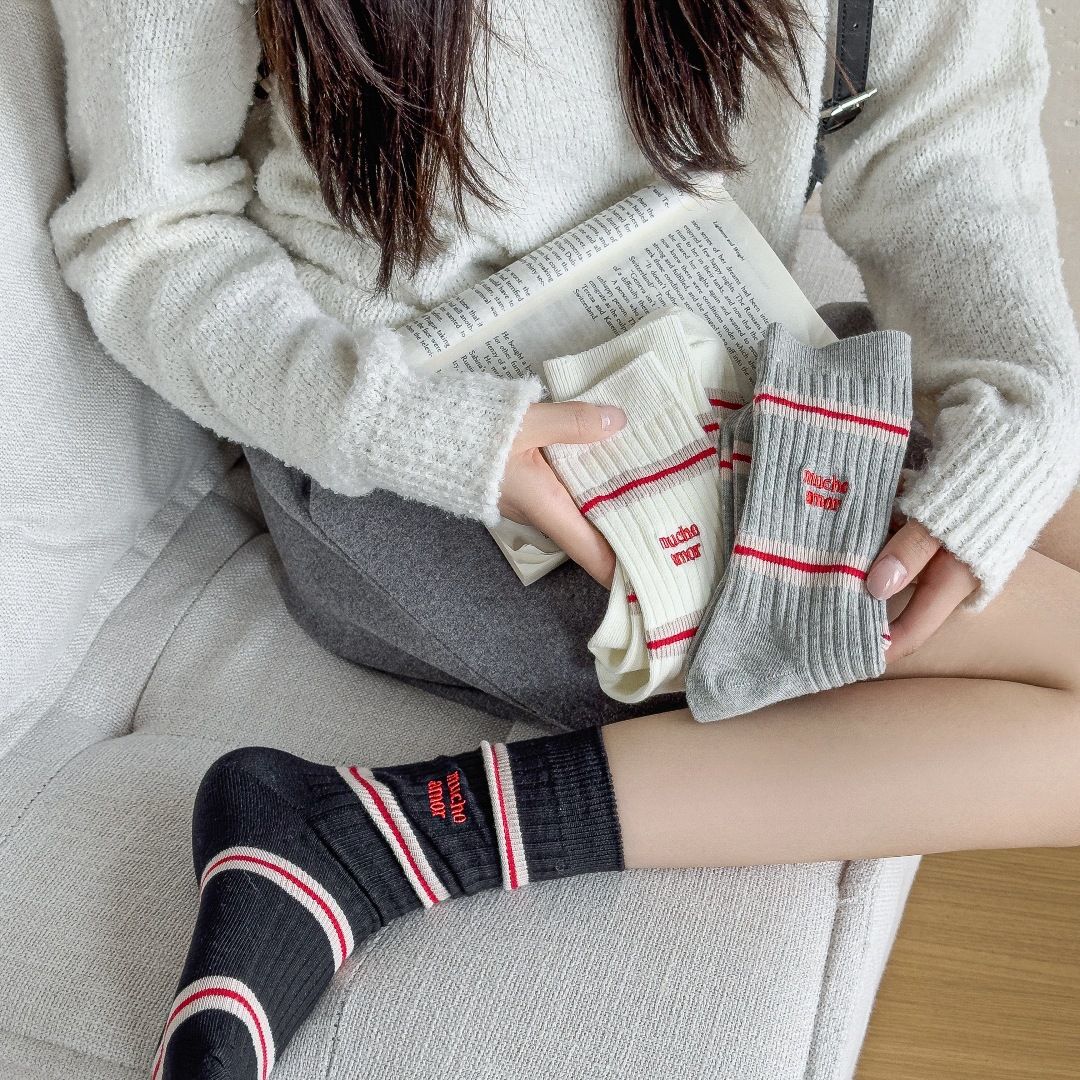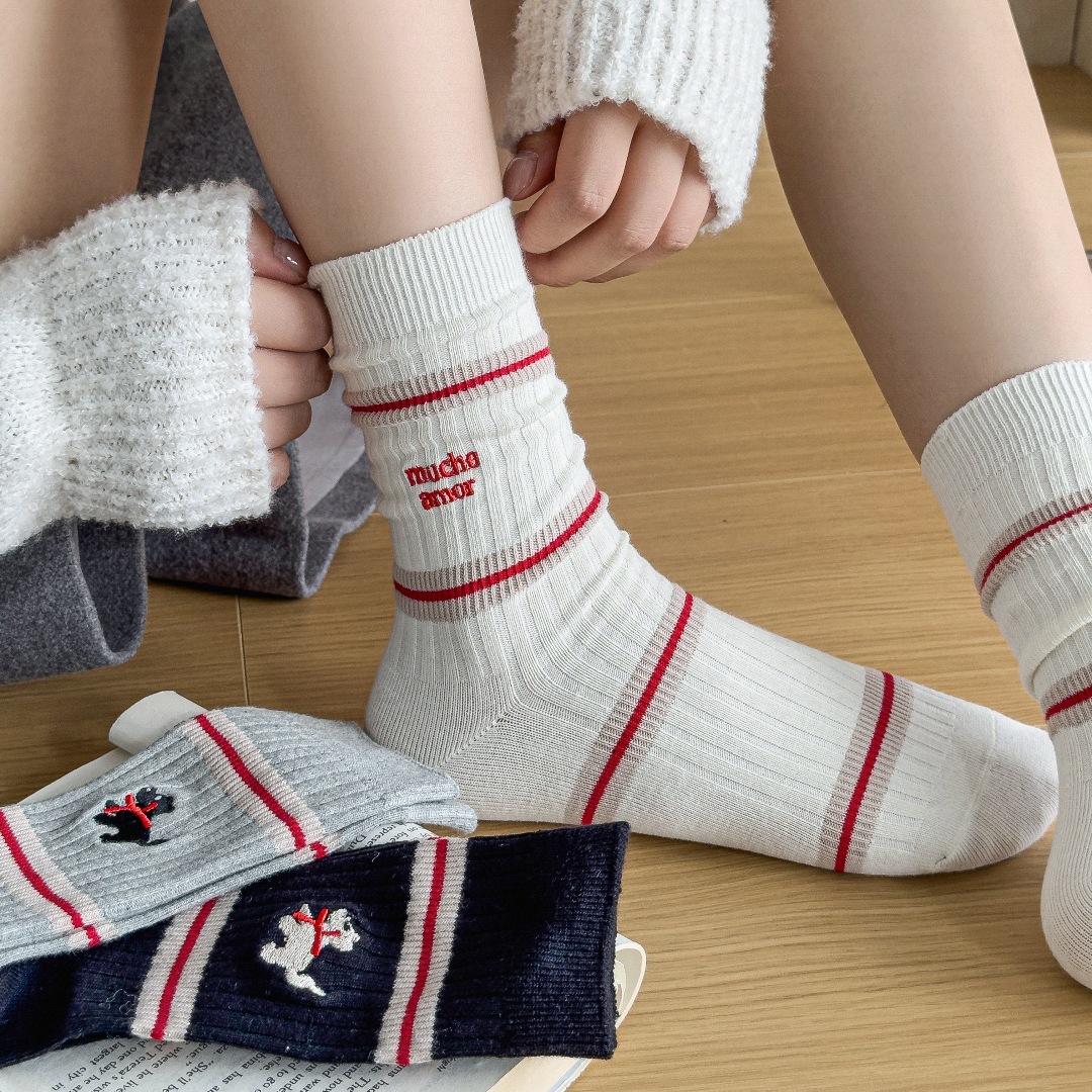 흰색 양말 여성의 가을과 겨울, 트렌디 한 튜브 양말 귀여운 강아지 자수 줄무늬 학술 스타일 스타킹 면화스토어 가기