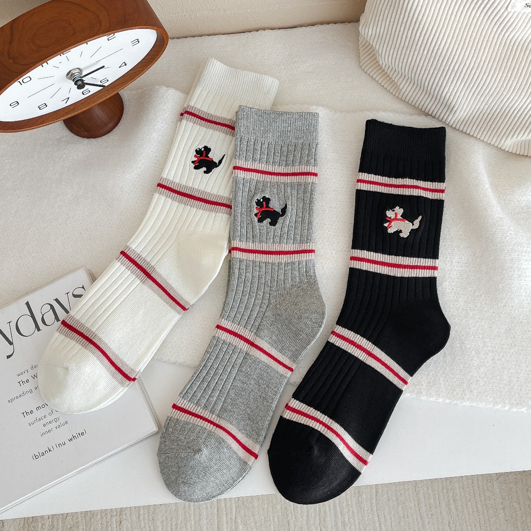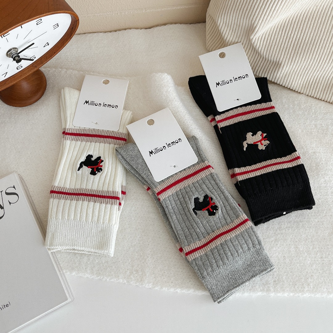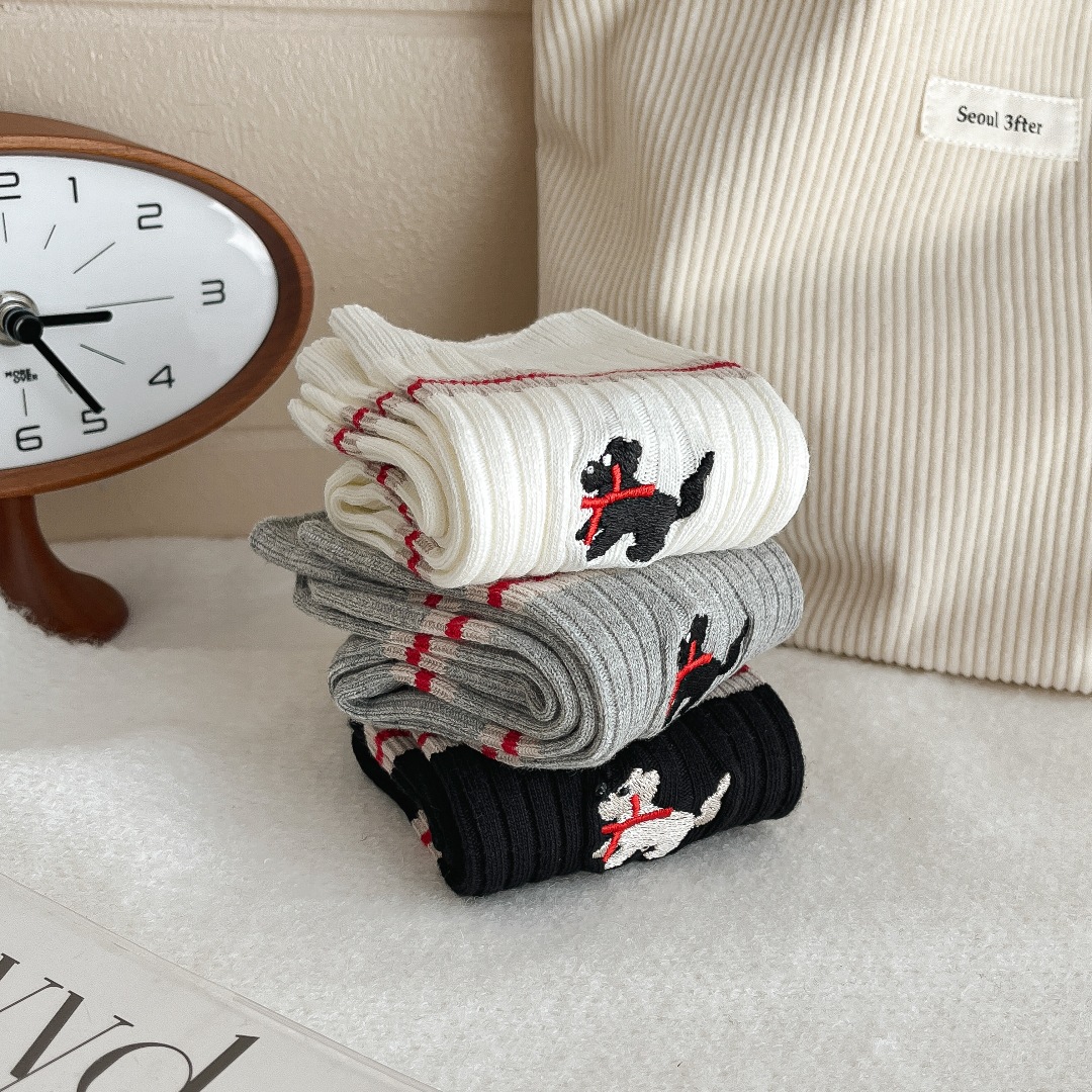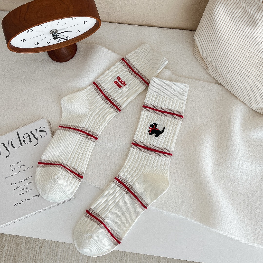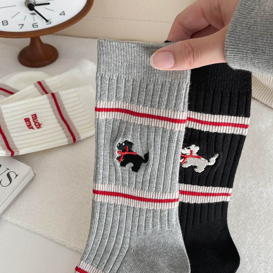 흰색 양말 여성의 가을과 겨울, 트렌디 한 튜브 양말 귀여운 강아지 자수 줄무늬 학술 스타일 스타킹 면화