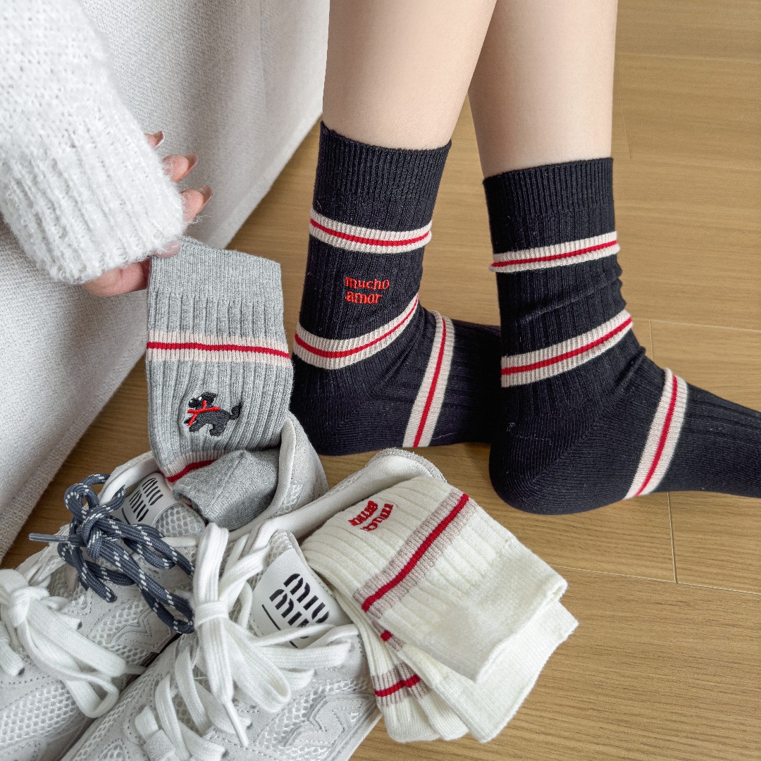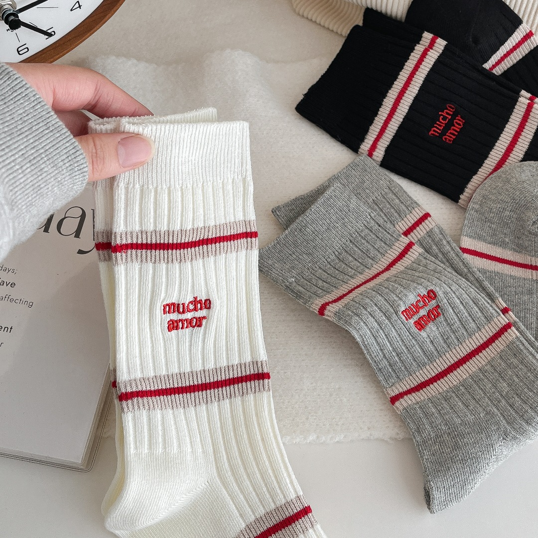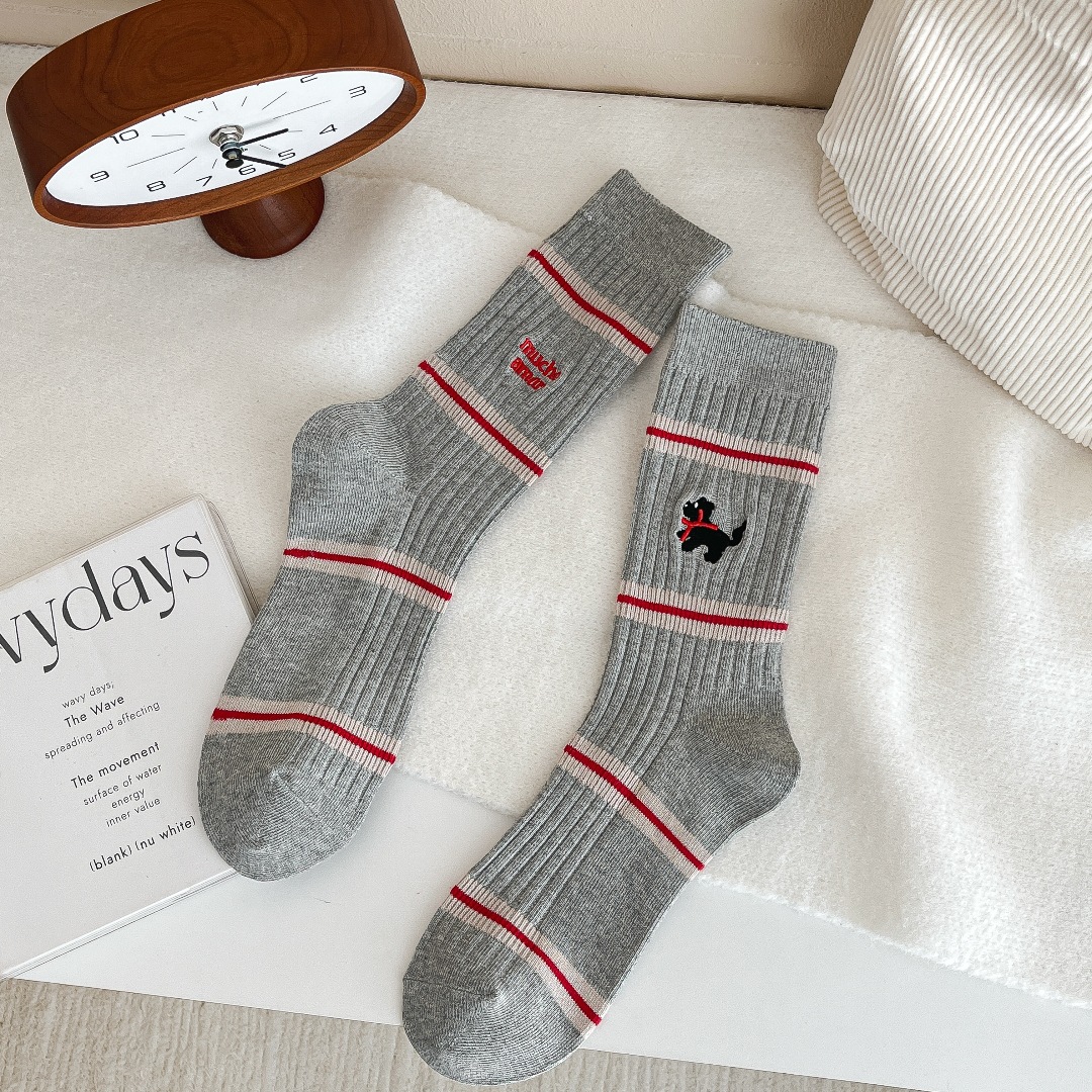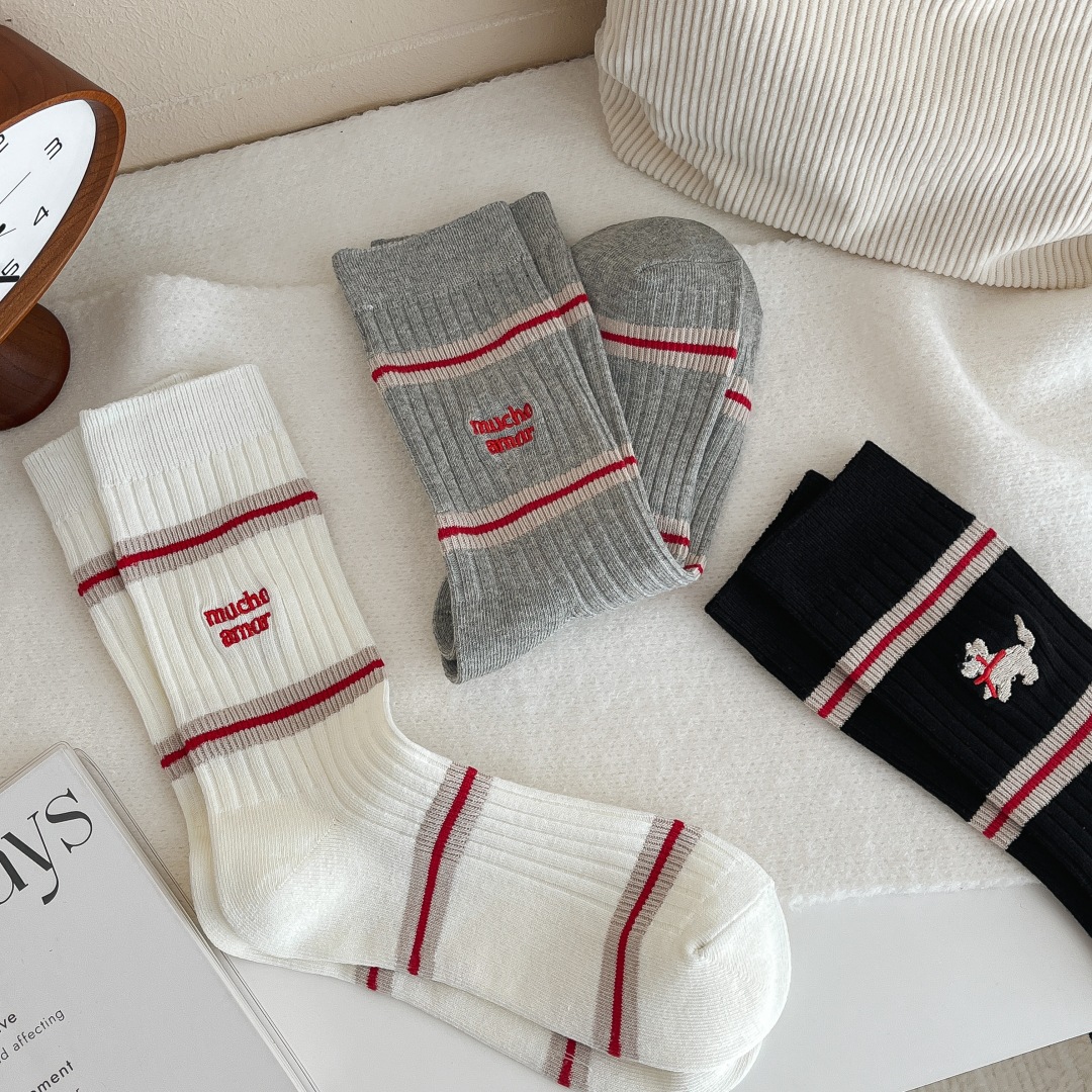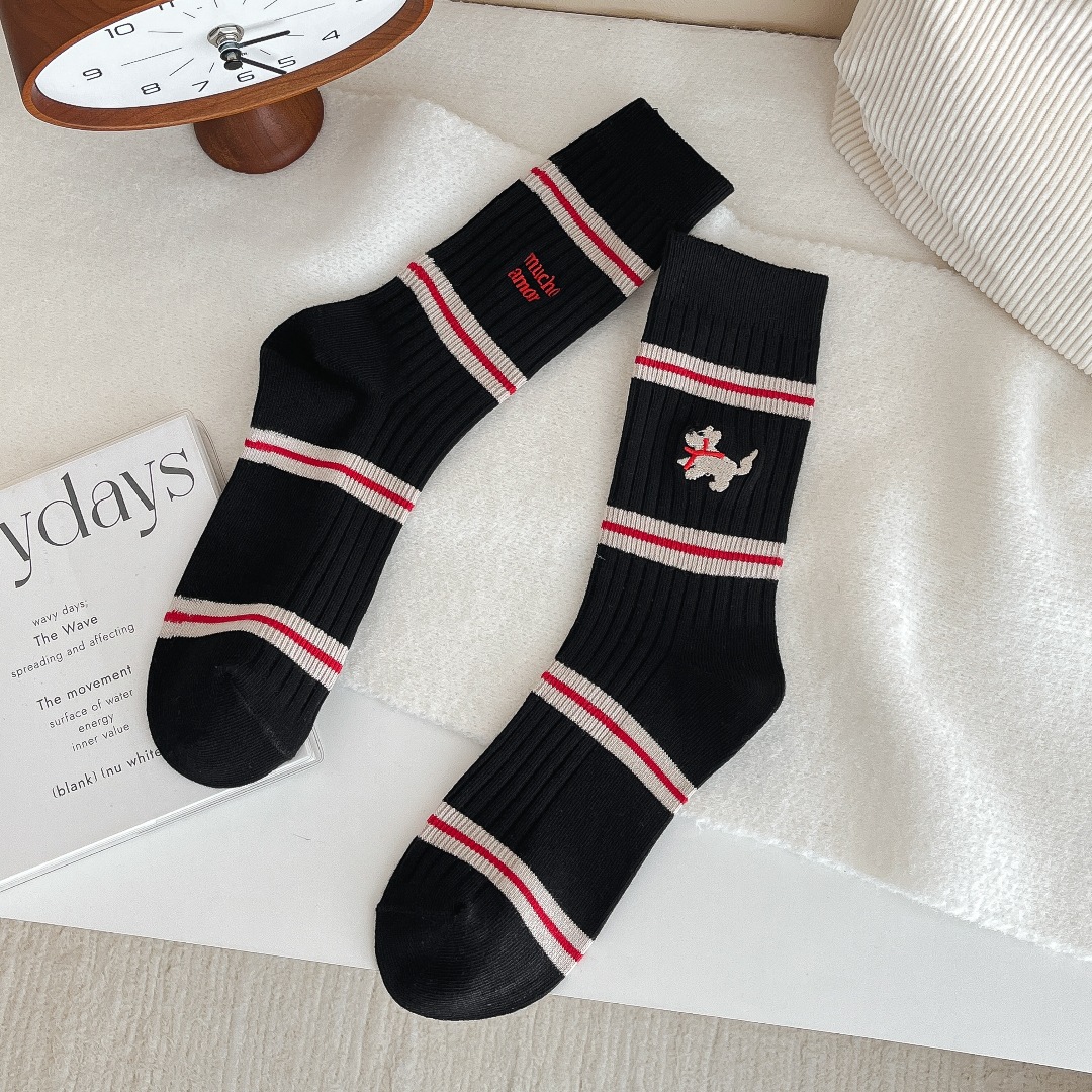 흰색 양말 여성의 가을과 겨울, 트렌디 한 튜브 양말 귀여운 강아지 자수 줄무늬 학술 스타일 스타킹 면화