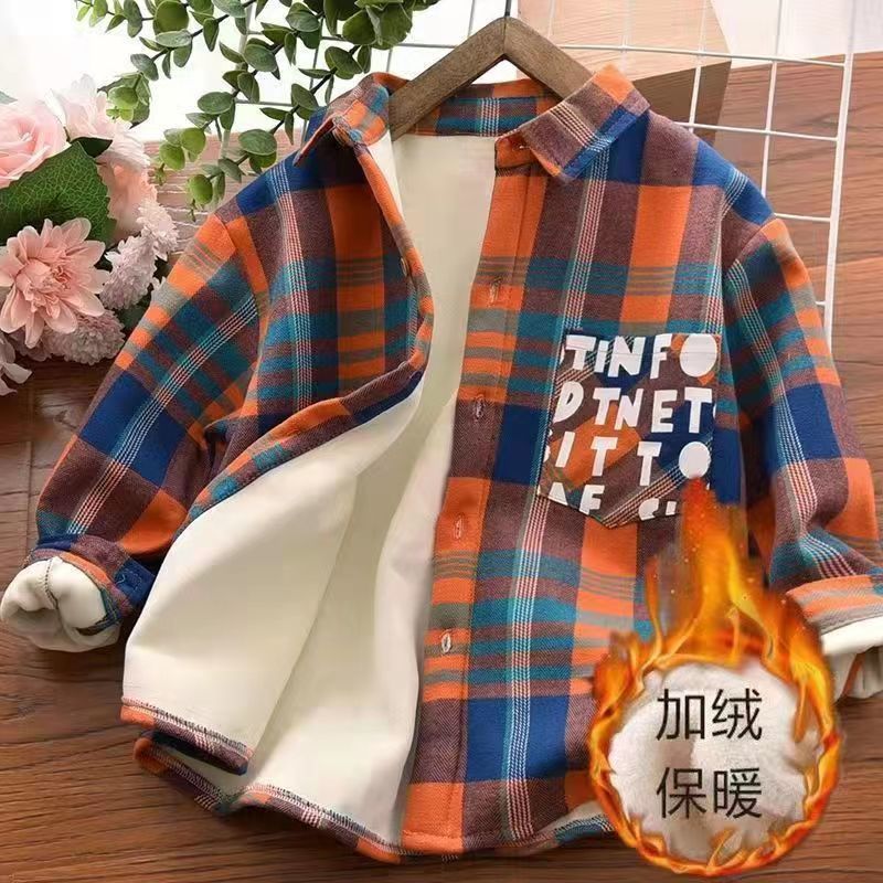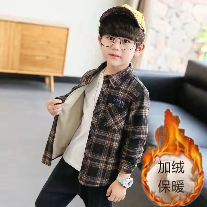 남학생 기모 셔츠 2024 신형 서양식 중대형 어린이 원피스 벨벳 겨울 아동복 한국식 어린이 격자 무늬 셔츠스토어 가기