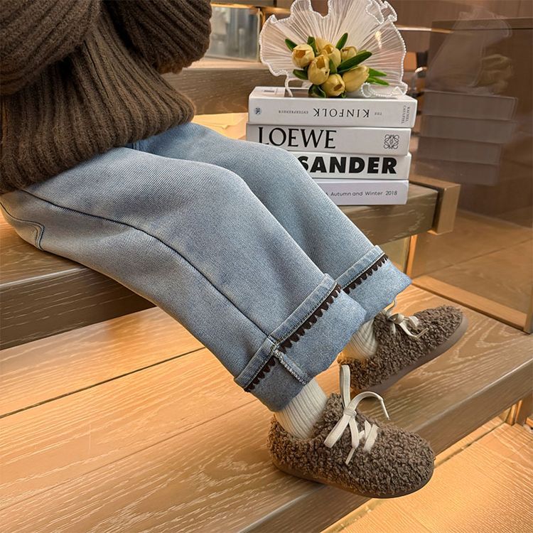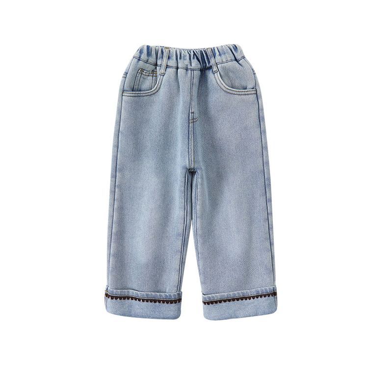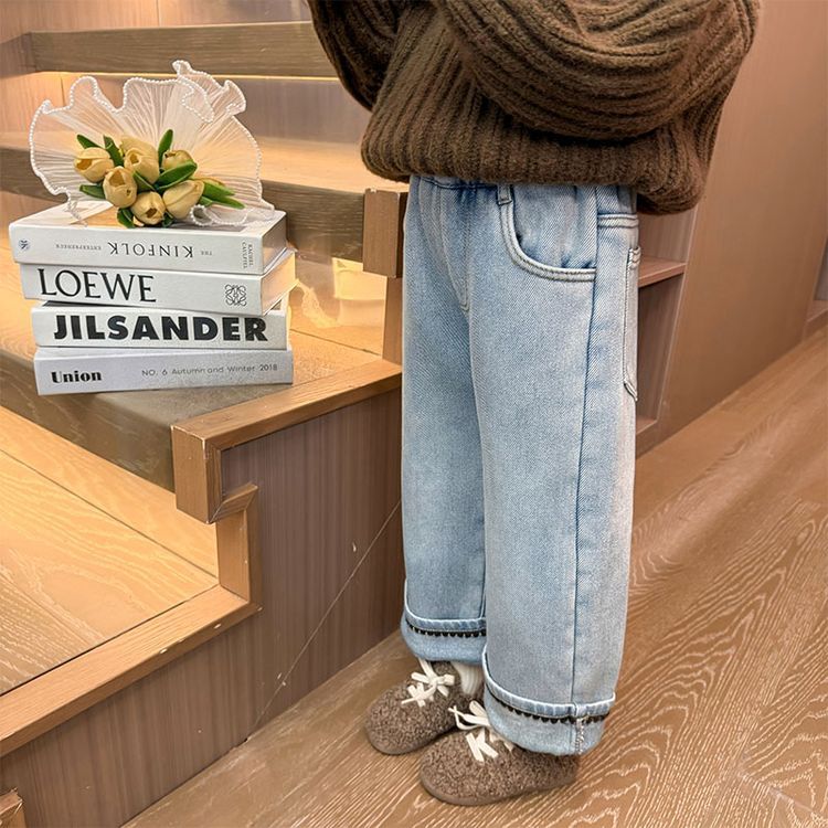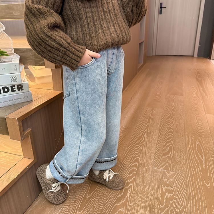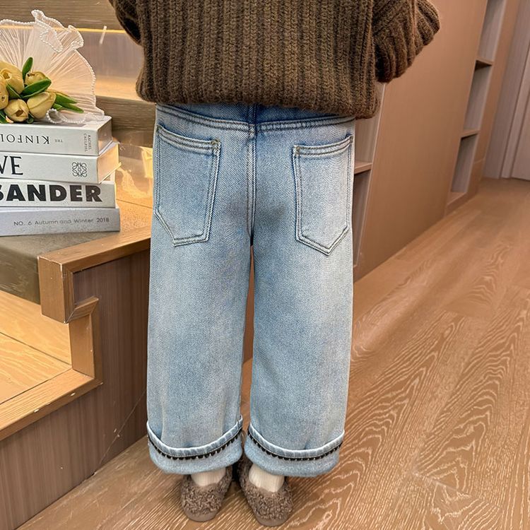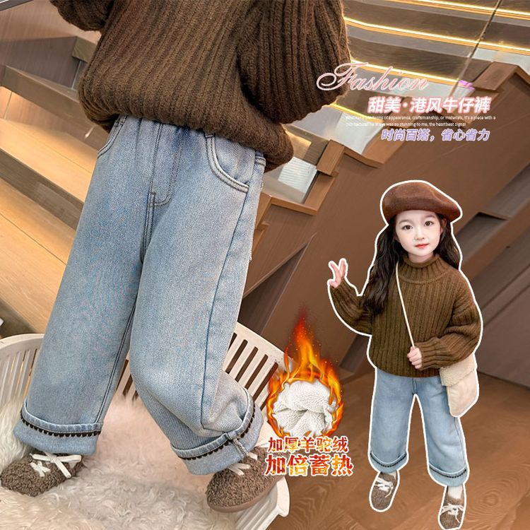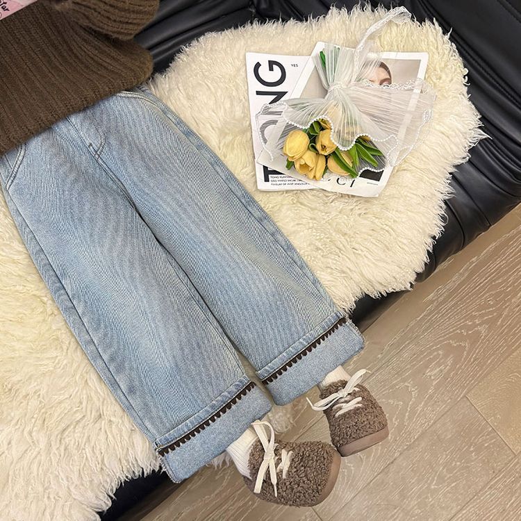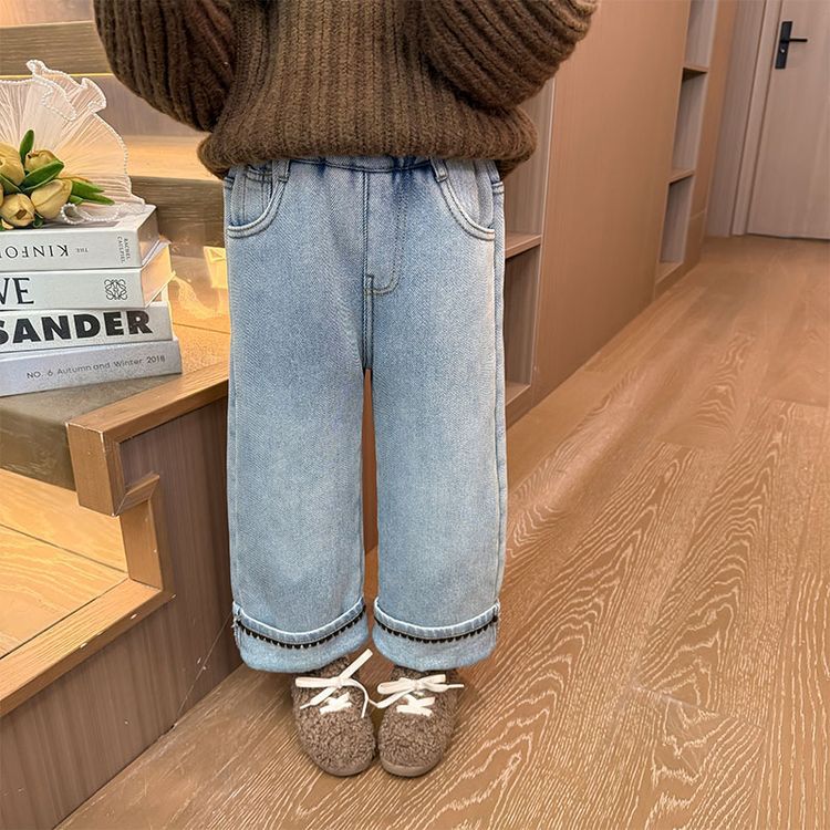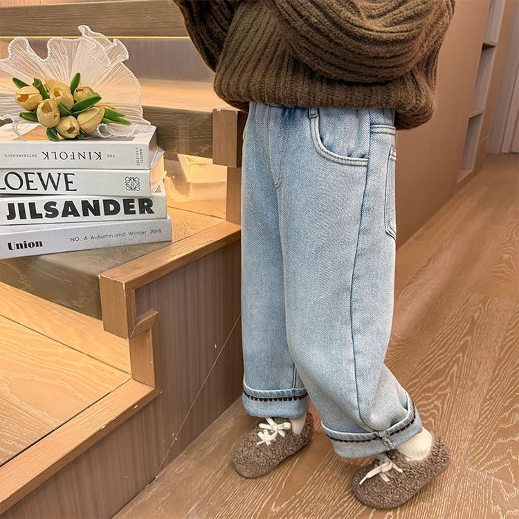 여아용 기모 바지 가을 겨울 2025 신상 아동 겨울 청바지 두꺼운 중소형 어린이용 스트레이트 와이드 팬츠