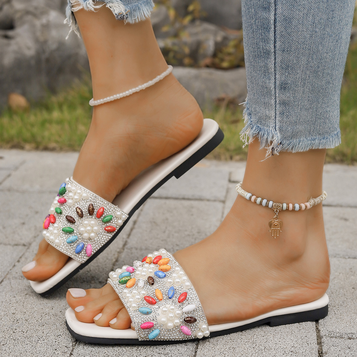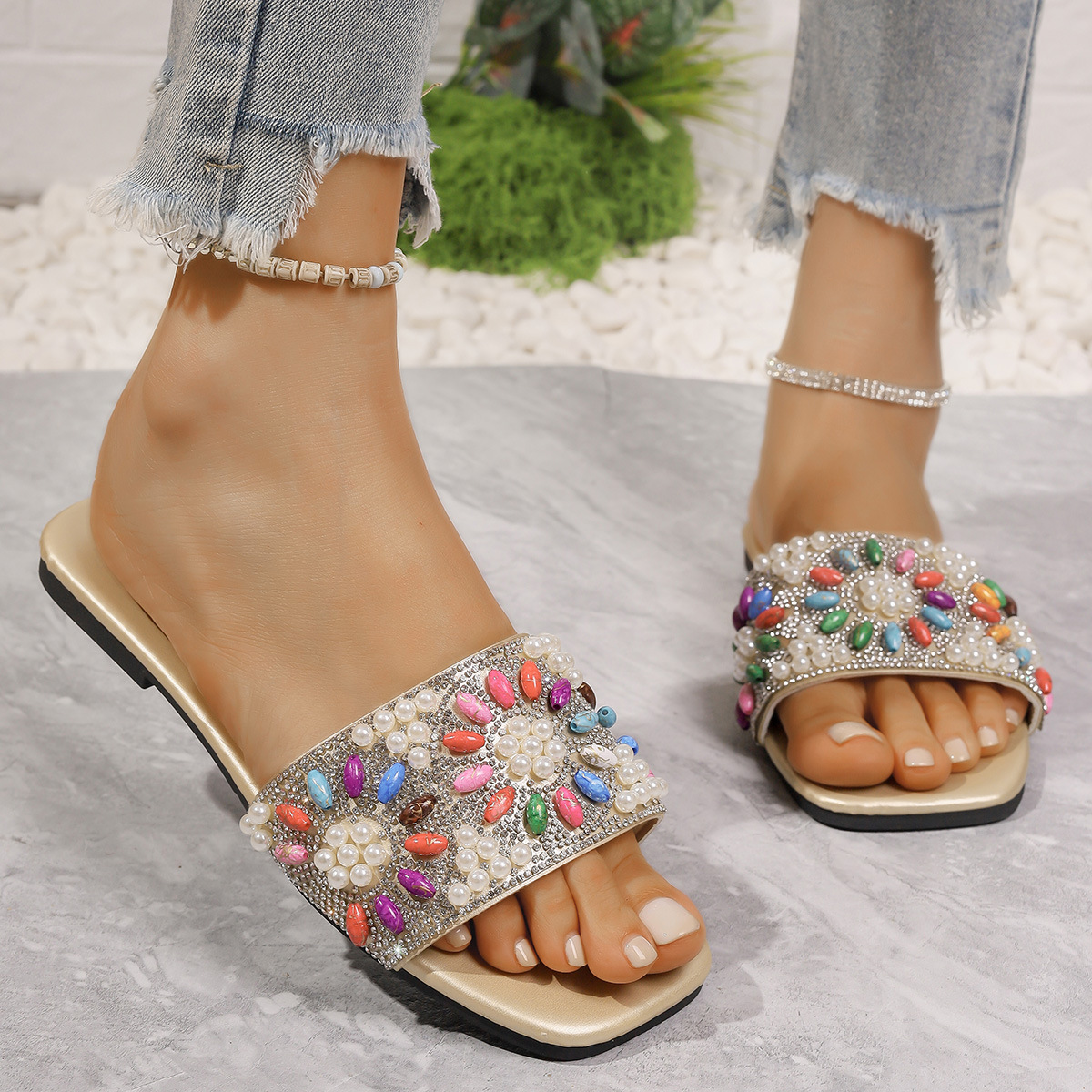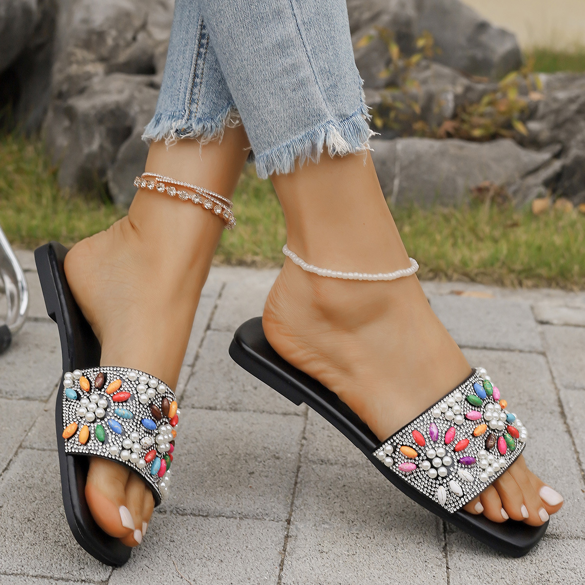 2024 여름 새로운 유럽과 미국의 대외 무역 플러스 사이즈 평면 사각형 모조 다이아몬드 슬리퍼 여성 한 단어 비치 샌들 도매
