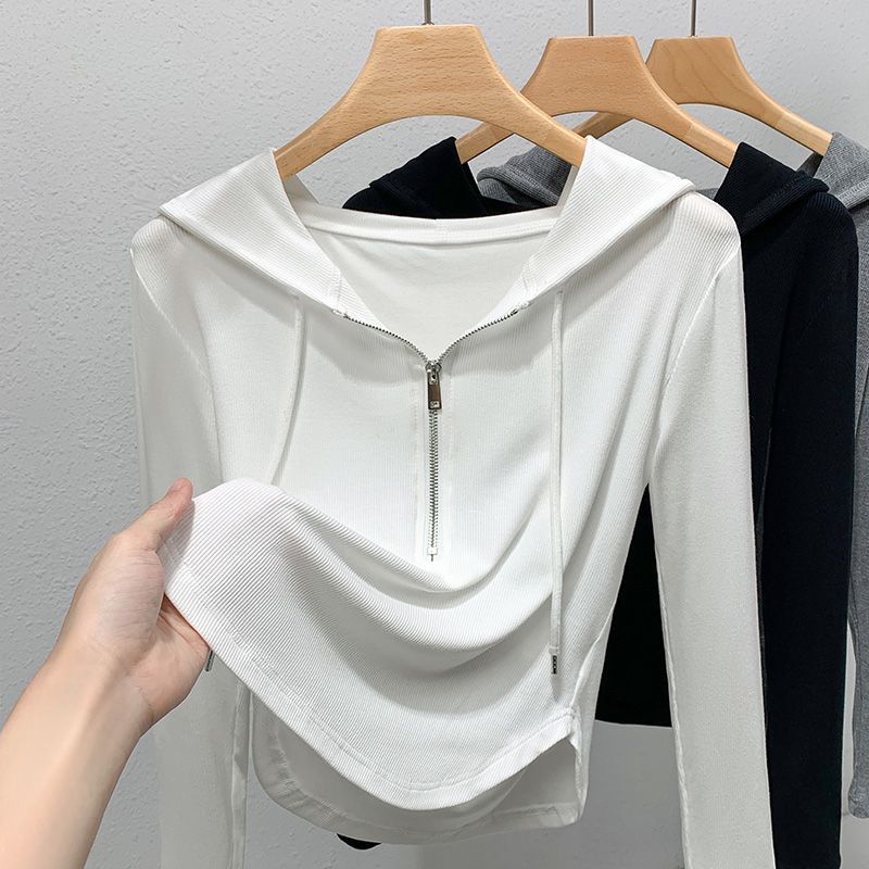 회색 슬림 핏 후드 티셔츠 여성용 2024 새로운 스타일 뜨거운 가을 스레드베이스 셔츠 하프 지퍼 후드 탑