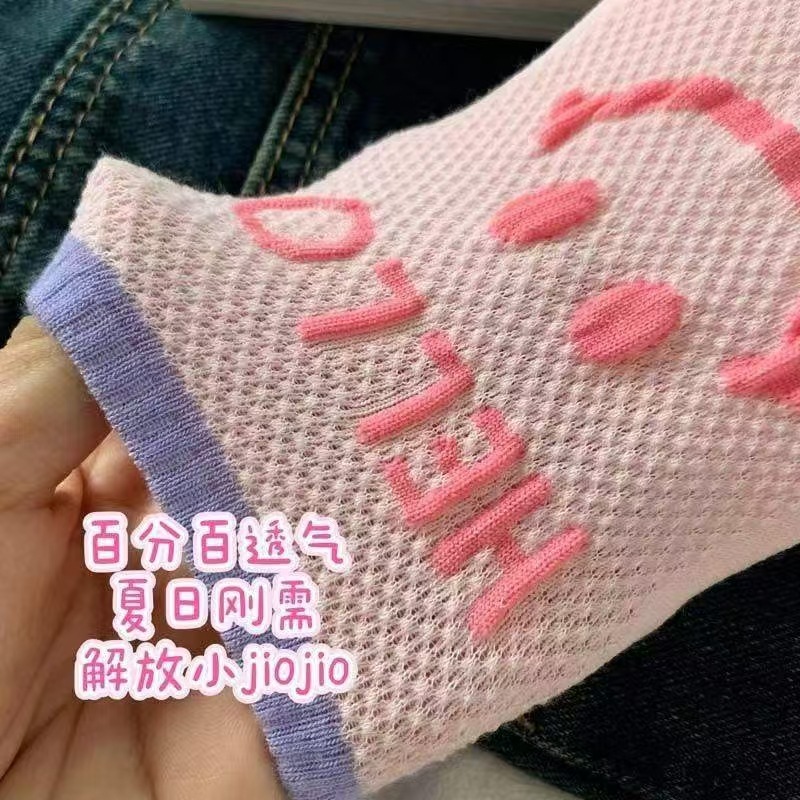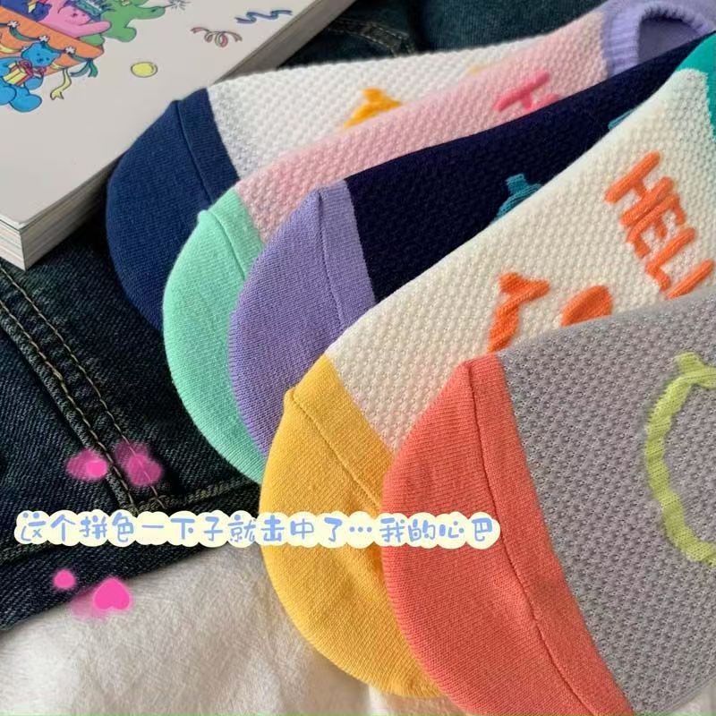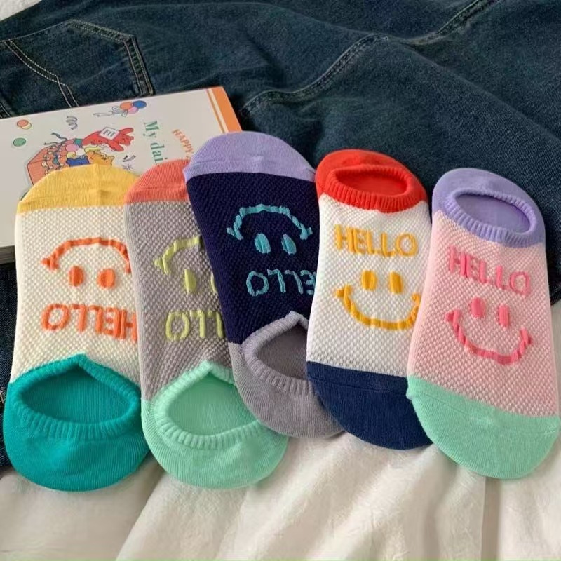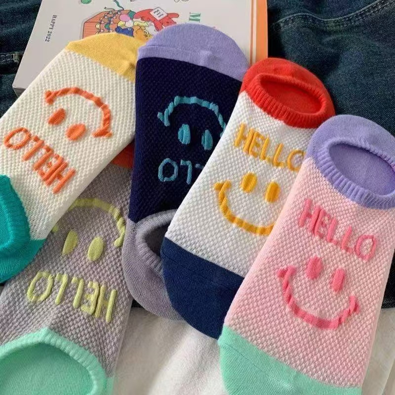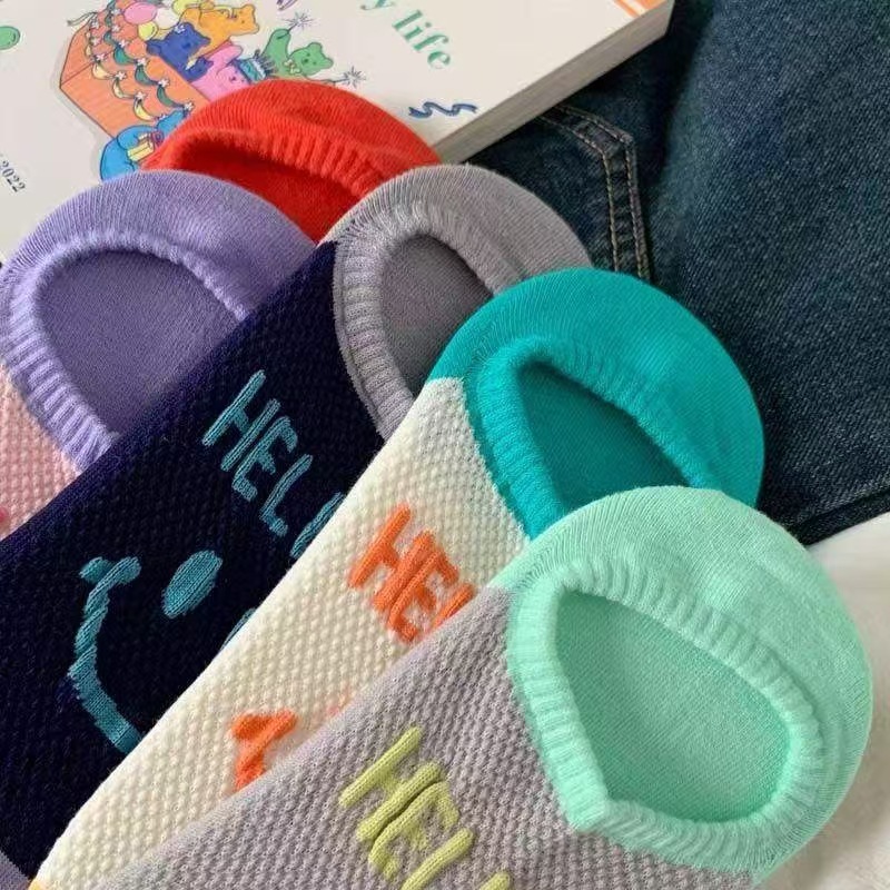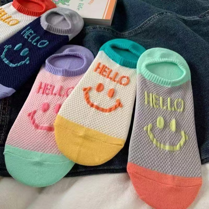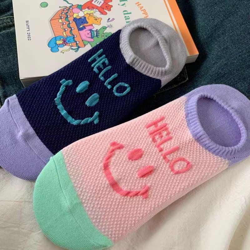 통기성 미끄럼 방지 보트 양말 여성은 신선한 패션 메쉬로 떨어지지 않습니다 안녕하세요 영어 웃는 얼굴 보이지 않는 양말 여성 여름