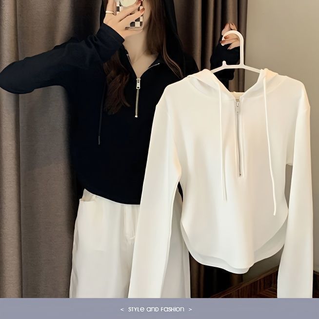 반 지퍼 후드 긴팔 티셔츠 여성의 2024 년 봄과 가을 새로운 백베이스 셔츠 내부 슬림 셔츠