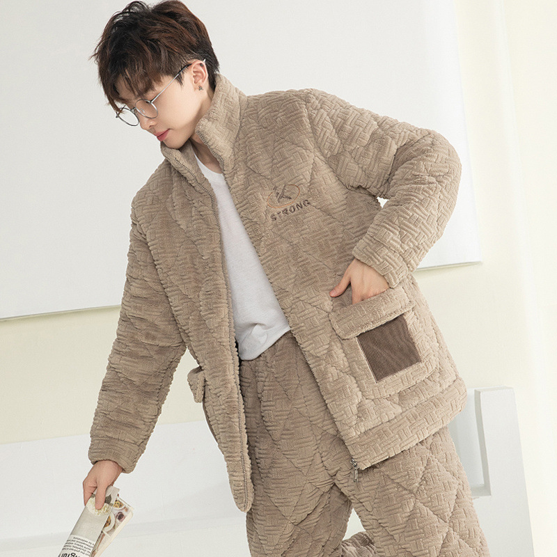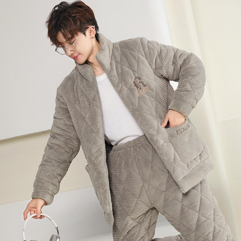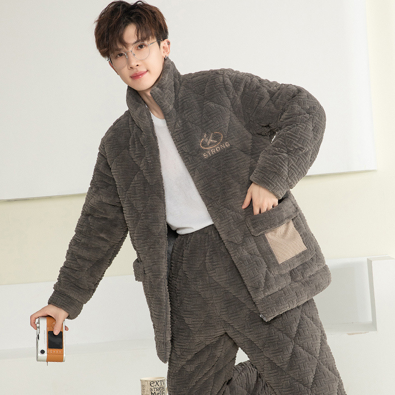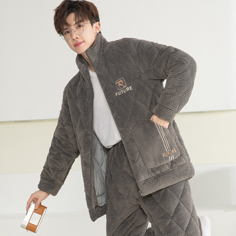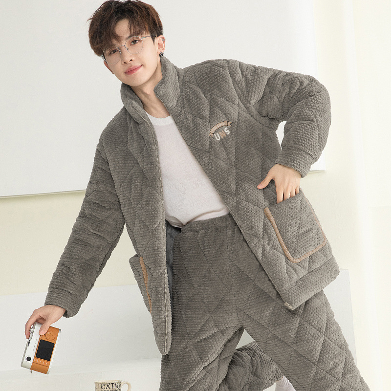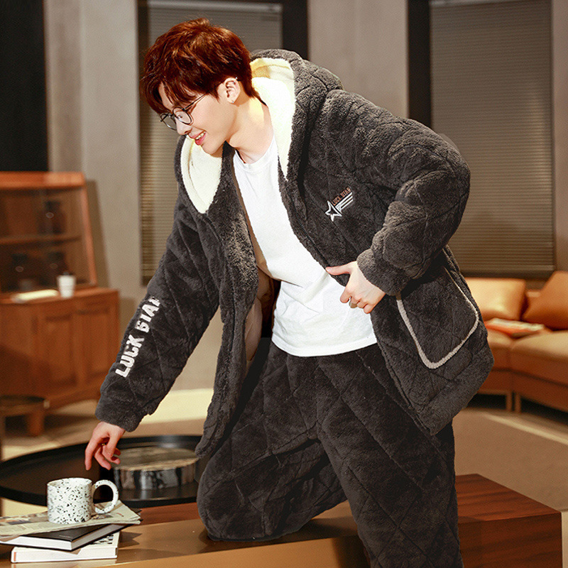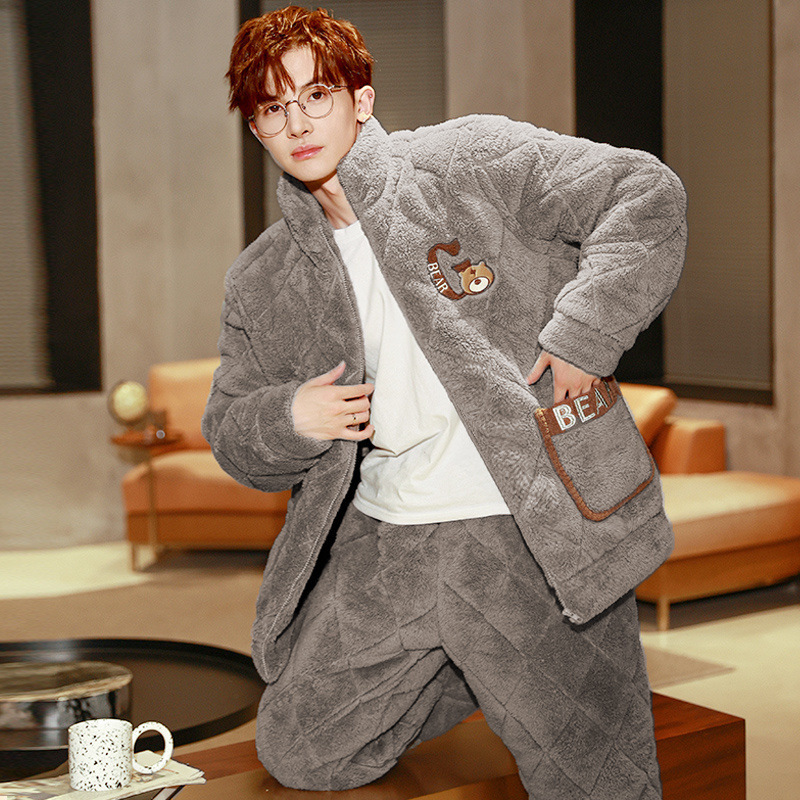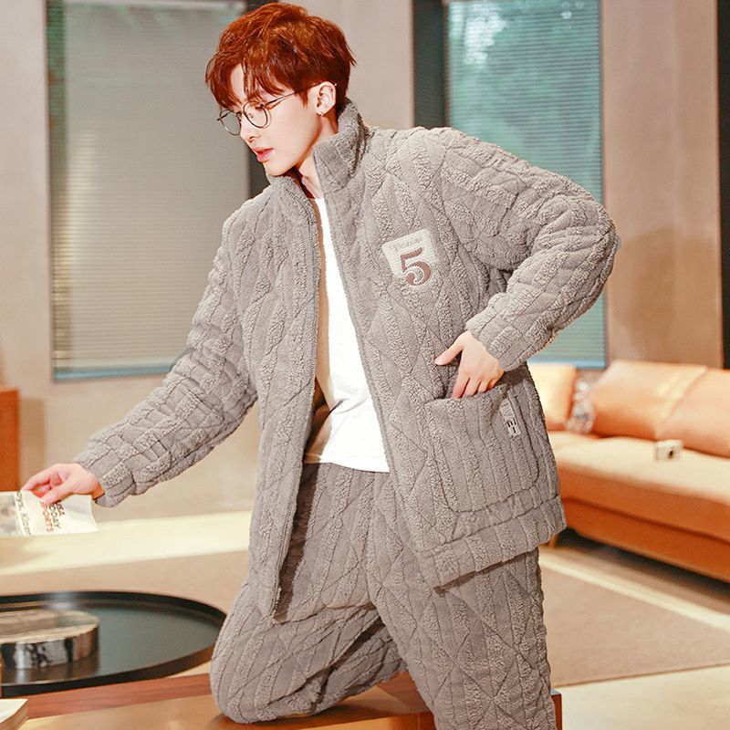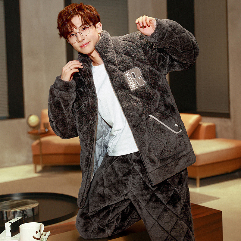 잠옷 남자의 가을과 겨울 두꺼운 기모 산호 양털 3 층 면화 자켓 남자의 겨울 슈퍼 두꺼운 따뜻한 집 옷
