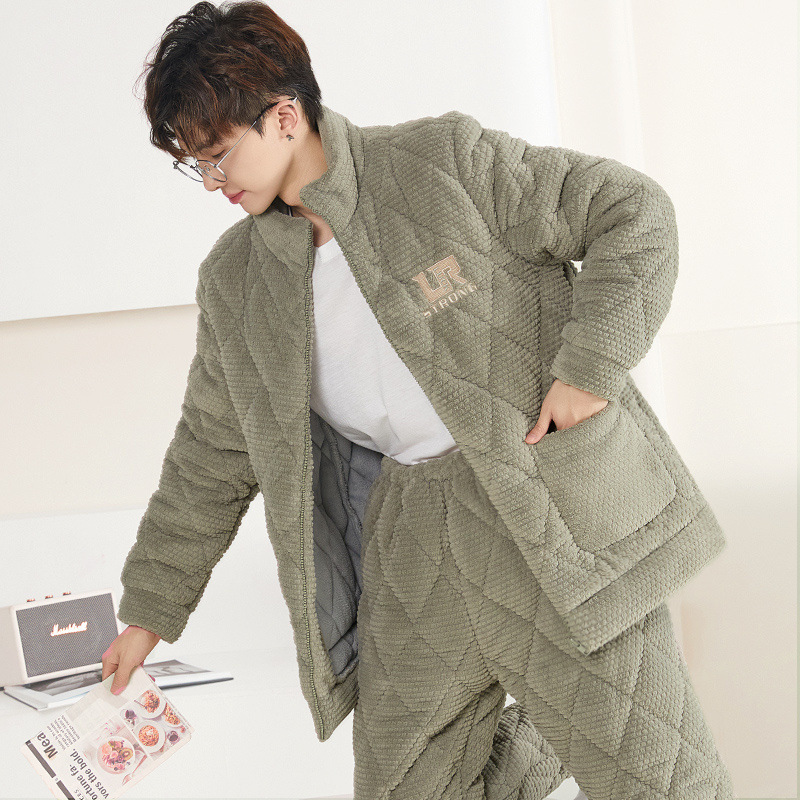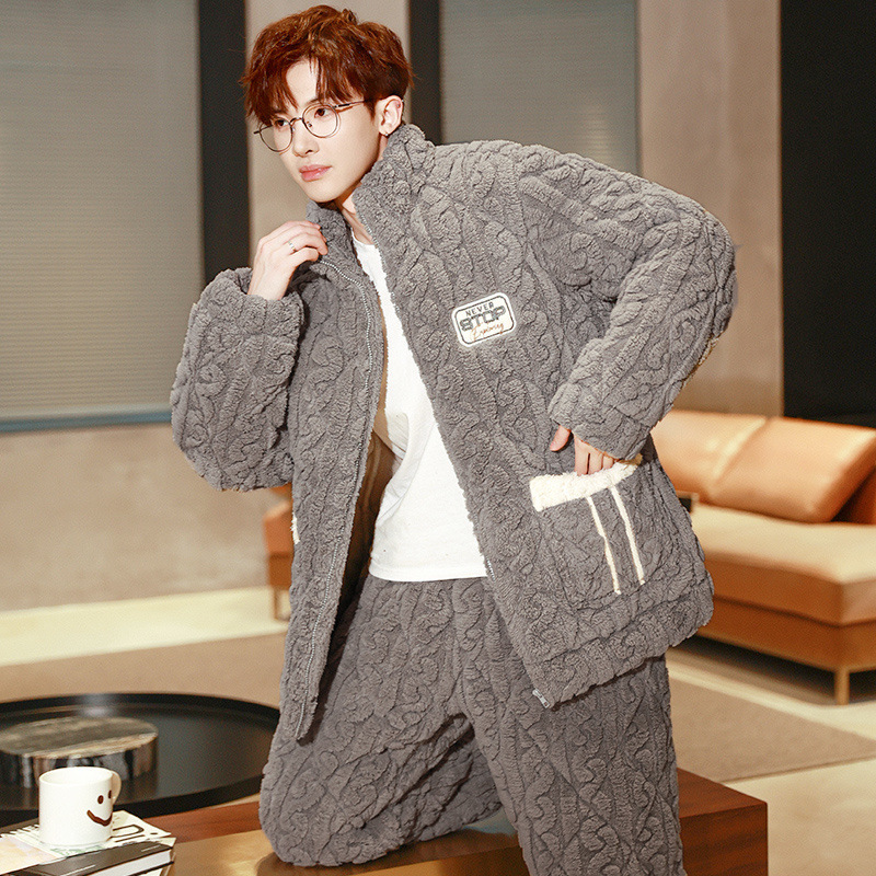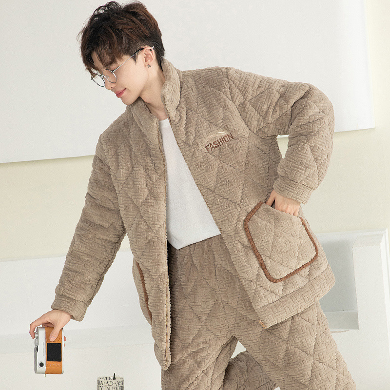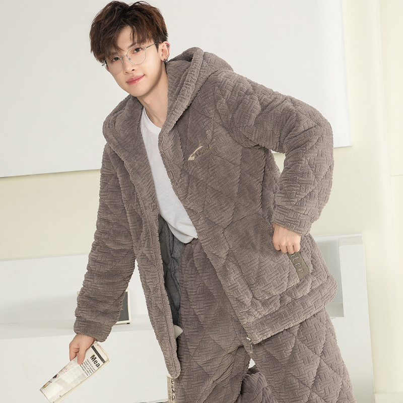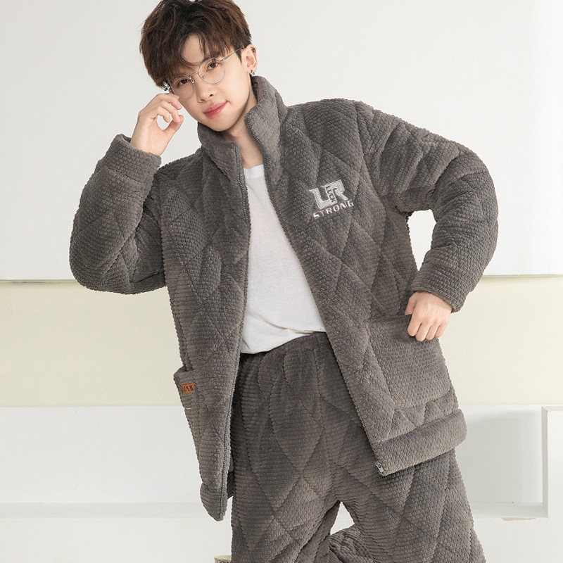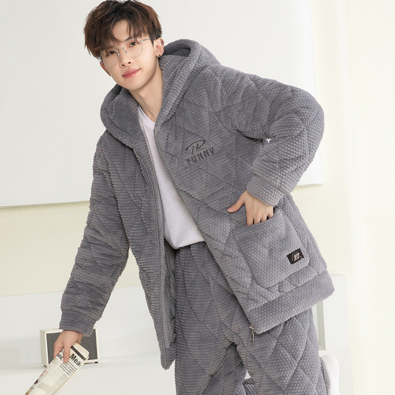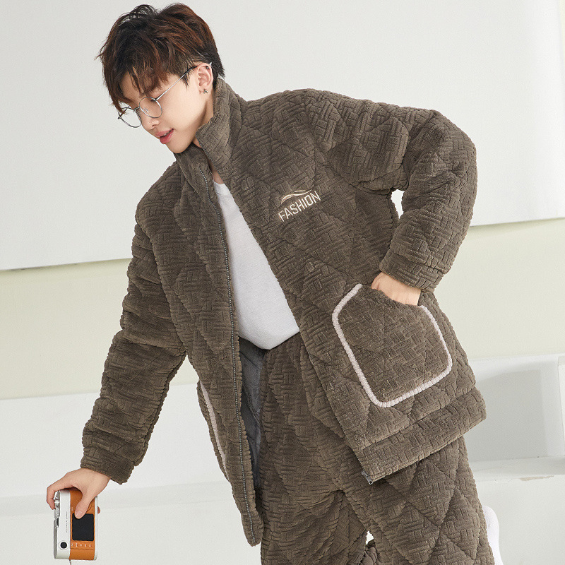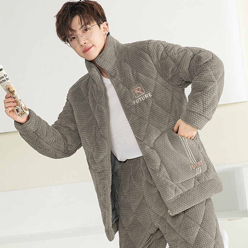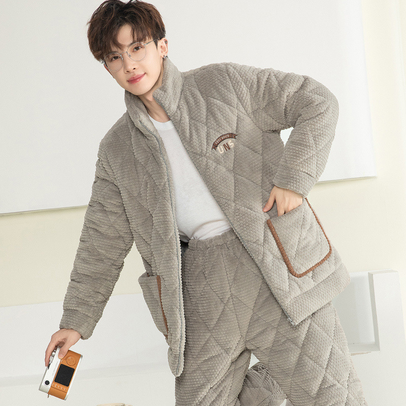잠옷 남자의 가을과 겨울 두꺼운 기모 산호 양털 3 층 면화 자켓 남자의 겨울 슈퍼 두꺼운 따뜻한 집 옷