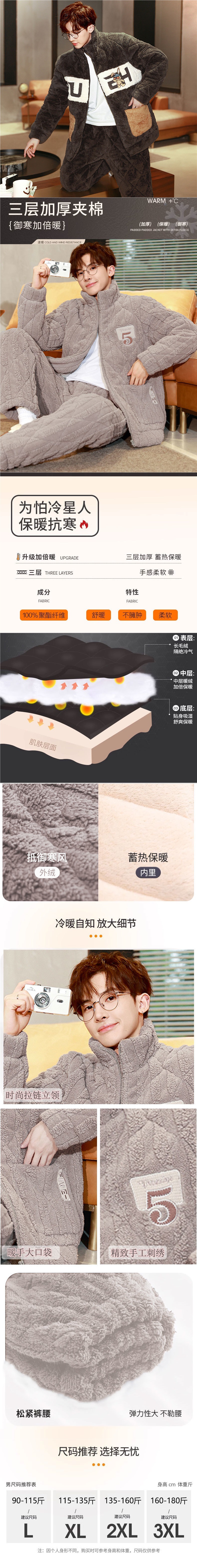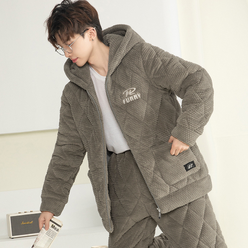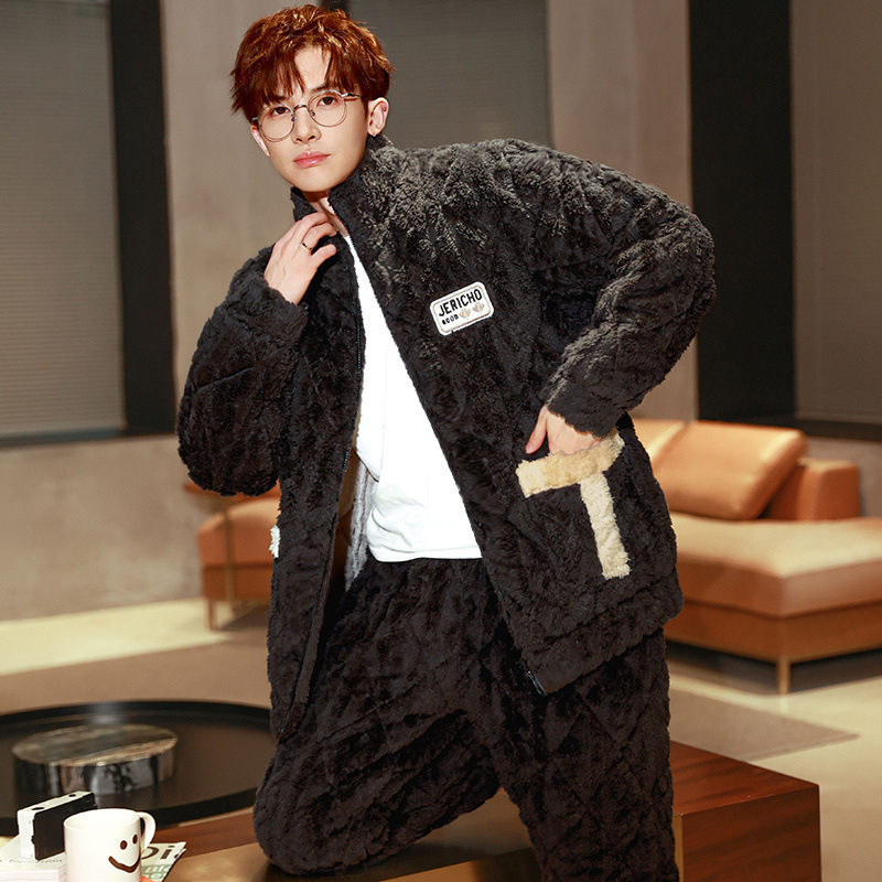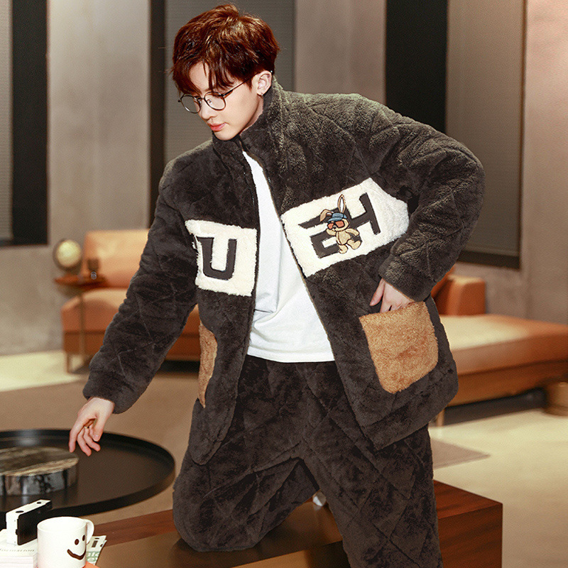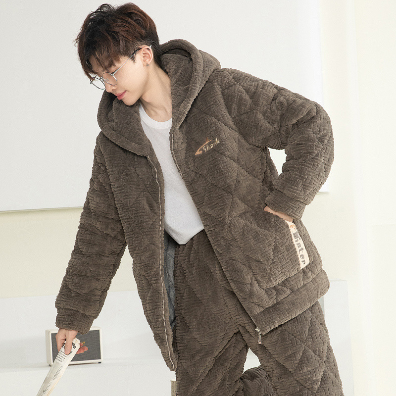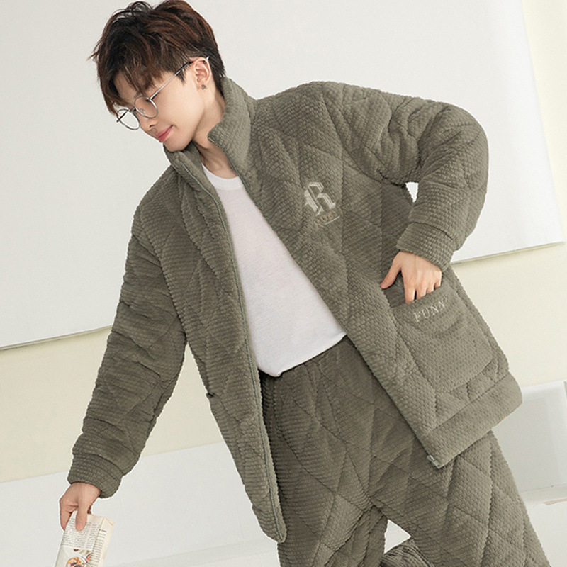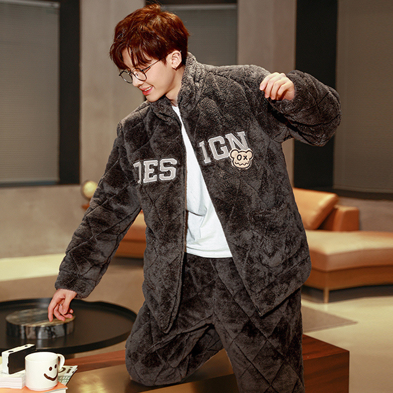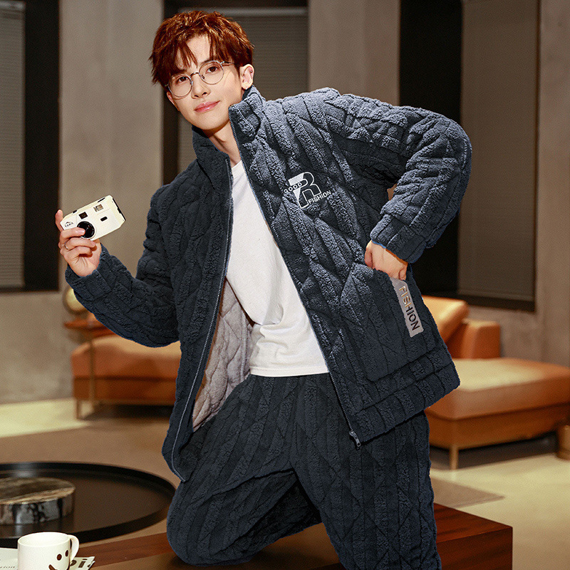 잠옷 남자의 가을과 겨울 두꺼운 기모 산호 양털 3 층 면화 자켓 남자의 겨울 슈퍼 두꺼운 따뜻한 집 옷