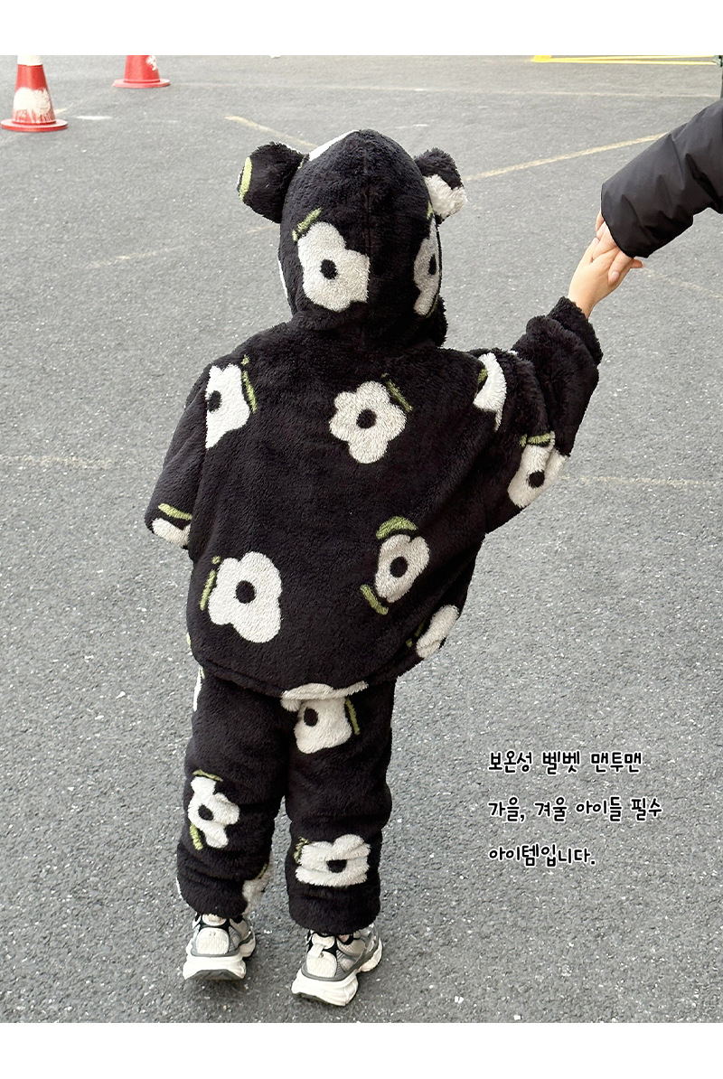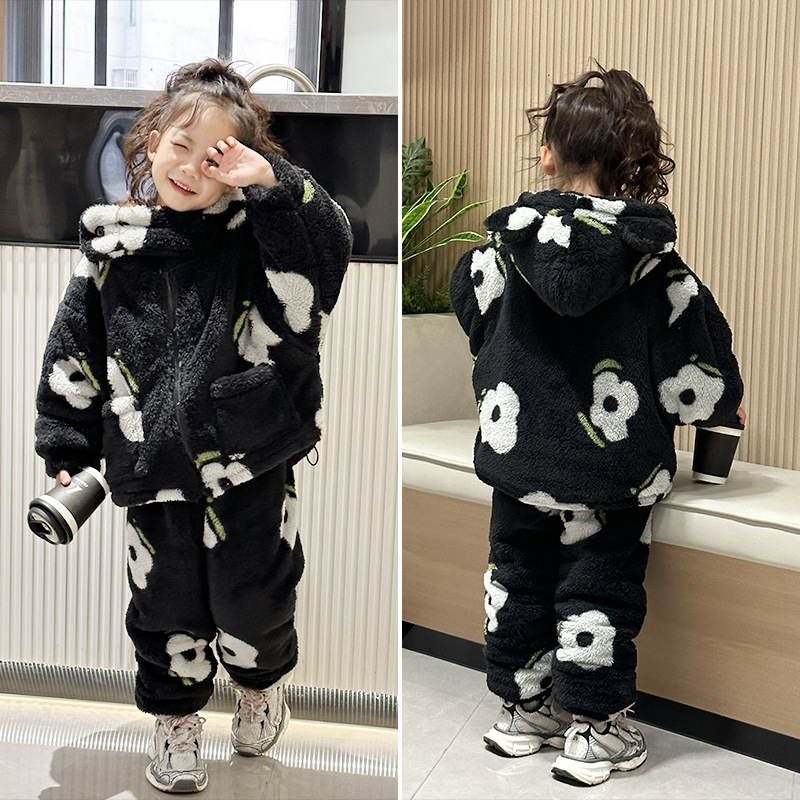 2024 가을과 겨울 흑백 어린이 기모 두꺼운 따뜻한 세트 2 피스 도매 소녀 홈 의류 세트