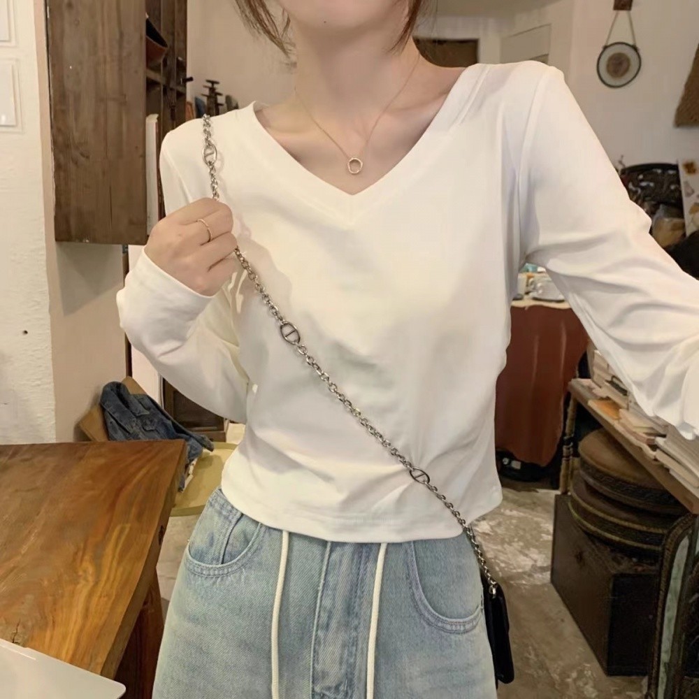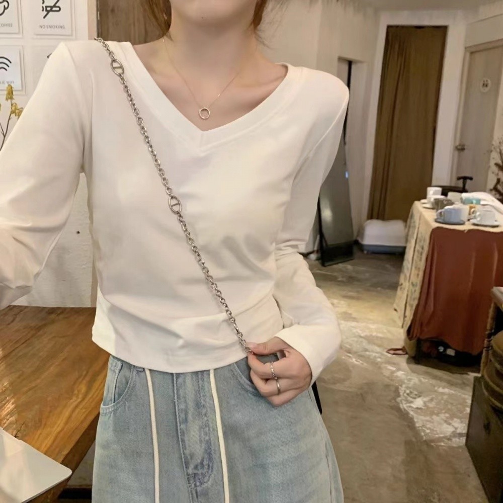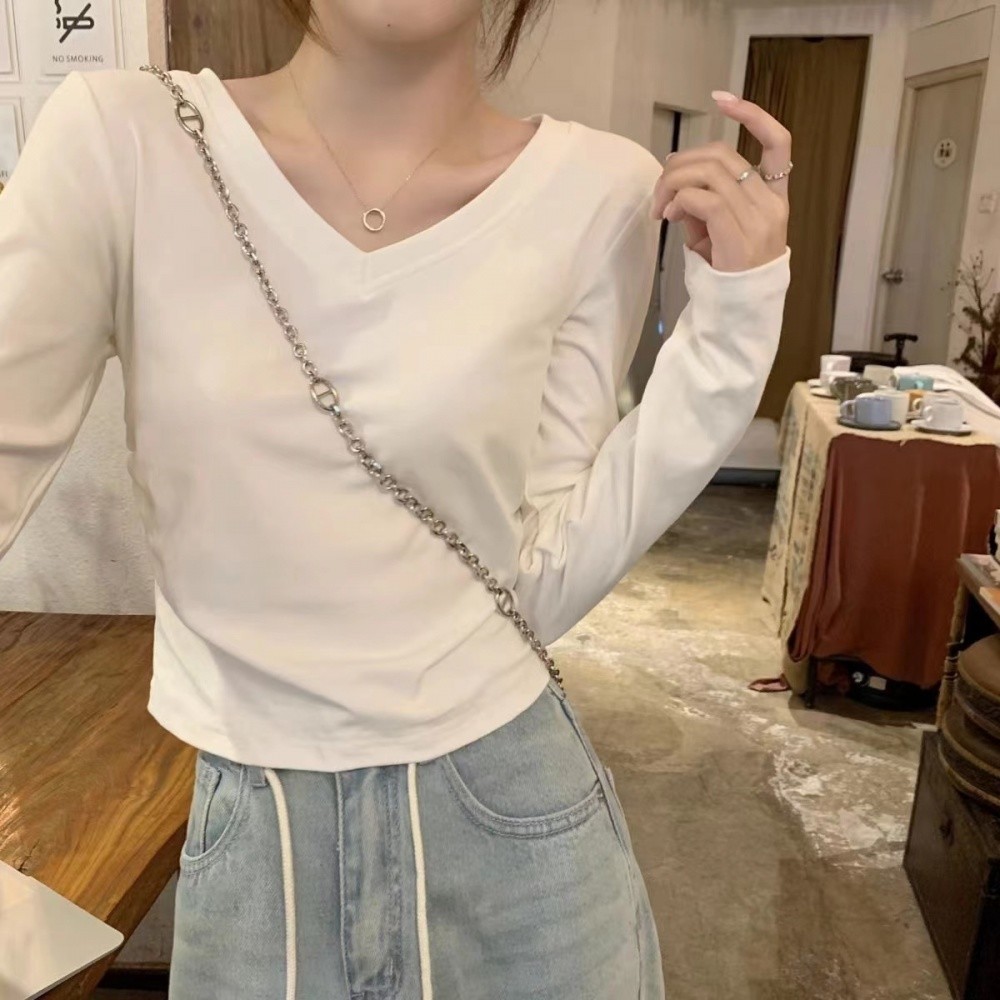 가을 겨울 여성용 솔리드 컬러 브이넥 퓨어 러스티 숄더 밑단 셔츠, 허리 슬리밍, 독일 벨벳 캐주얼 탑, 긴팔 이너 티셔츠스토어 가기