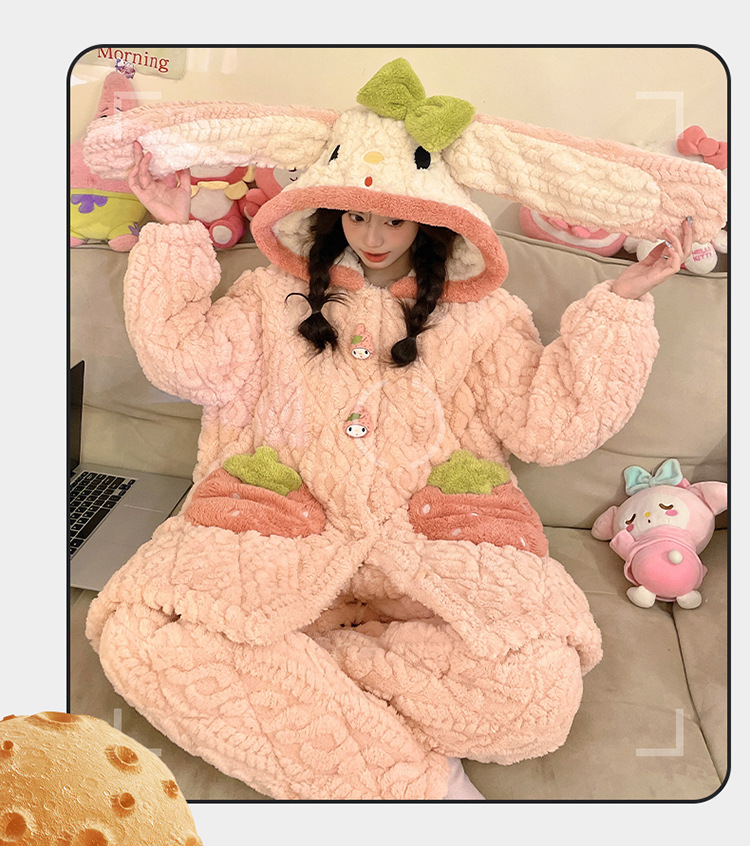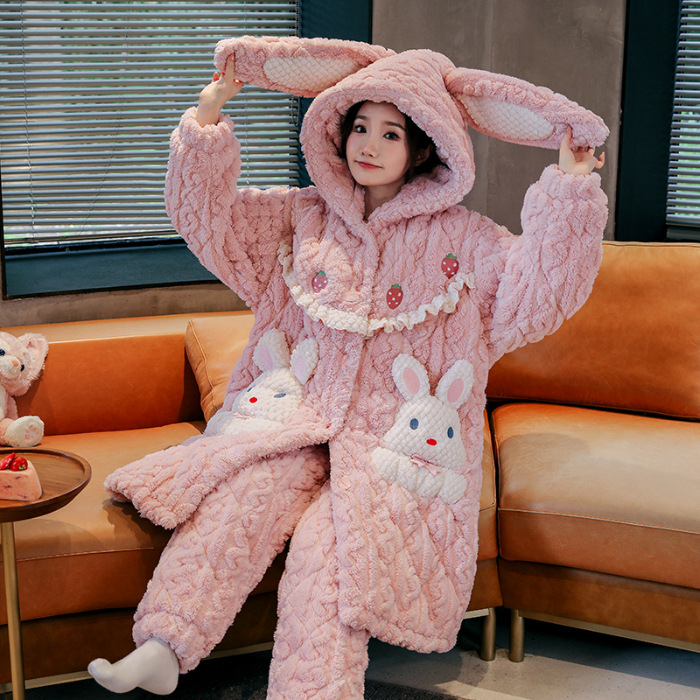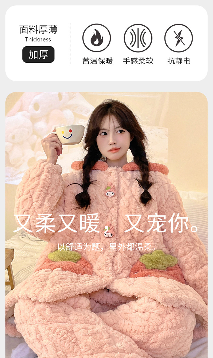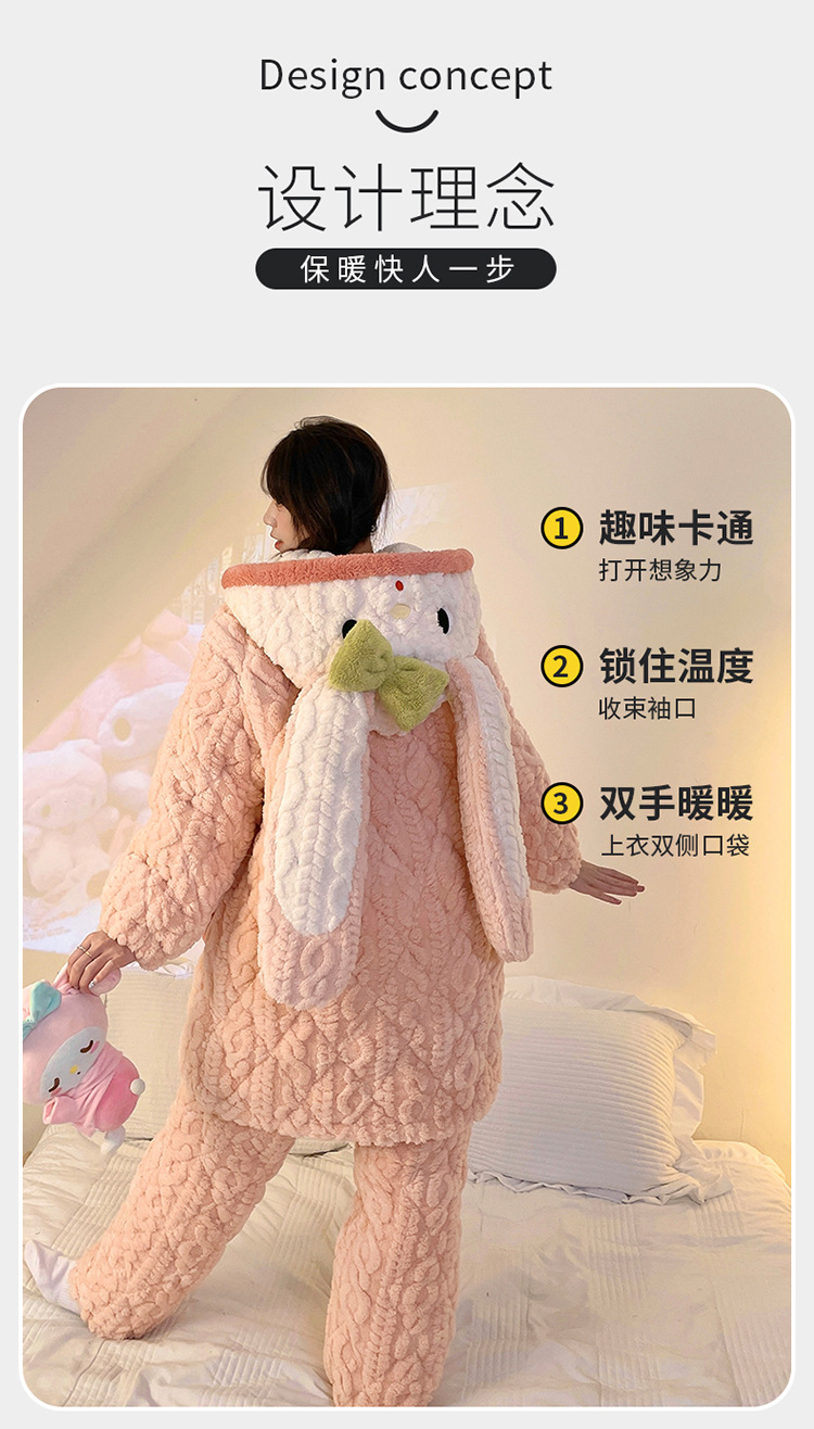 睡衣女冬款加厚女士睡衣粉色家居服女夹棉睡衣可爱保暖绒家居服女