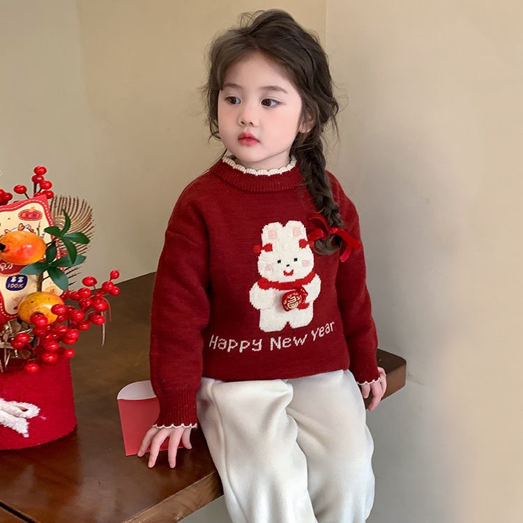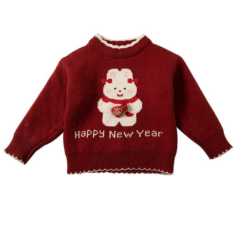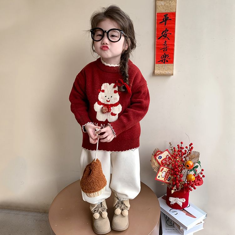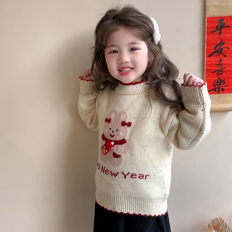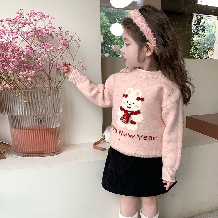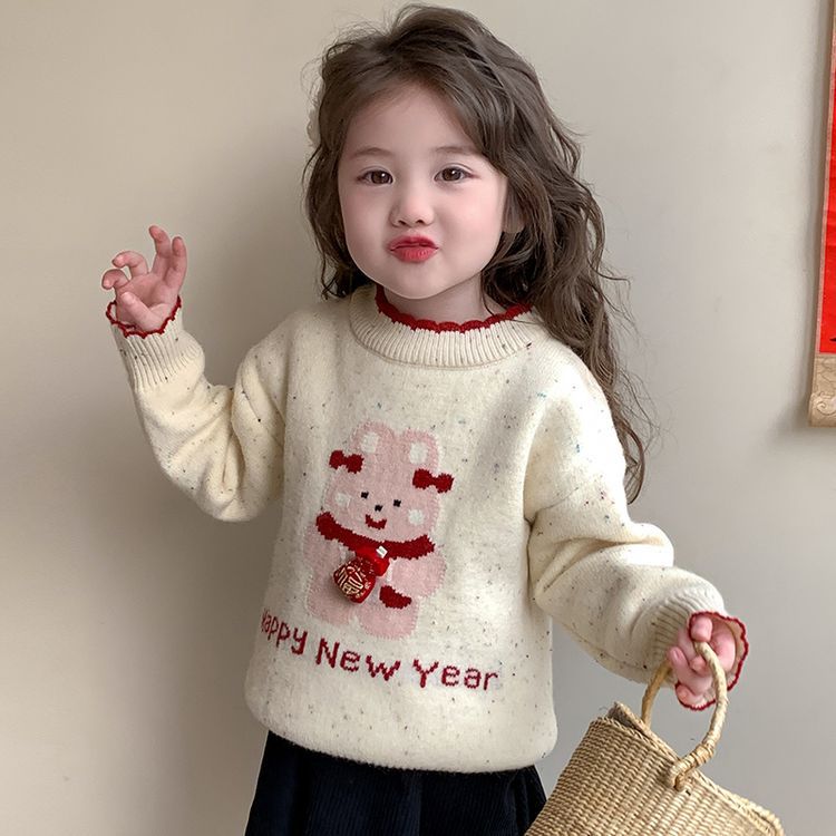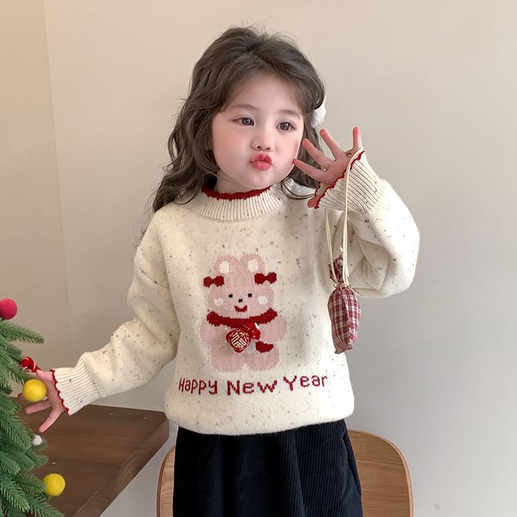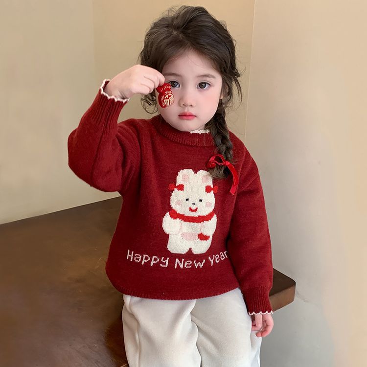 여자 스웨터 겨울 2024 새로운 어린이 크리스마스 겨울 착용 아기 소녀 붉은 새해 두꺼운 니트베이스 셔츠