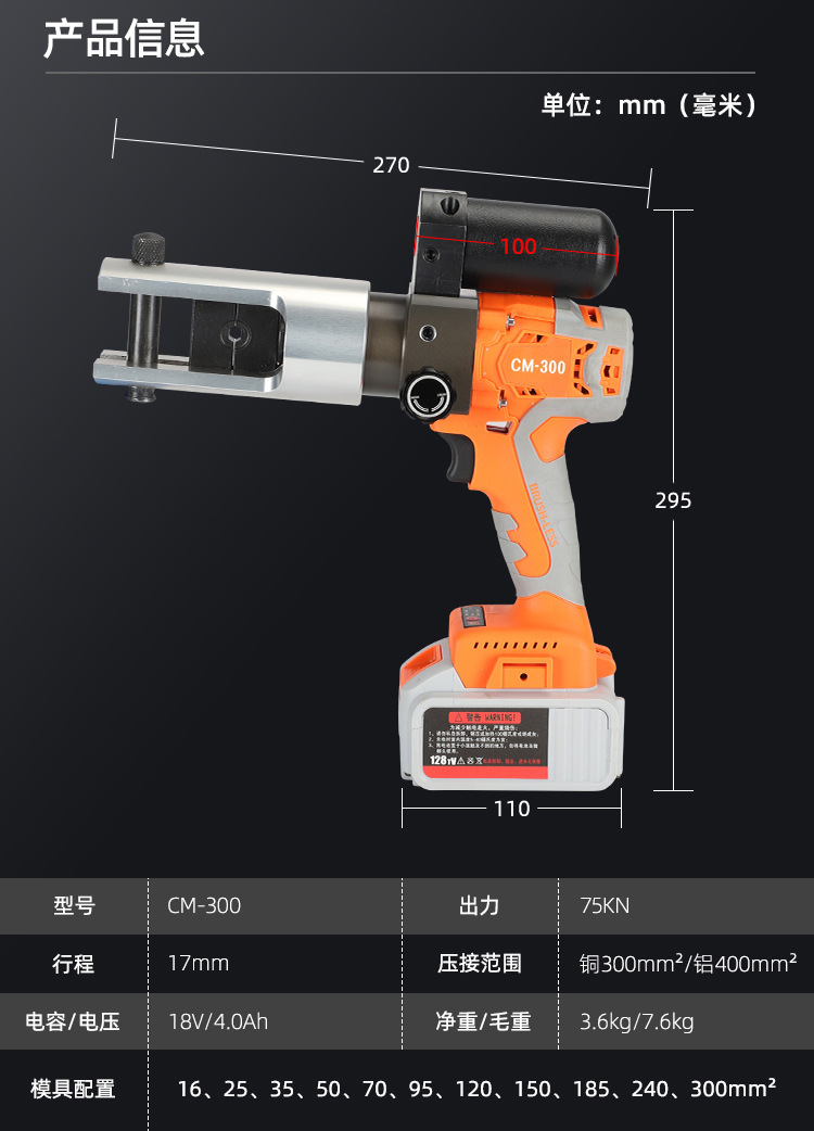 • [브러시리스 모터] 4.0 리튬 배터리 CM300 압착 펜치/배터리 1개, 1회 충전