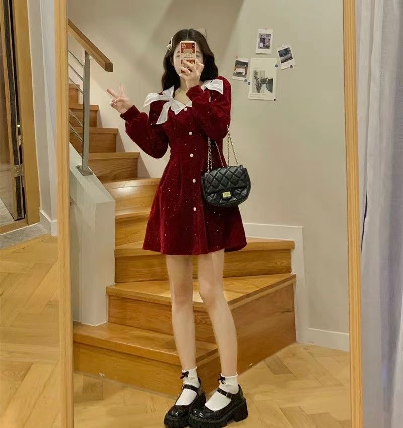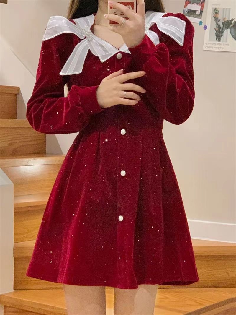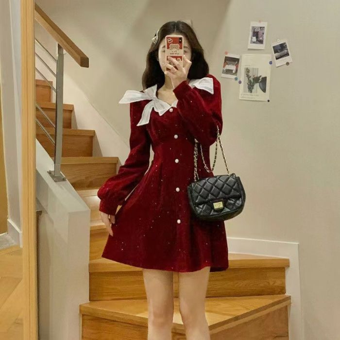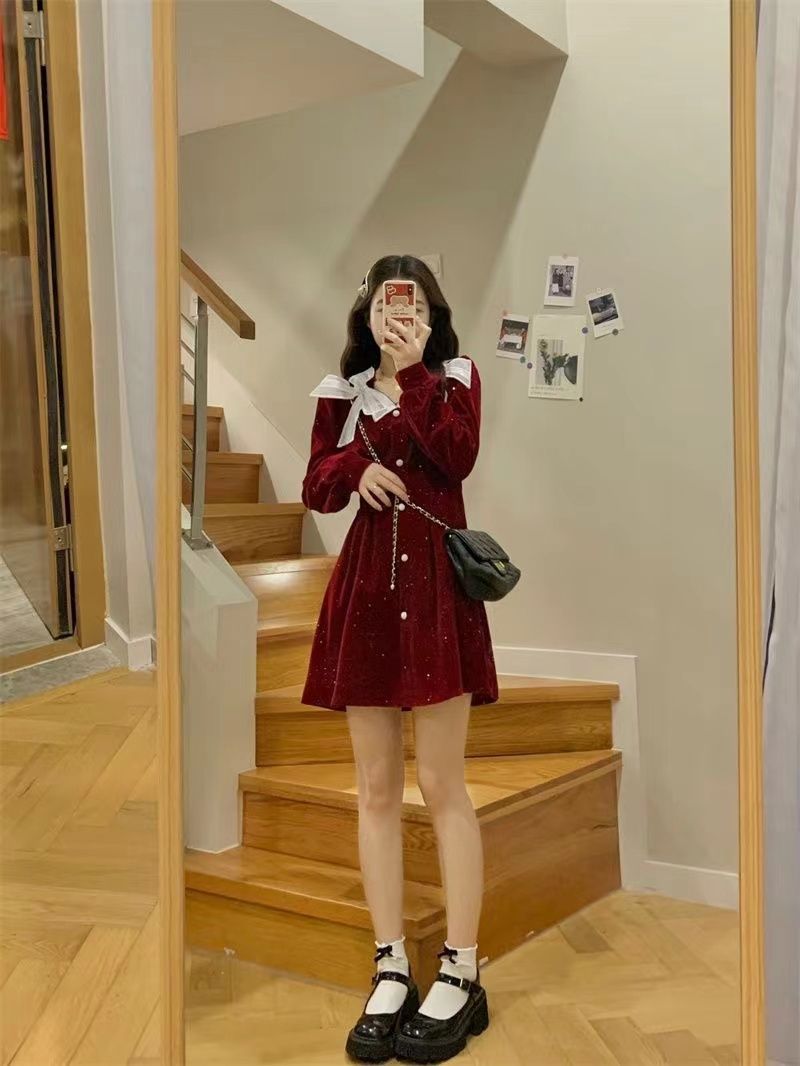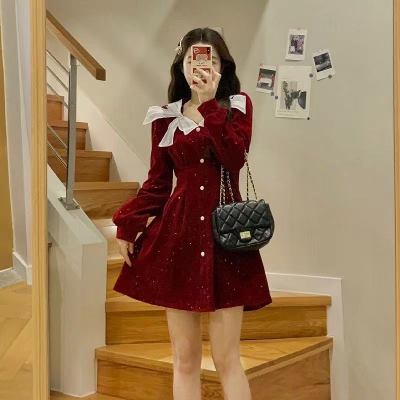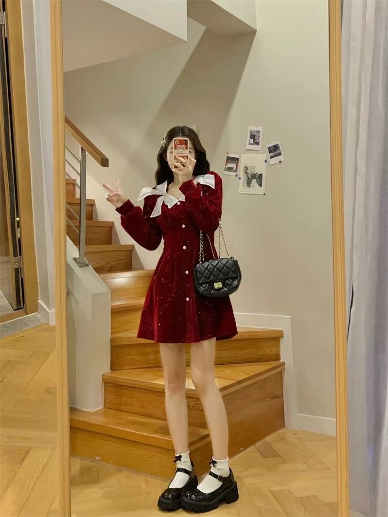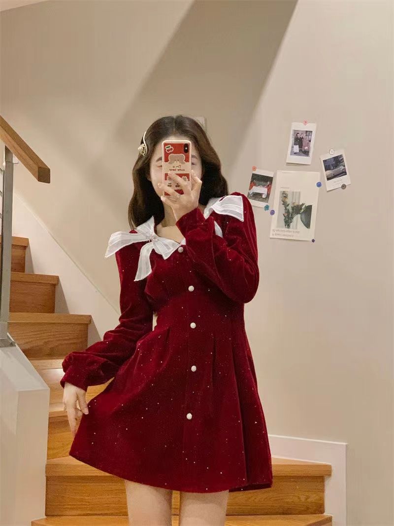 새해 분위기 붉은 황금 벨벳 원피스 여성 가을과 겨울 새로운 헵번 스타일 높은 허리 활 치마스토어 가기