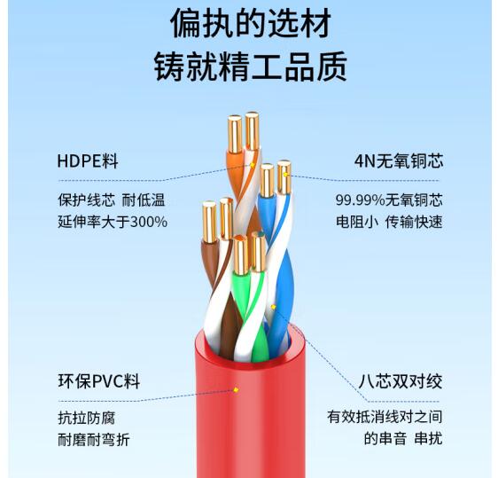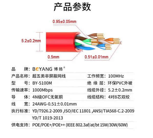 博扬 室内千兆非屏蔽超五类网线【0.51mm无氧铜】CAT5e类网络监控POE工程线双绞线 100米红色 BY-5100M*1 合格证*1