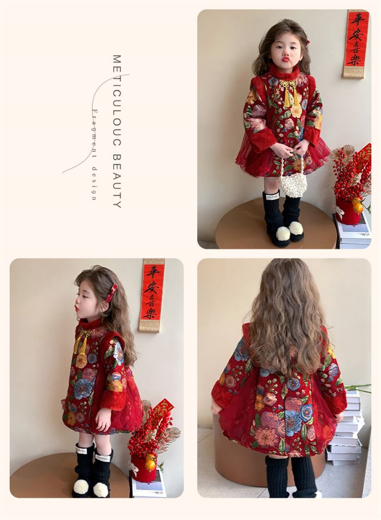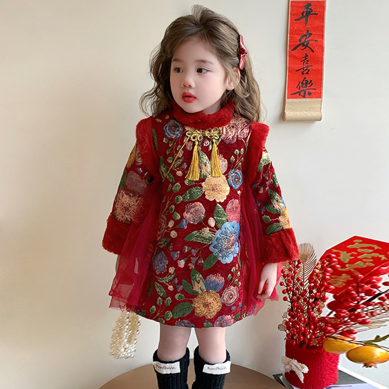 소녀들의 겨울 2024 신식 거즈 버클 청삼 신년 의류 서양식 신년 원피스 아동복 가을과 겨울스토어 가기