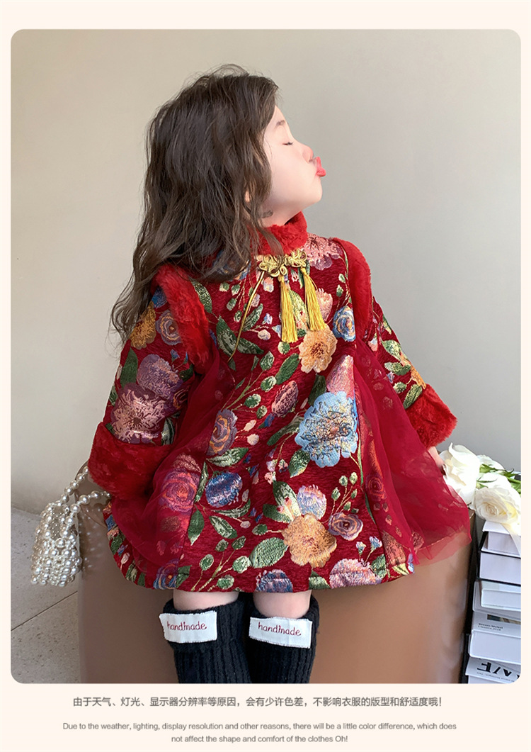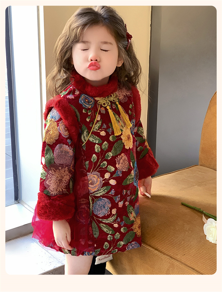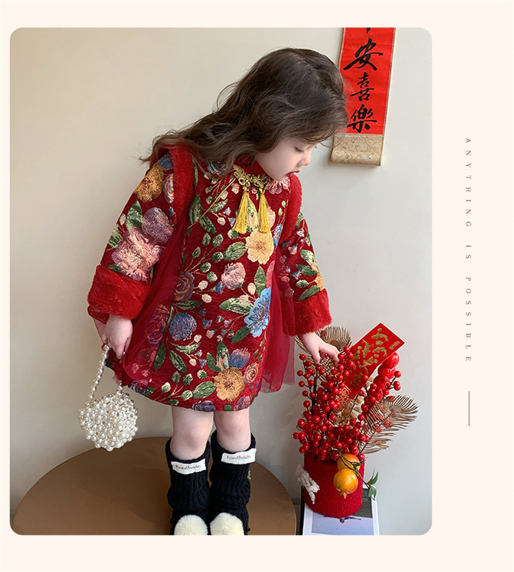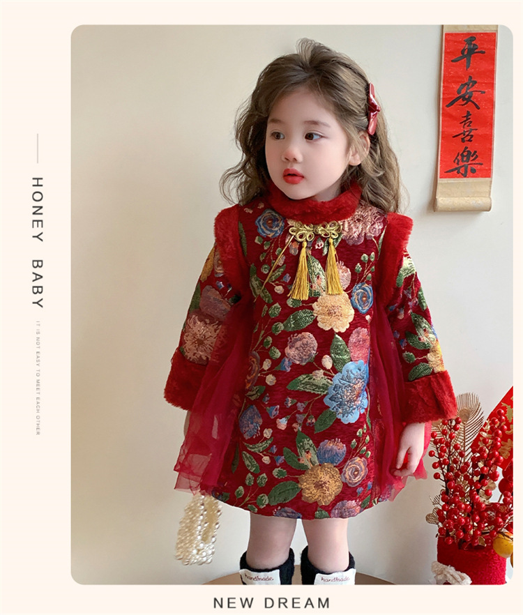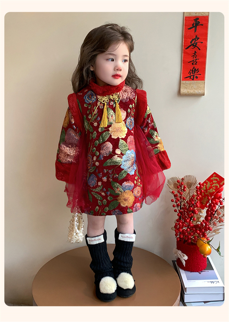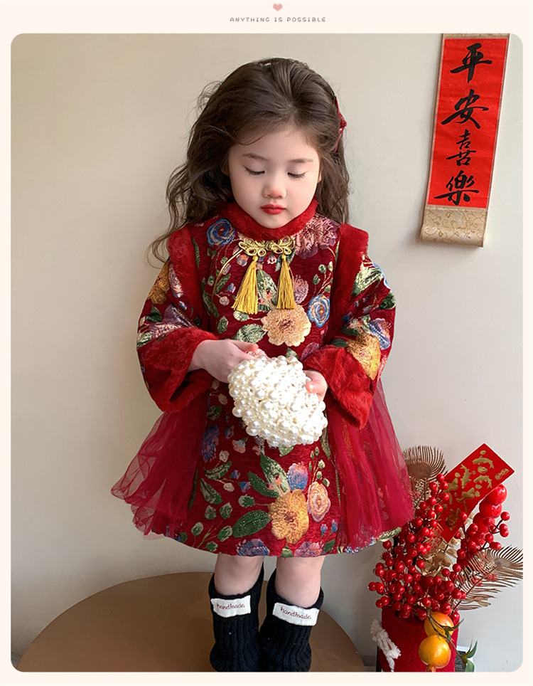 소녀들의 겨울 2024 신식 거즈 버클 청삼 신년 의류 서양식 신년 원피스 아동복 가을과 겨울