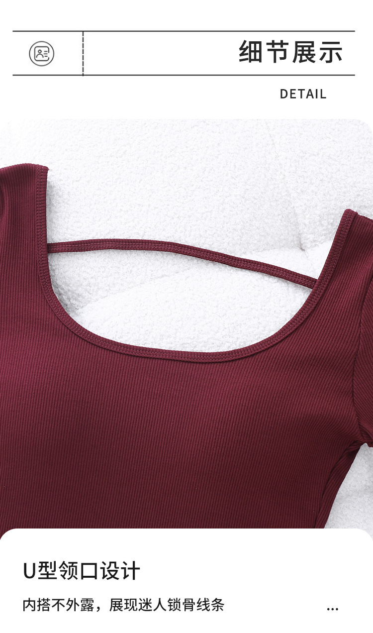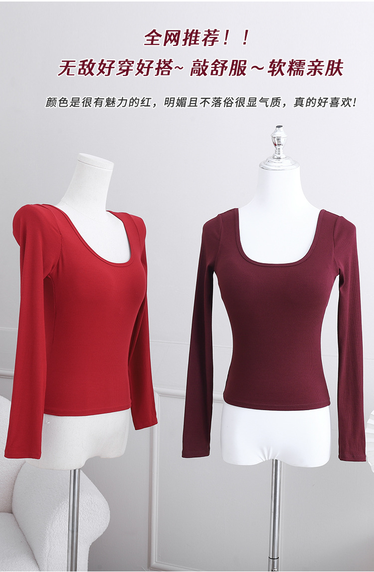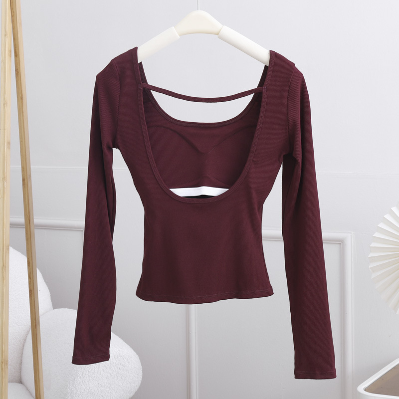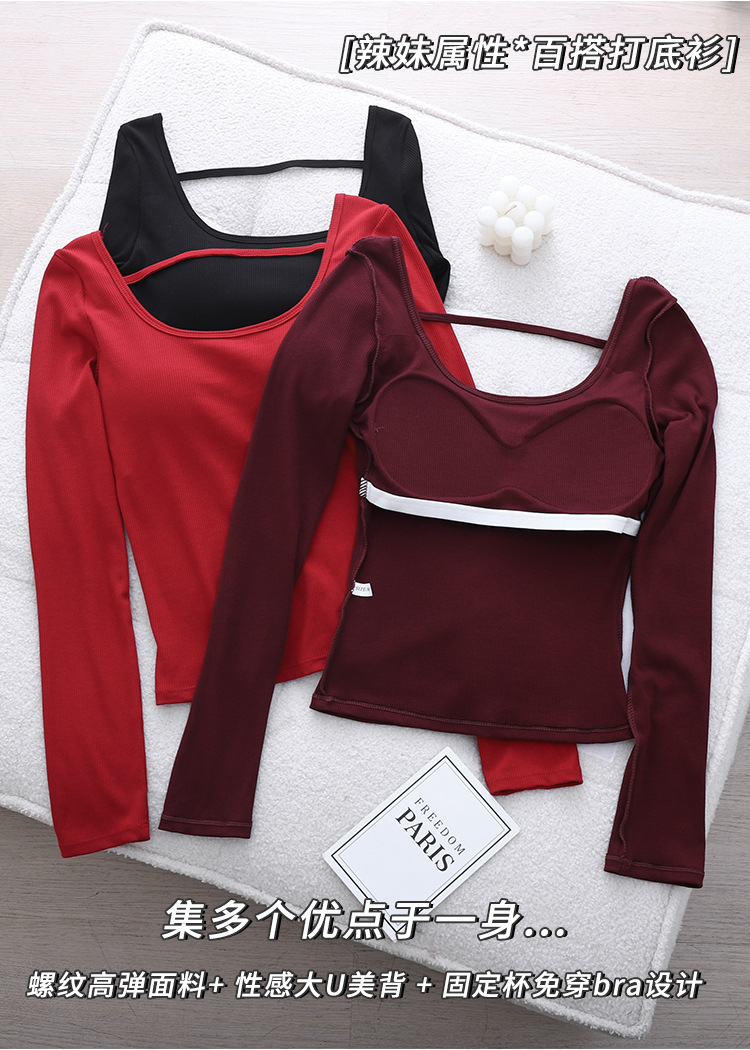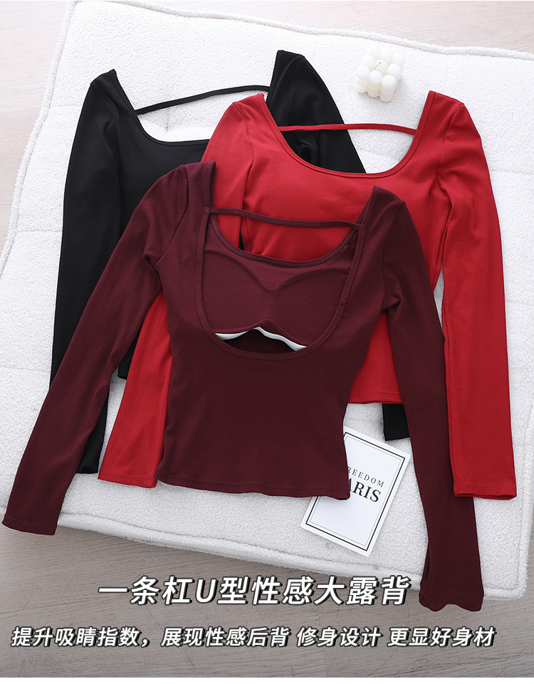 2024 인기 컬러 안코 라 레드 벨트 가슴 패드 티셔츠 여성의 가을과 겨울 섹시한 백리스 슬림베이스 셔츠 긴팔 탑스토어 가기