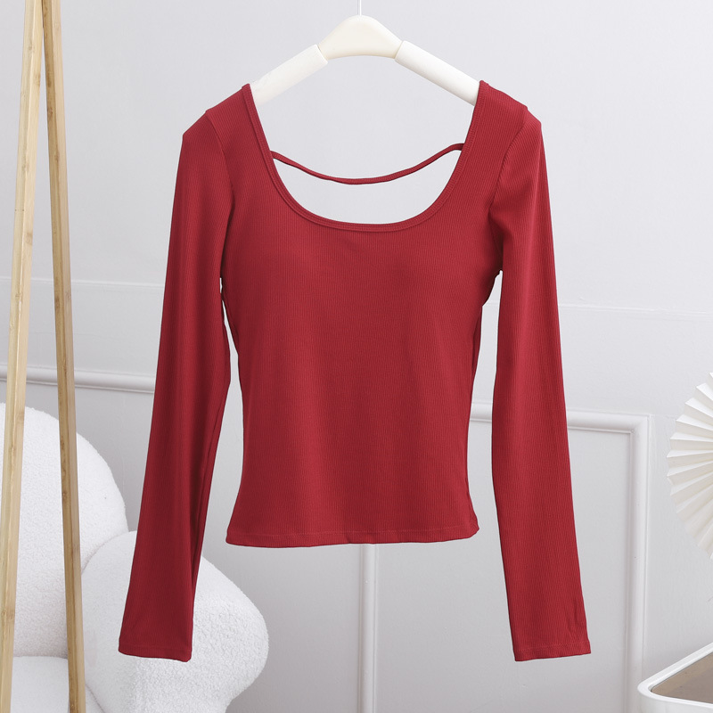 2024 인기 컬러 안코 라 레드 벨트 가슴 패드 티셔츠 여성의 가을과 겨울 섹시한 백리스 슬림베이스 셔츠 긴팔 탑