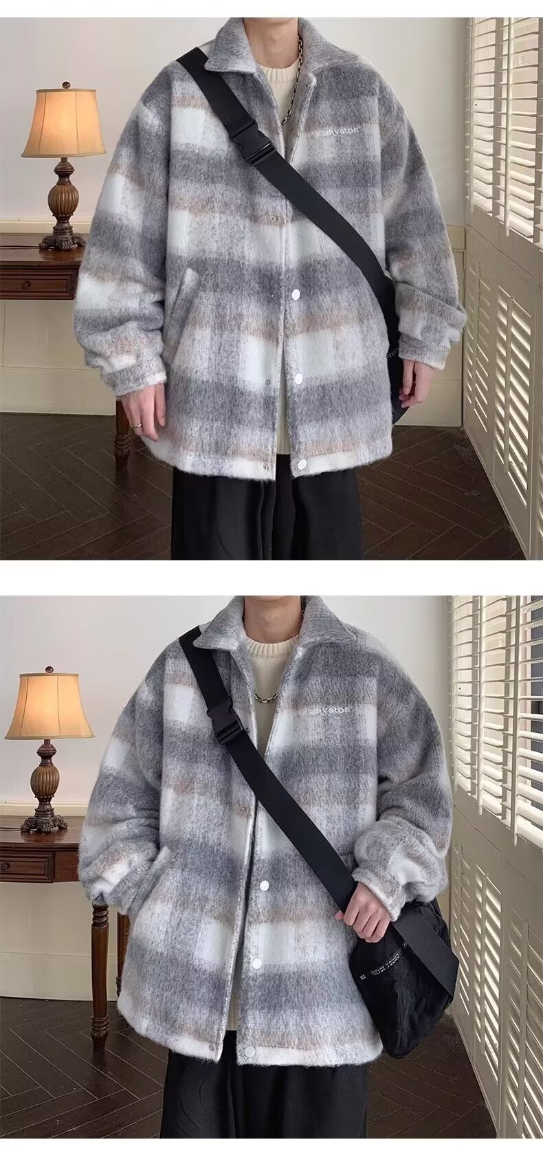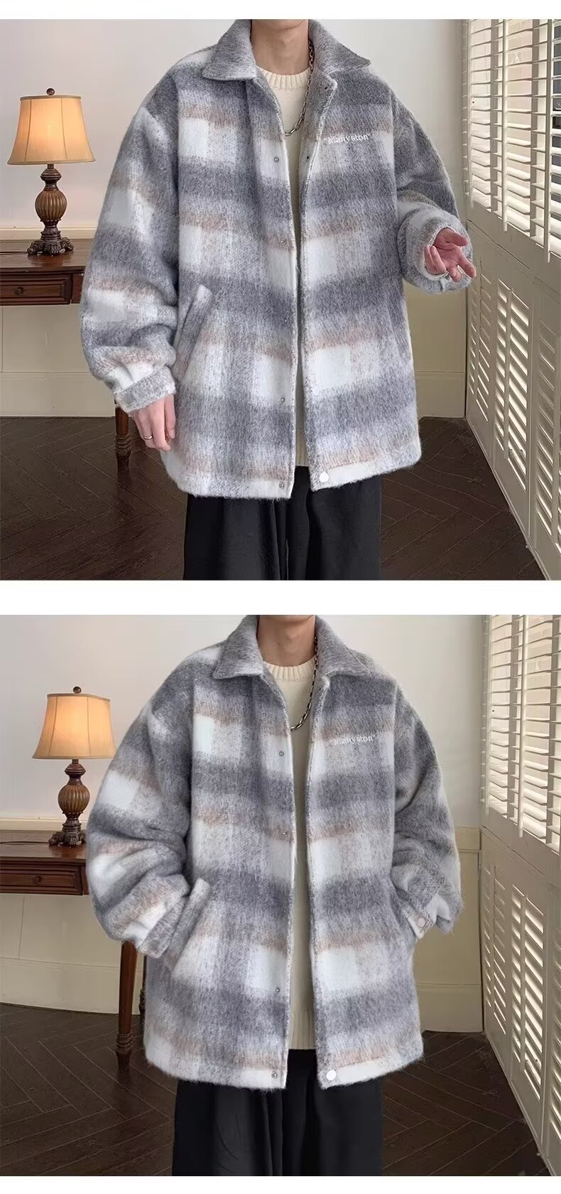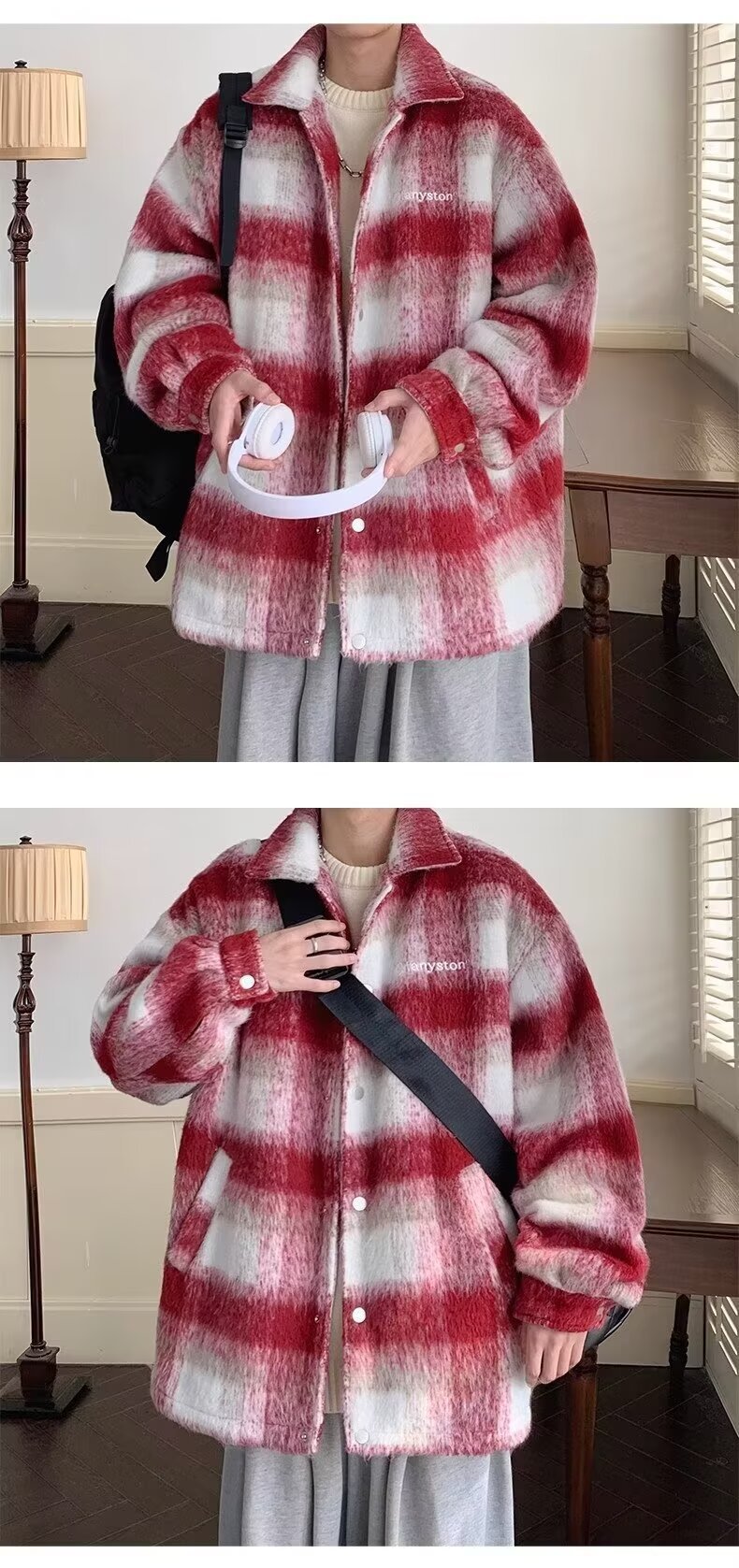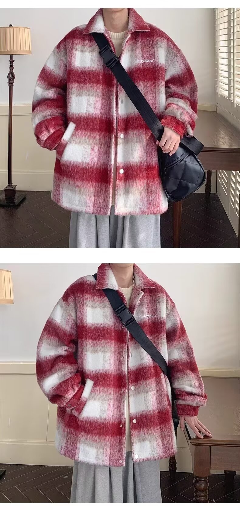 빨간 격자 무늬 모직 코트 남자의 가을과 겨울 두꺼운 홍콩 스타일 한국식 유행 브랜드 Mens 핸섬 옷깃 재킷스토어 가기