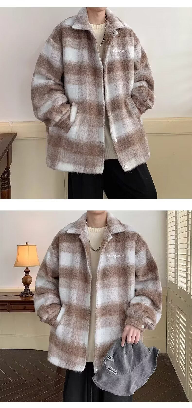 빨간 격자 무늬 모직 코트 남자의 가을과 겨울 두꺼운 홍콩 스타일 한국식 유행 브랜드 Mens 핸섬 옷깃 재킷