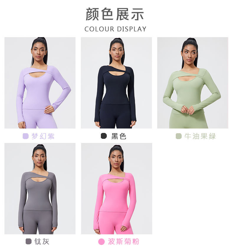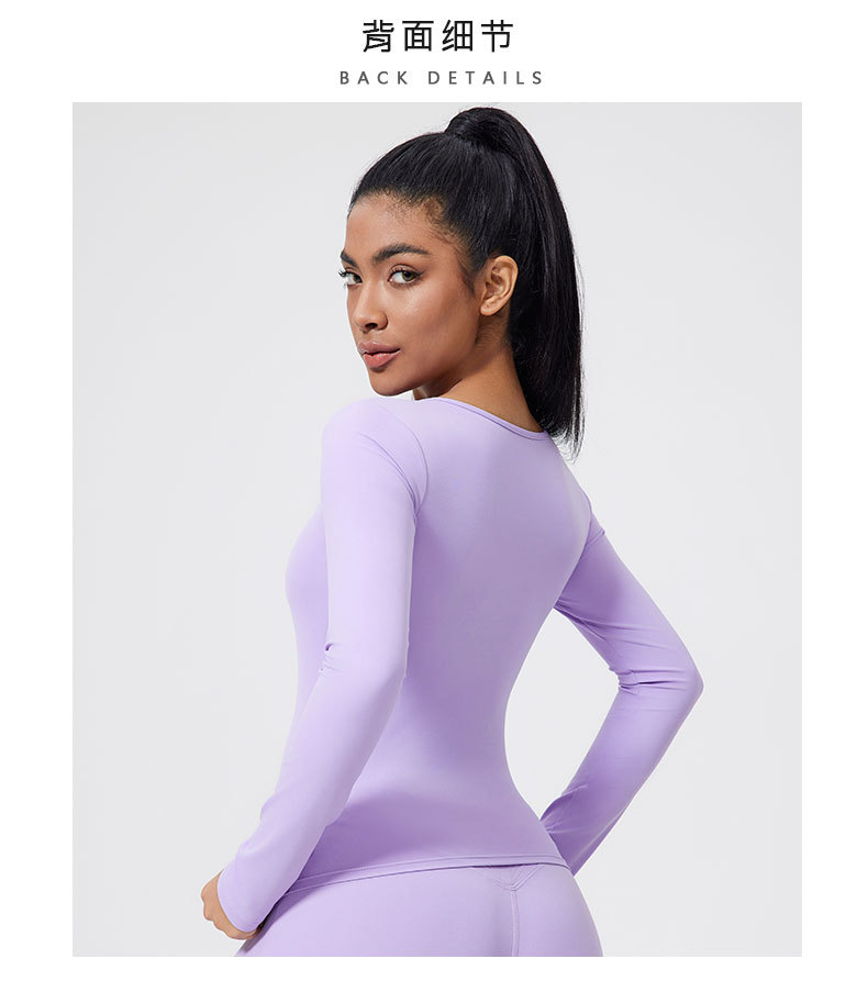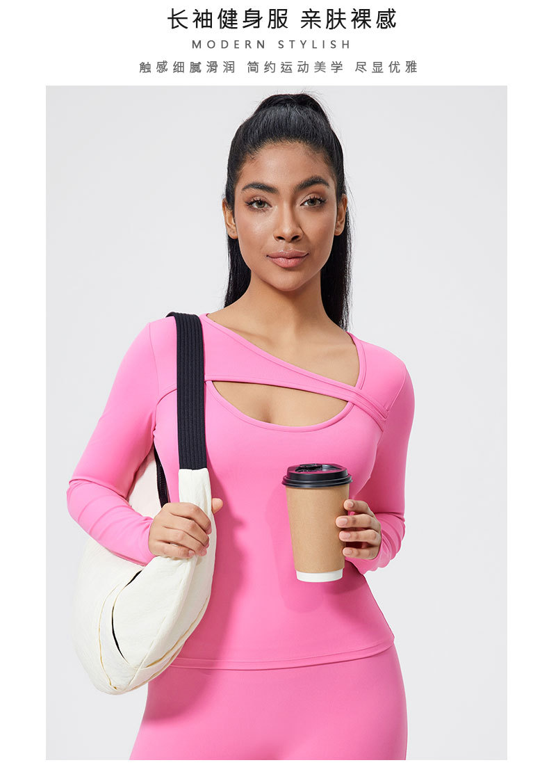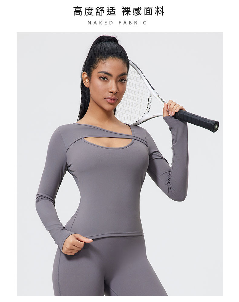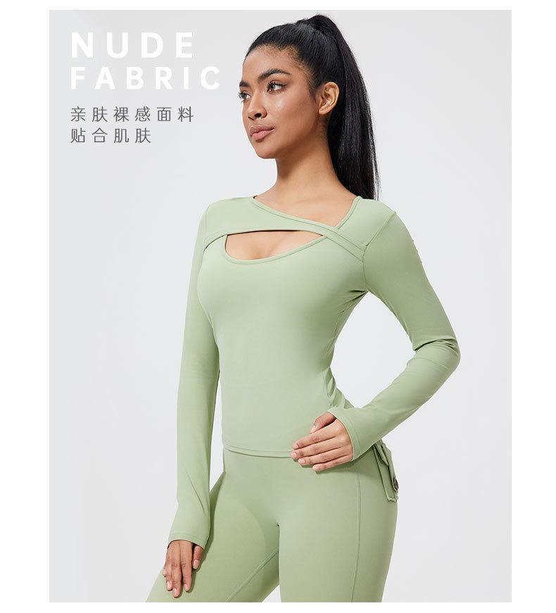 국경을 넘는 요가복, 긴팔 여성용 누드 요가 상의, 가슴 패드가 있는 스포츠 피트니스, 탈부착 가능한 누드 느낌, 허리 타이트 핏