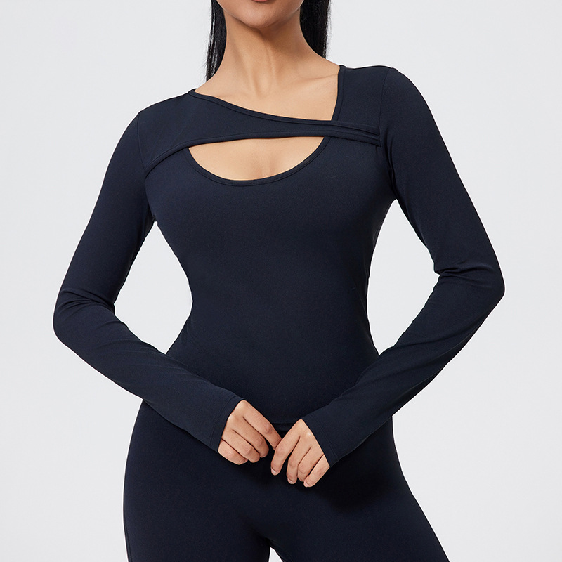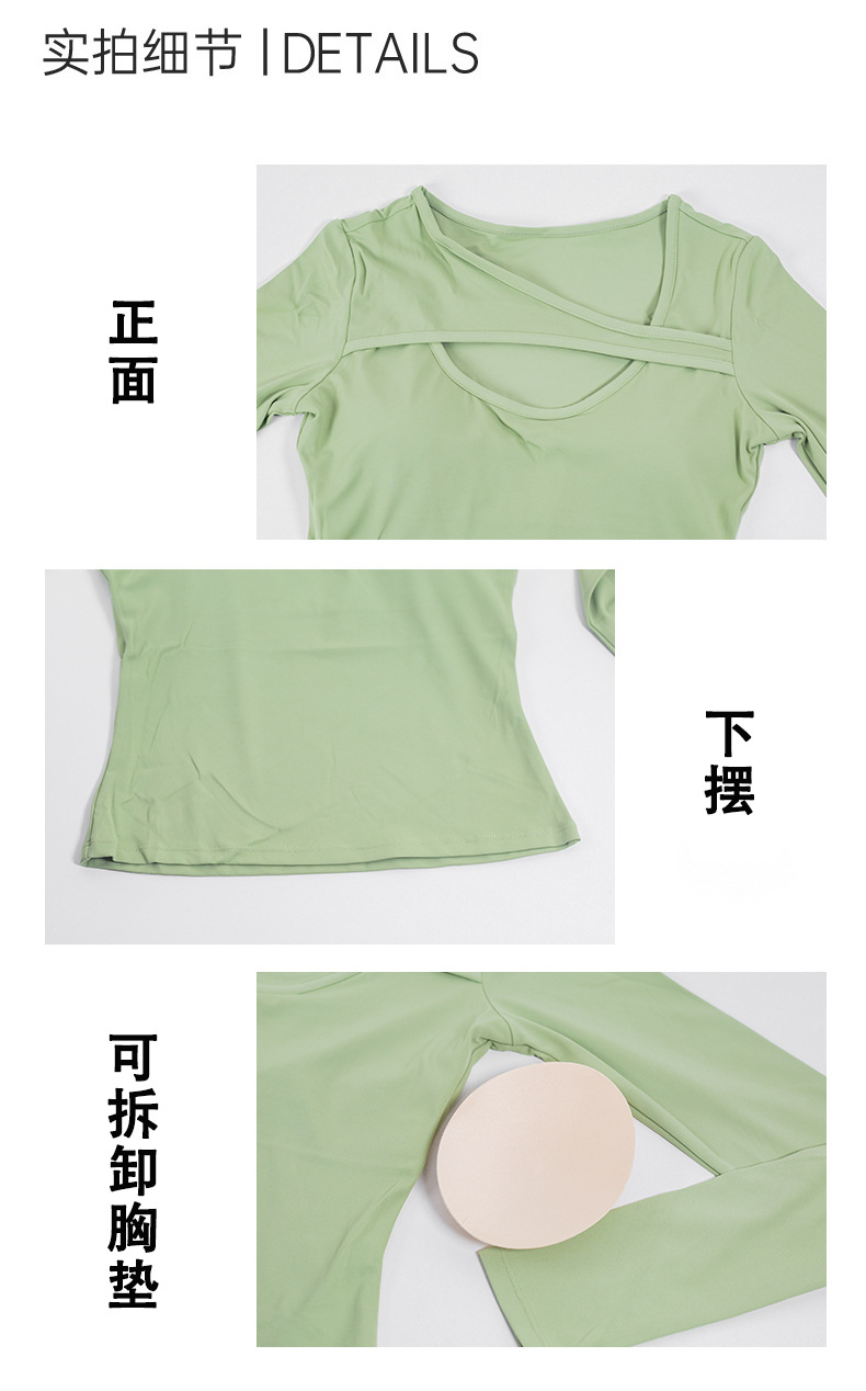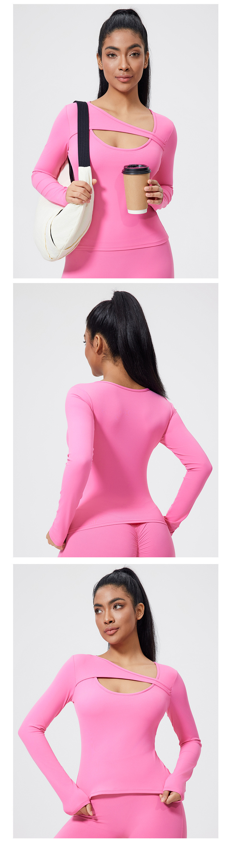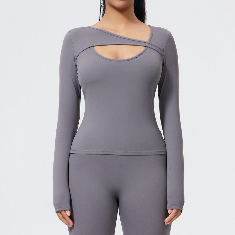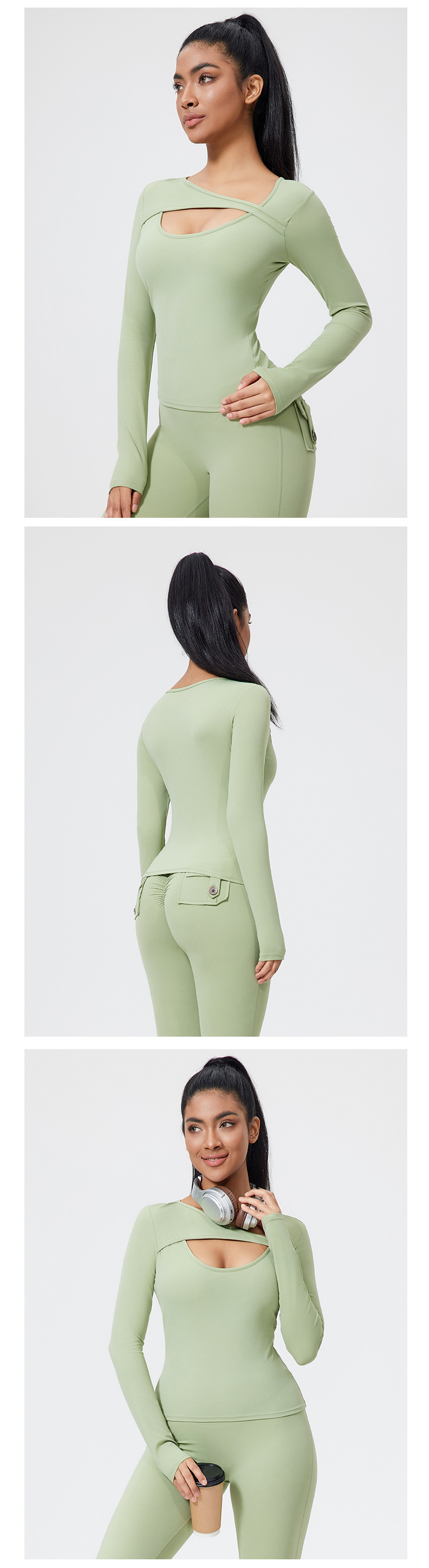 국경을 넘는 요가복, 긴팔 여성용 누드 요가 상의, 가슴 패드가 있는 스포츠 피트니스, 탈부착 가능한 누드 느낌, 허리 타이트 핏