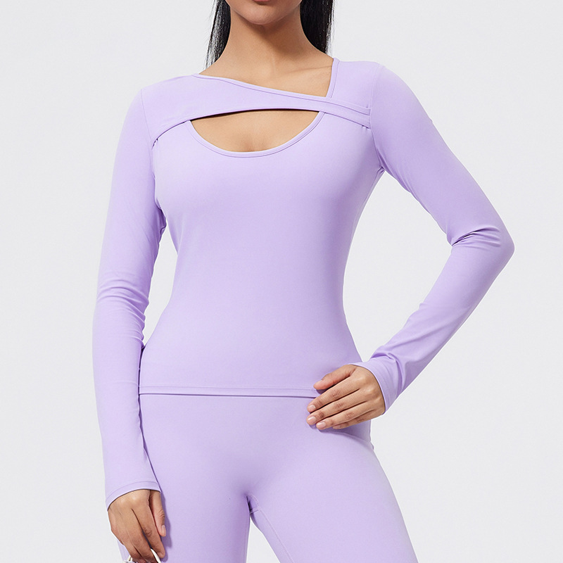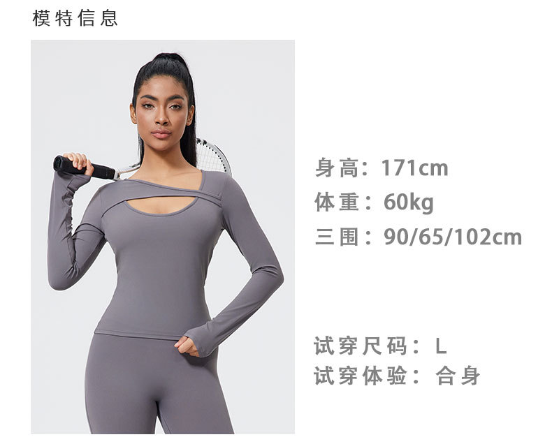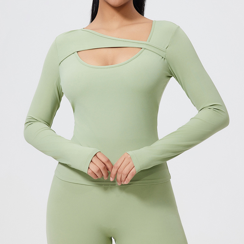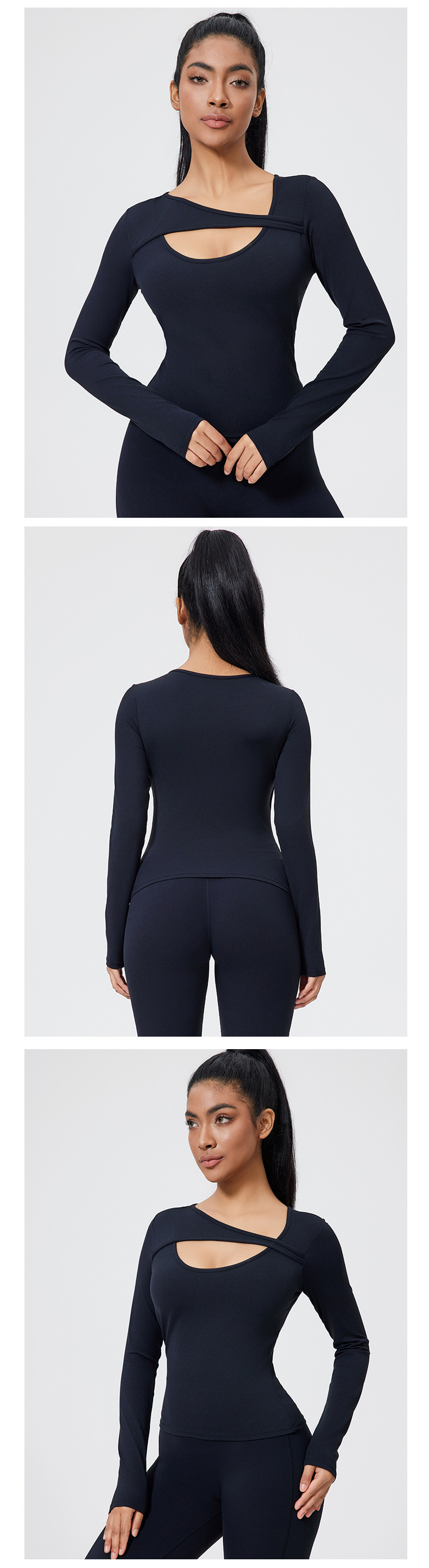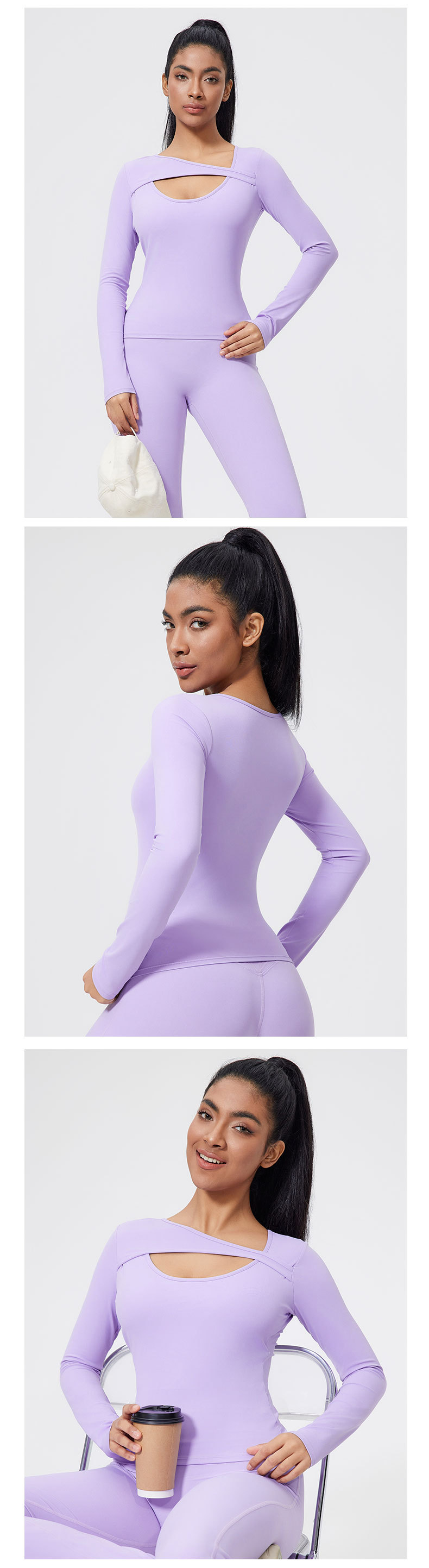 국경을 넘는 요가복, 긴팔 여성용 누드 요가 상의, 가슴 패드가 있는 스포츠 피트니스, 탈부착 가능한 누드 느낌, 허리 타이트 핏