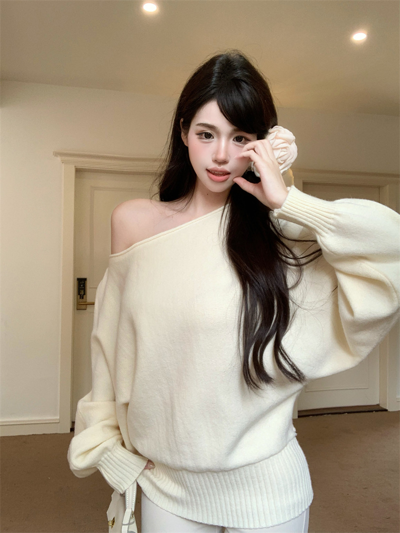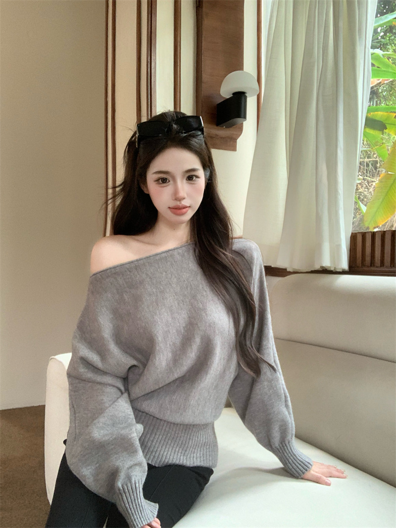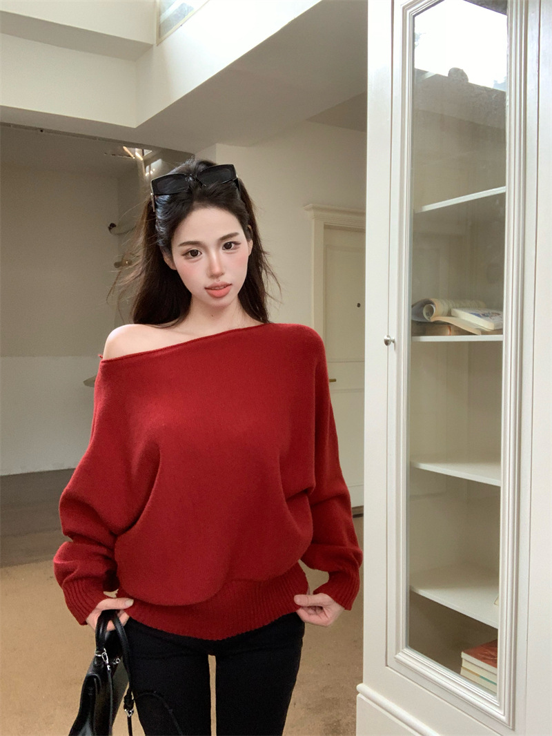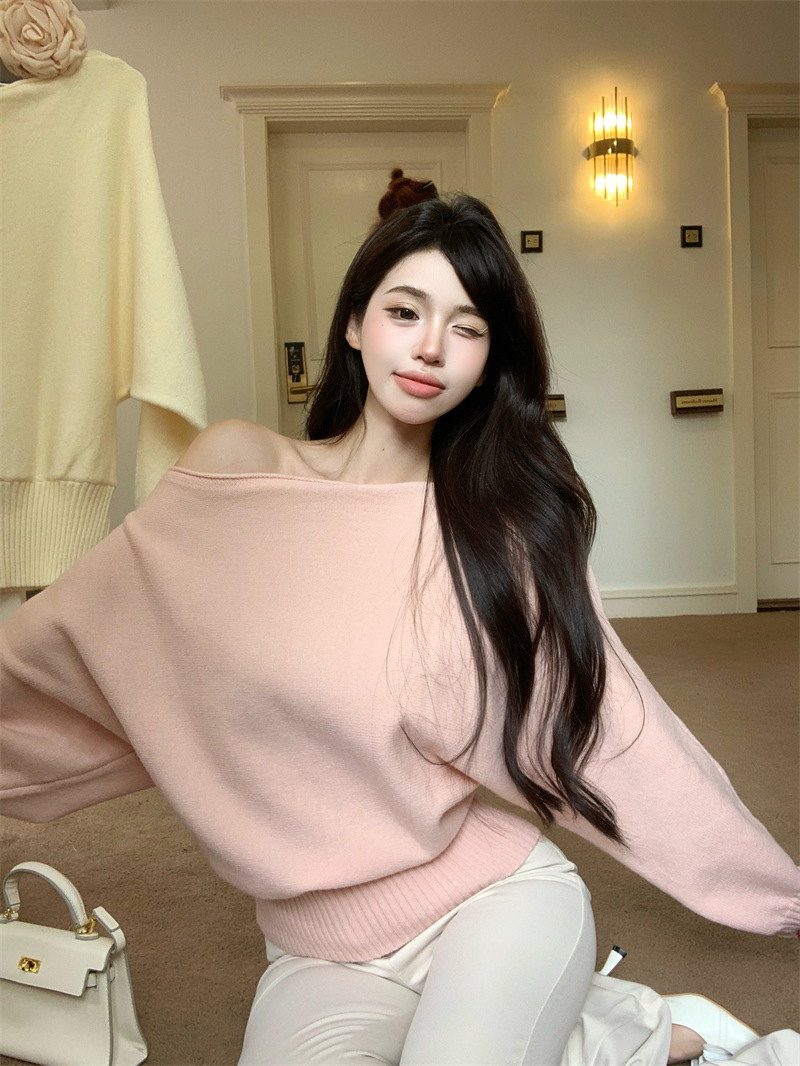 2024 년 가을과 겨울 새로운 순수한 욕망 게으른 스타일 섹시한 슬란 칼라 어깨 박쥐 소매 느슨한 풀오버 니트 스웨터