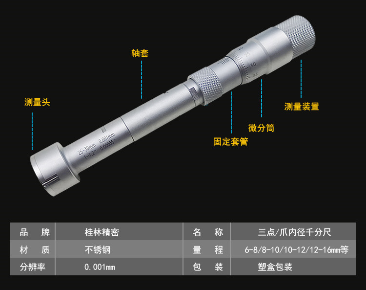 계림 정밀 3 점 내부 마이크로 미터 3 턱 내부 구멍 측정 내부 측정 10-12-16-20-30-40-50mm