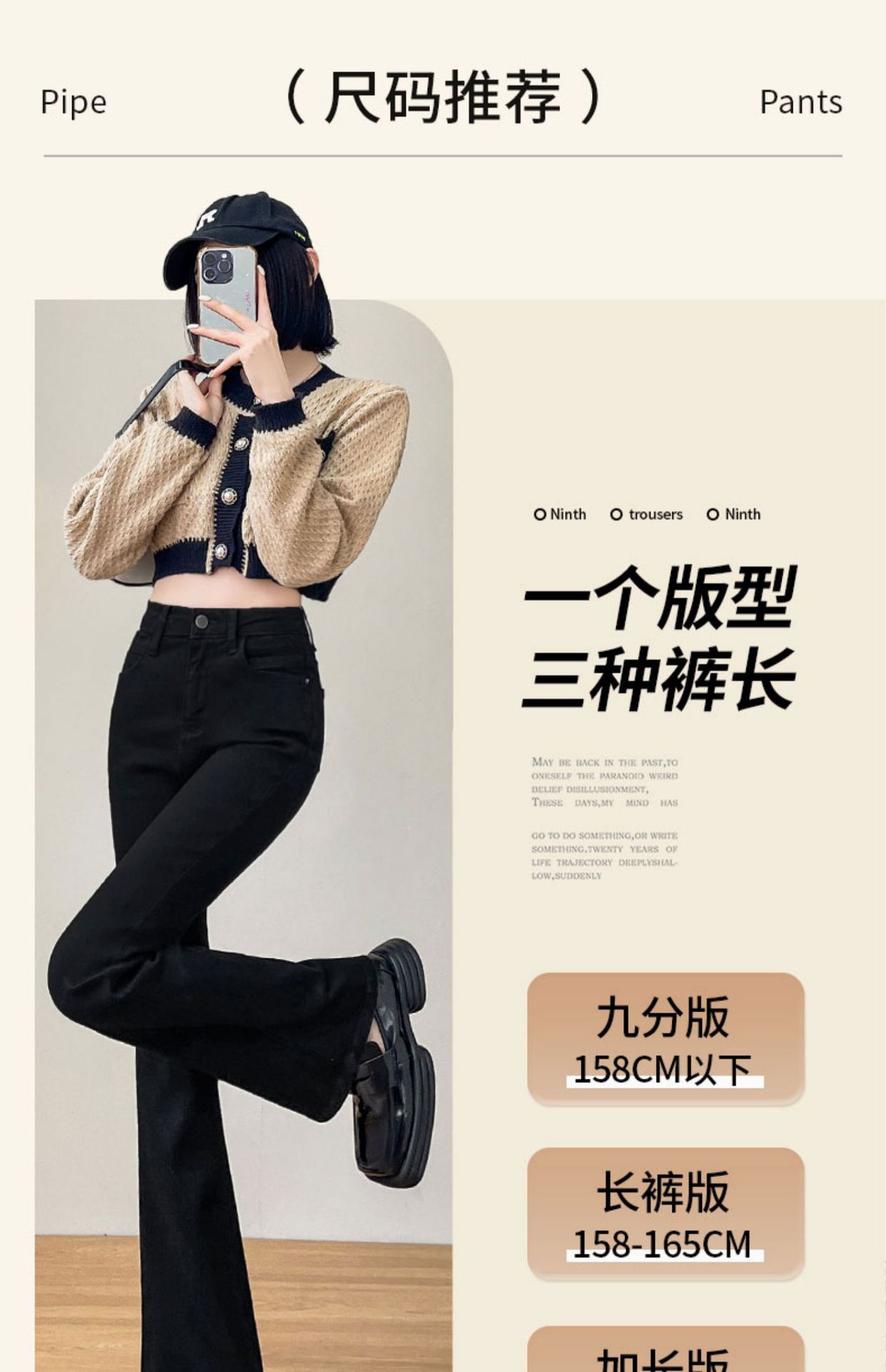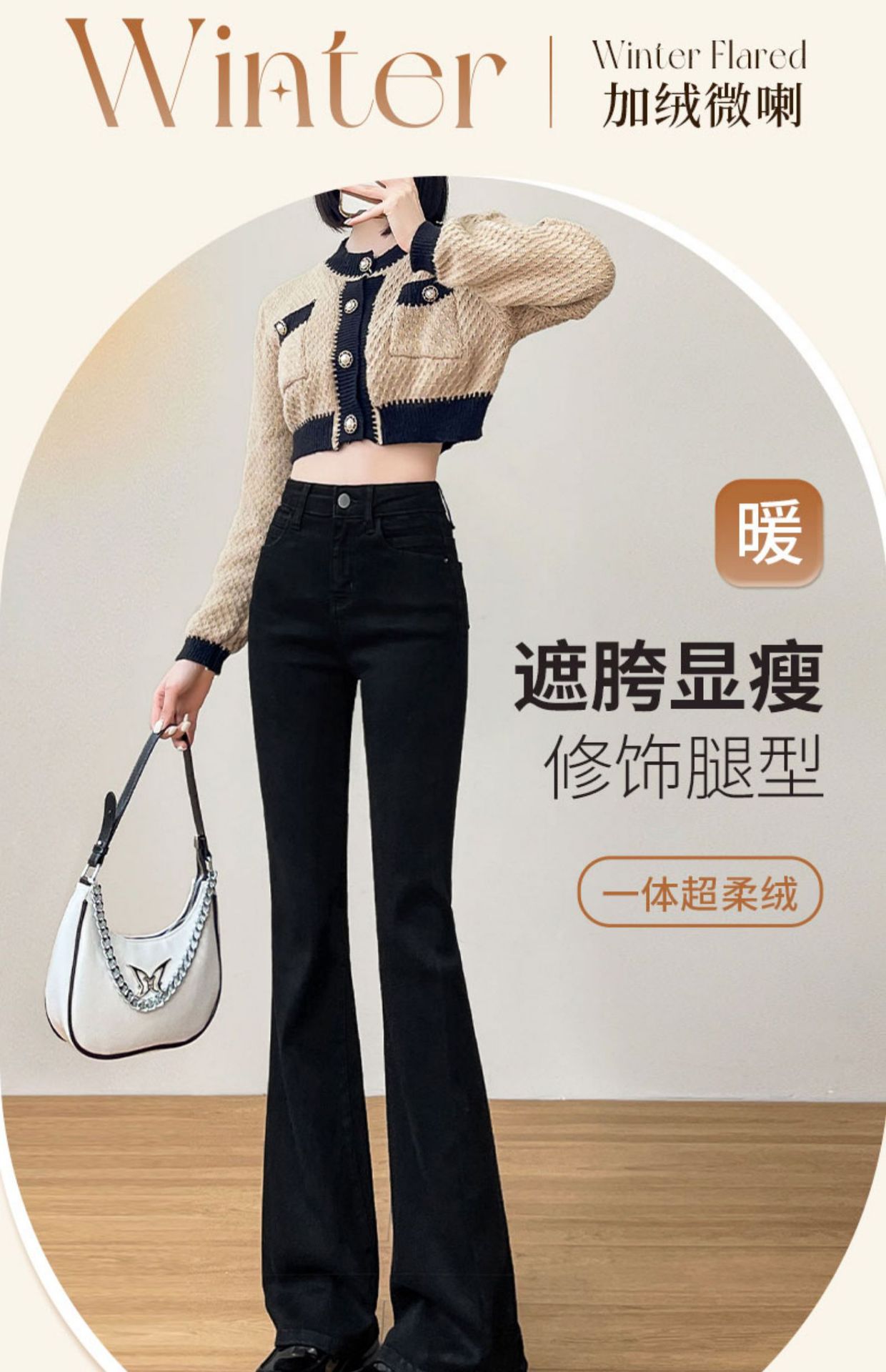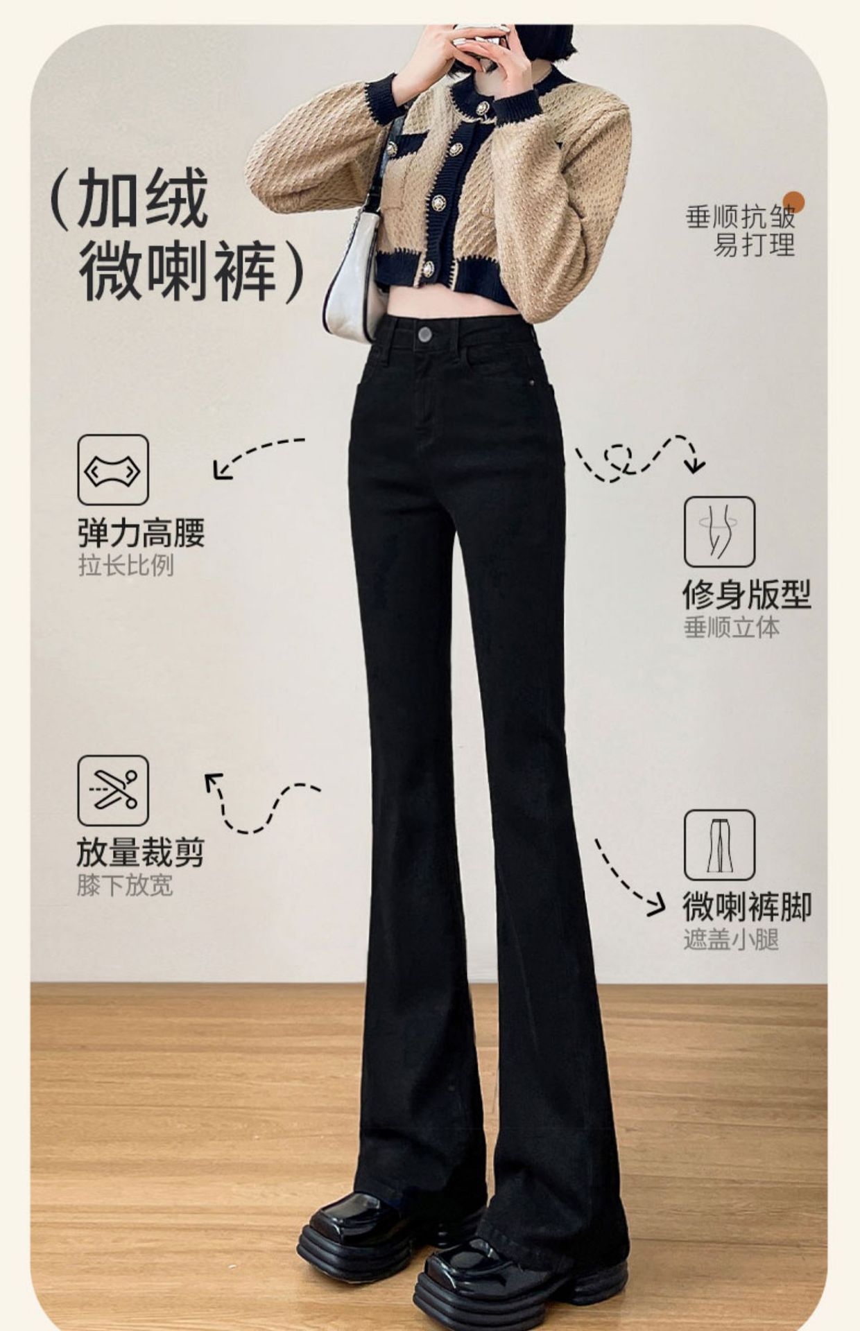 기모 플레어 바지 여성의 가을과 겨울 2024 새로운 폭발 높은 허리 슬림 두꺼운 검은 겨울 마이크로 청바지스토어 가기