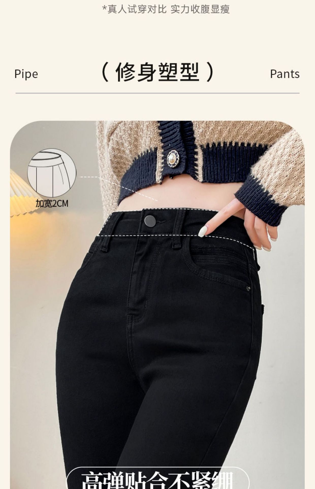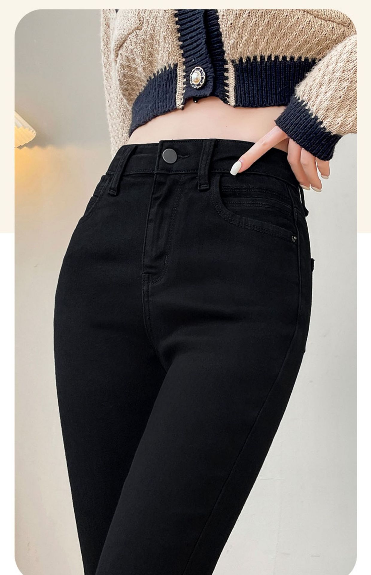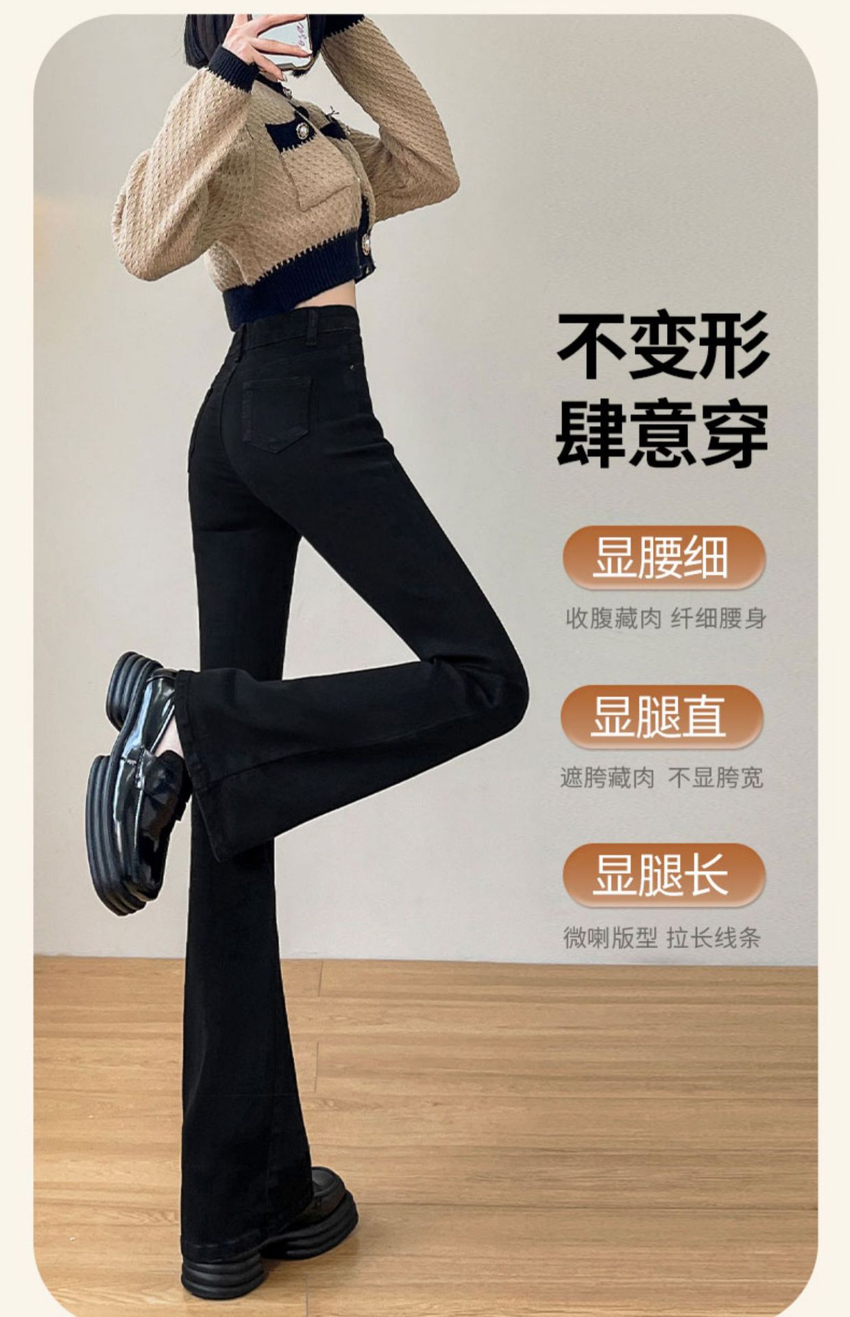 기모 플레어 바지 여성의 가을과 겨울 2024 새로운 폭발 높은 허리 슬림 두꺼운 검은 겨울 마이크로 청바지스토어 가기