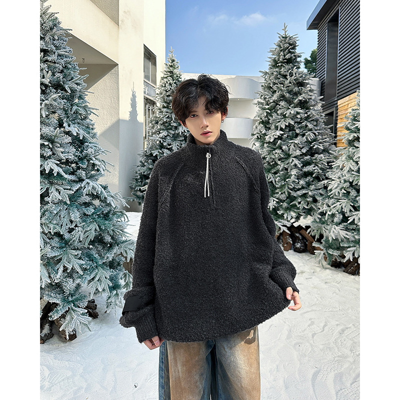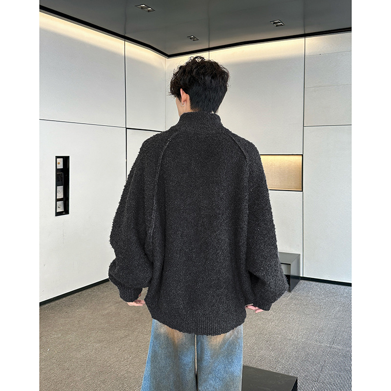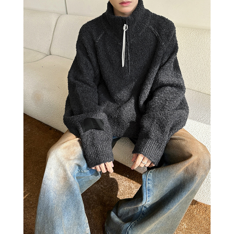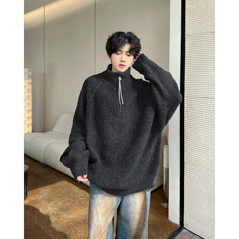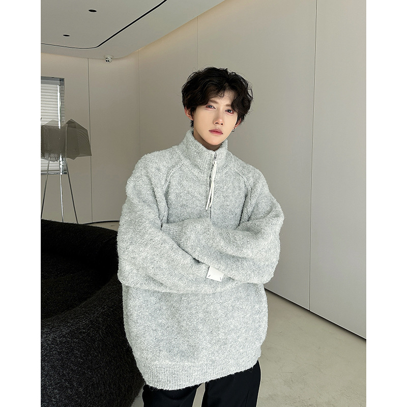 라이트 그레이 아메리칸 레트로 트렌드 지퍼 수직 칼라 니트웨어 2025 가을과 겨울 새로운 디자인 센스 남성용 스웨터스토어 가기