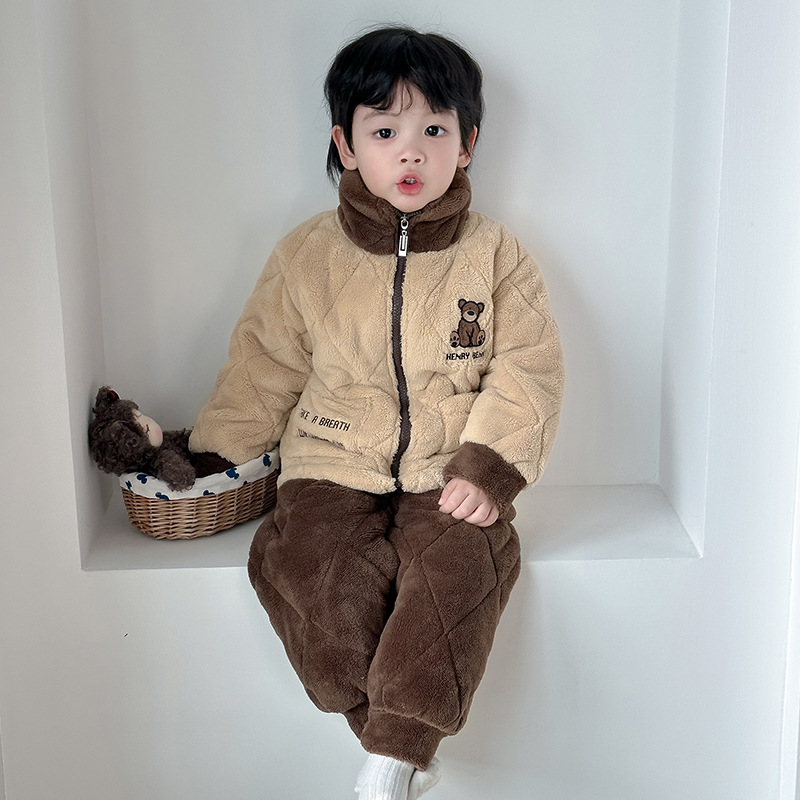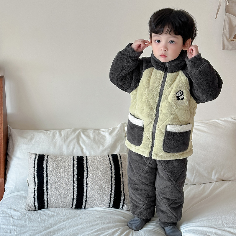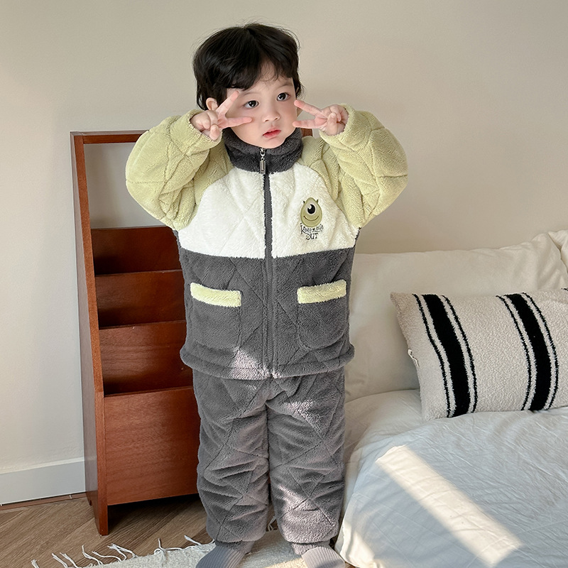 정품 공장 직영 가을 겨울 기모 두꺼운 삼중 누빔 여아 남아 산호벨벳 잠옷 아동 홈웨어