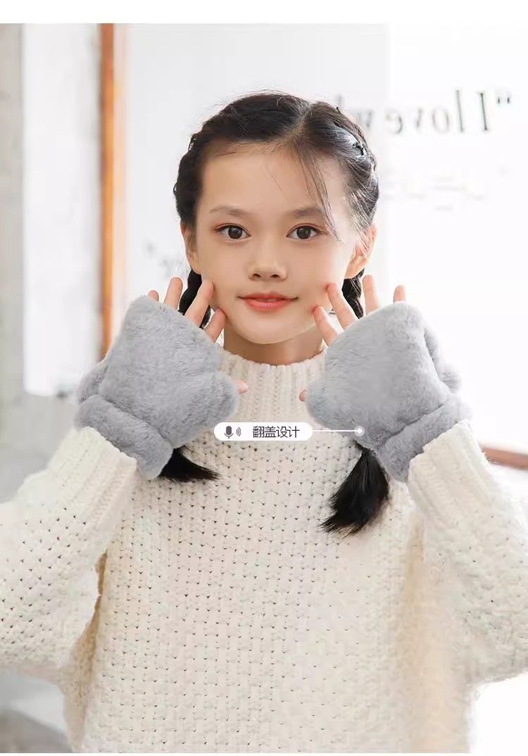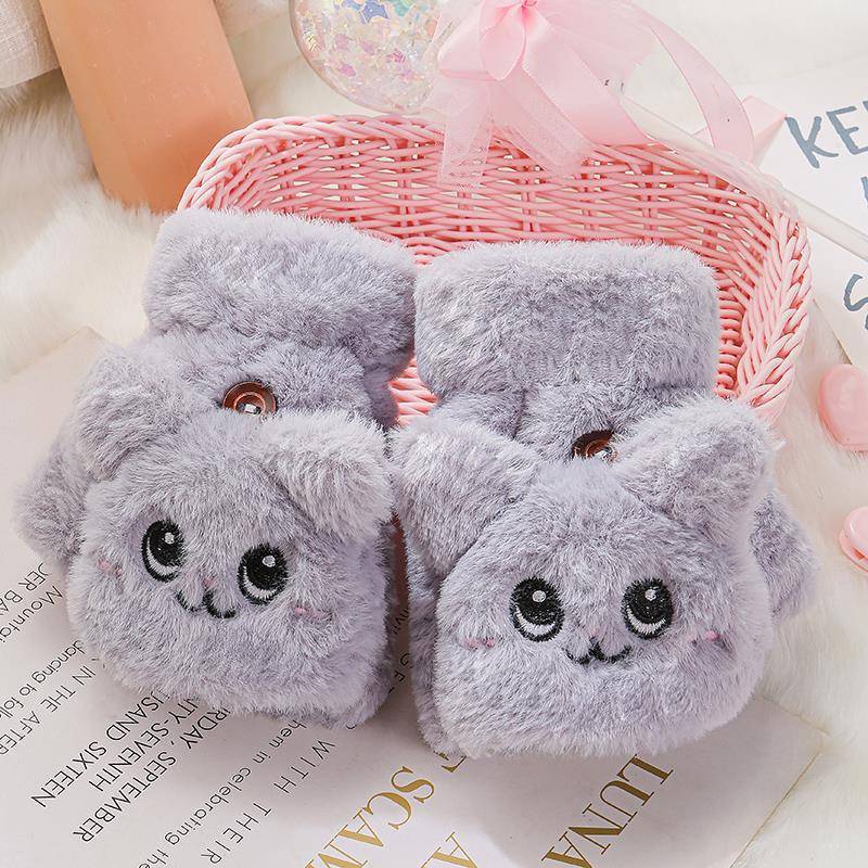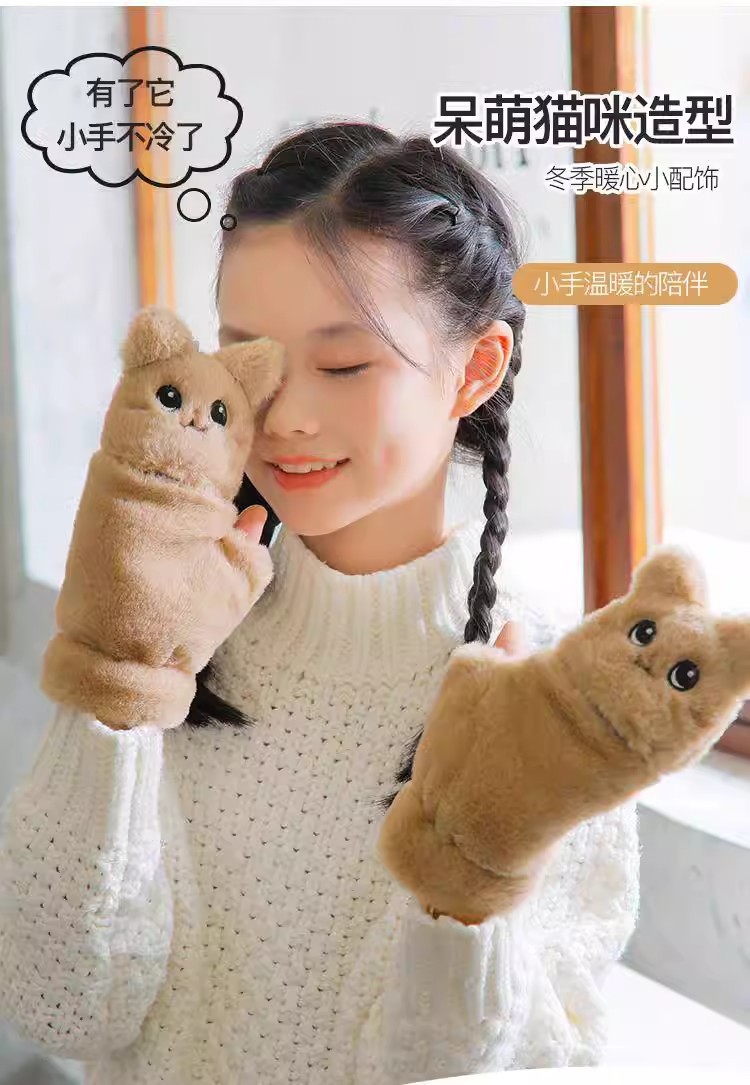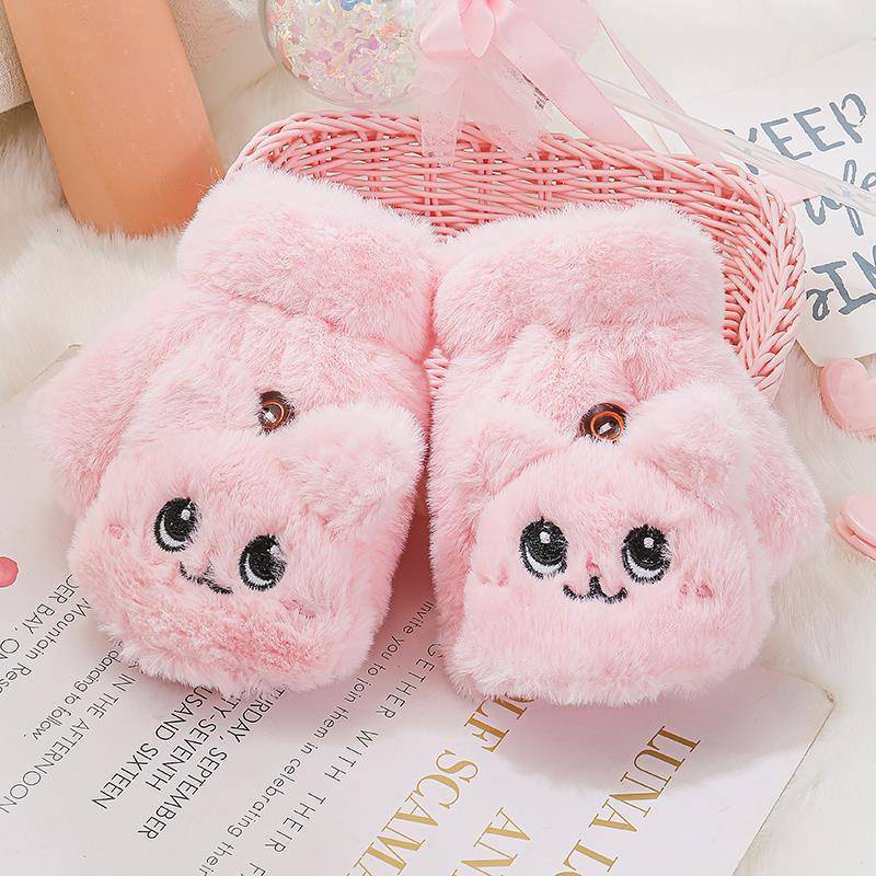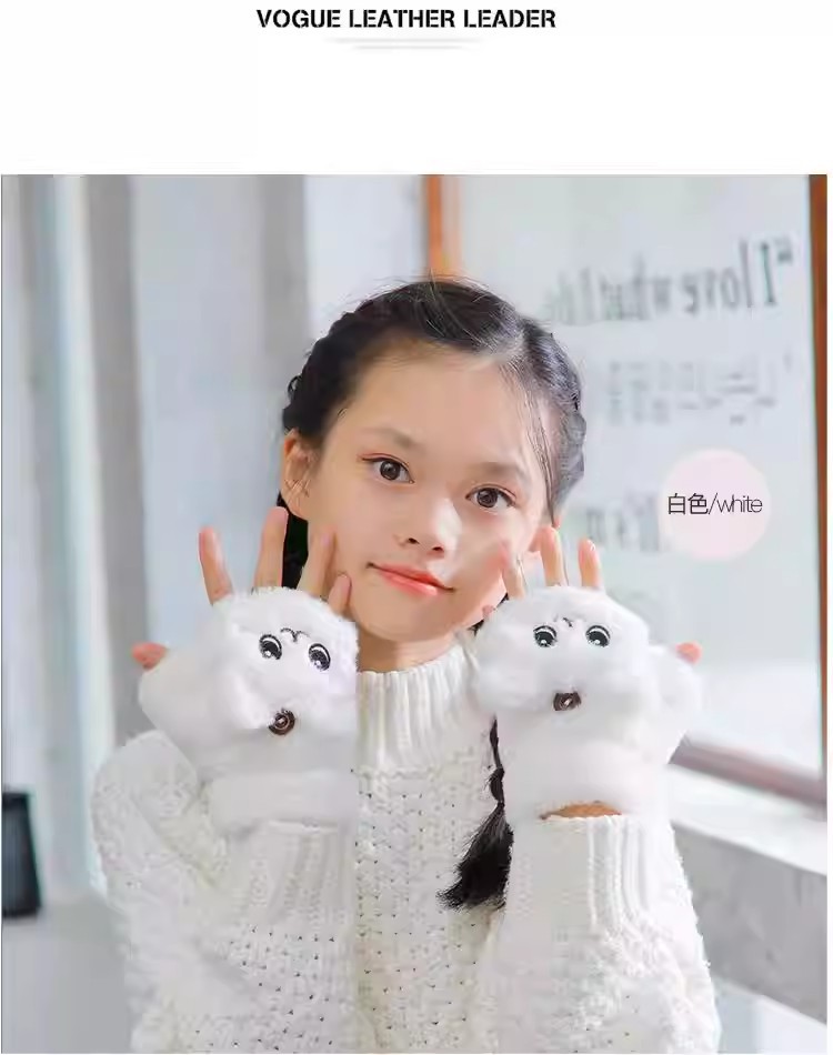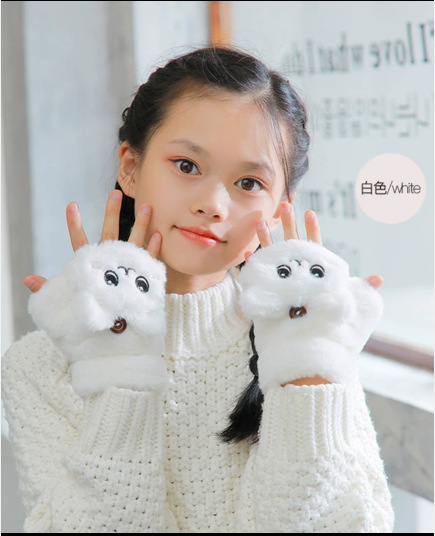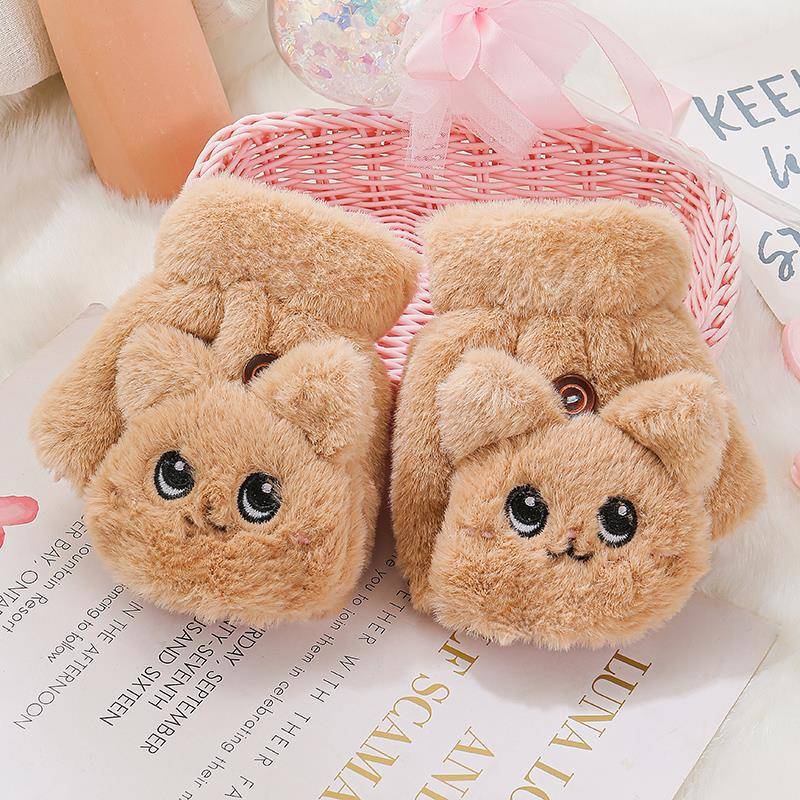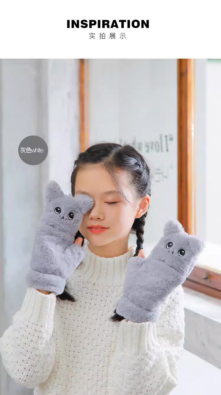 부드러운 귀여운 만화 고양이 봉제 어린이 장갑 소녀 가을과 겨울 따뜻한 기모 달콤한 하프 핑거 플립 장갑 국경스토어 가기