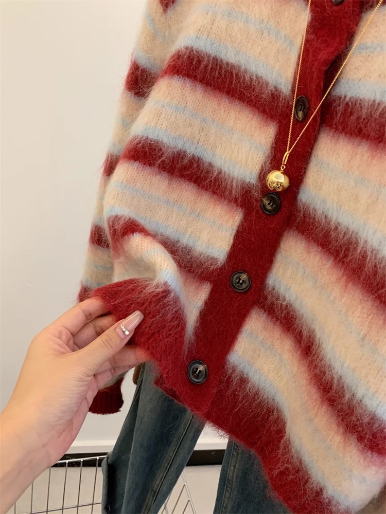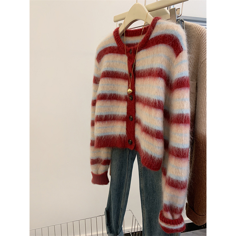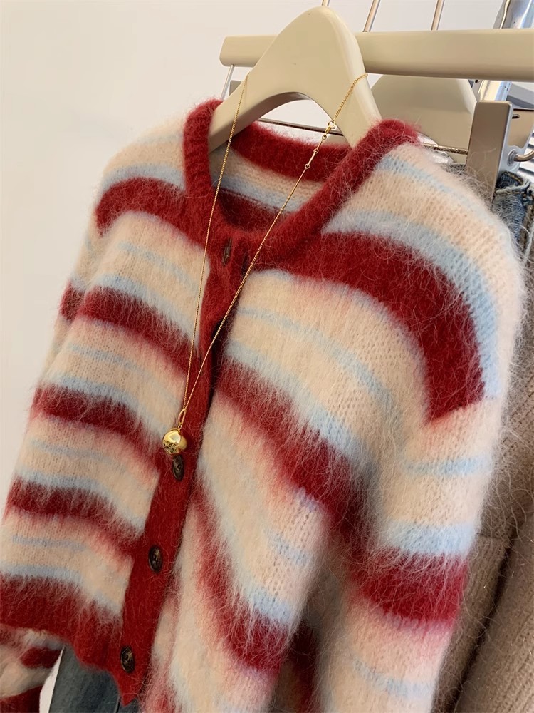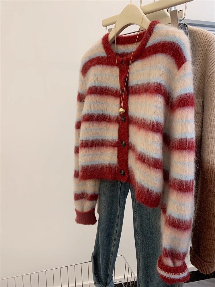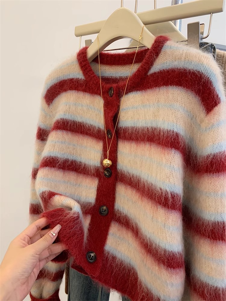 2024 새로운 프랑스 스타일 레트로 짧은 스타일 레드 스트라이프 스웨터 여성의 봄과 가을 니트 카디건 재킷스토어 가기
