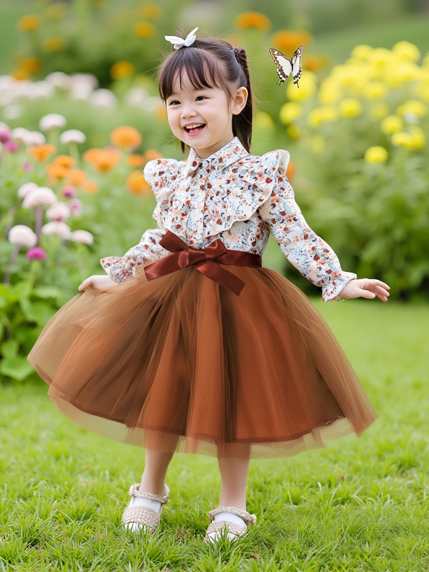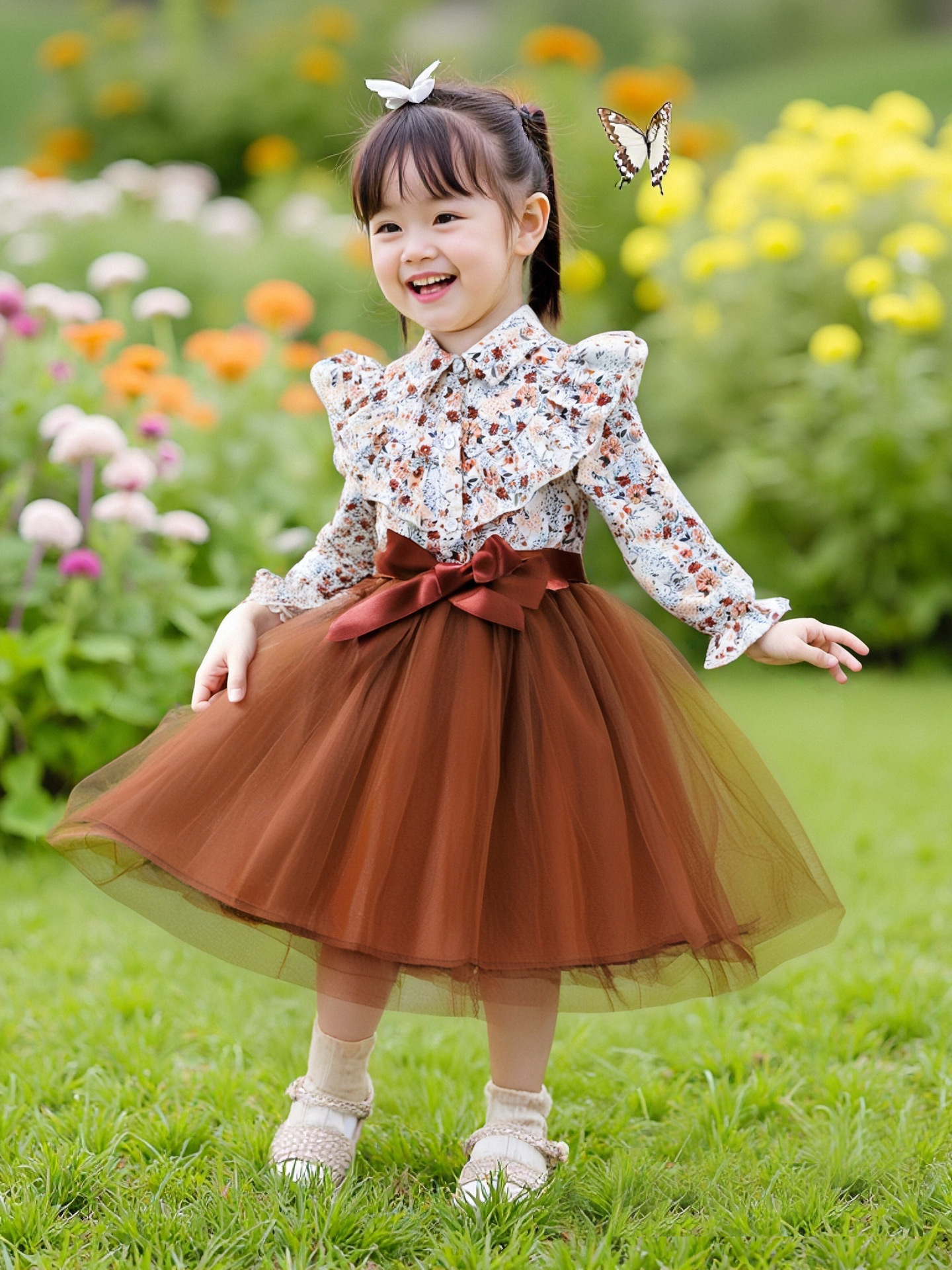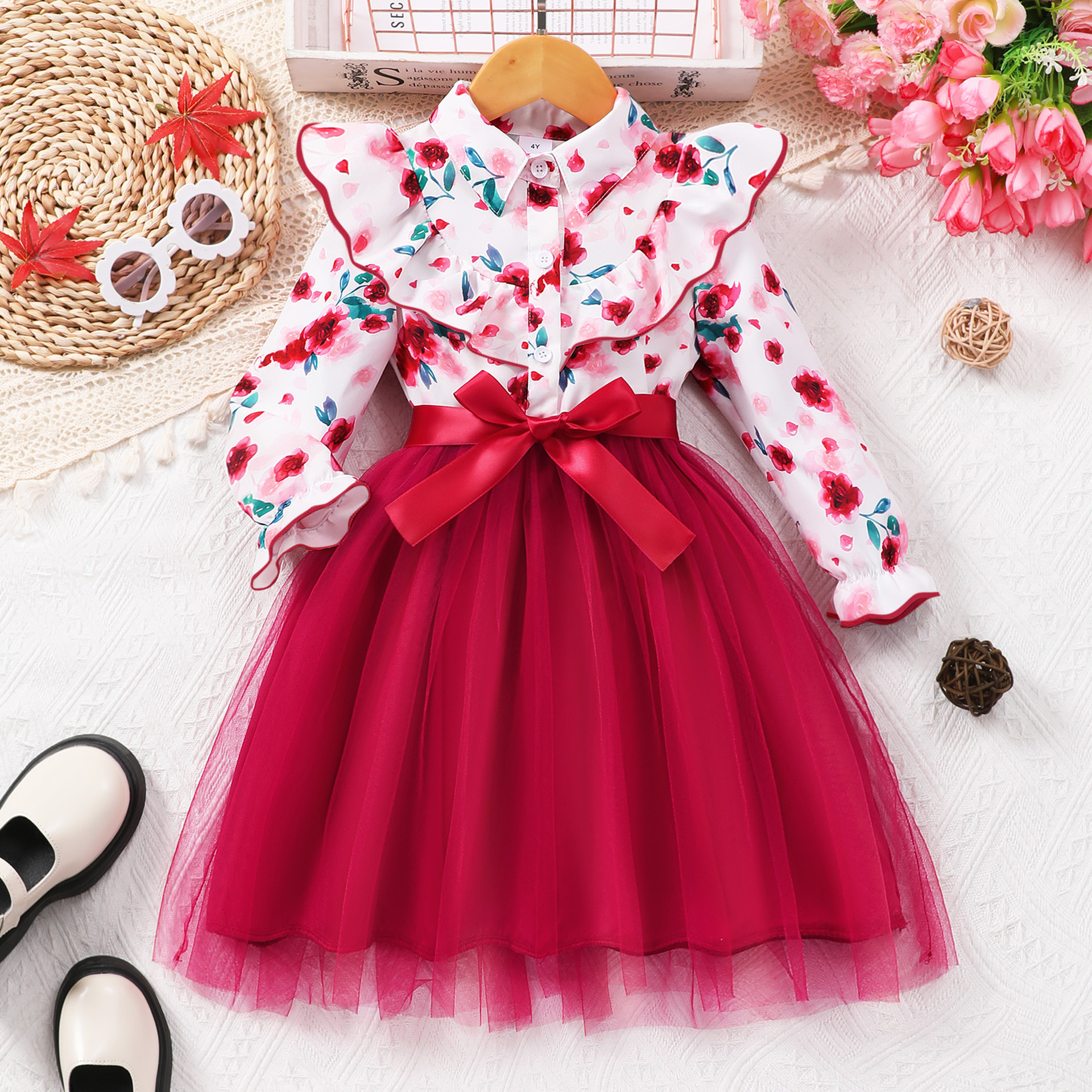 봄과 가을 새로운 소녀 긴 소매 옷깃 꽃 메쉬 인쇄 원피스 짠 벨트 유럽과 미국의 소녀 공주 원피스스토어 가기