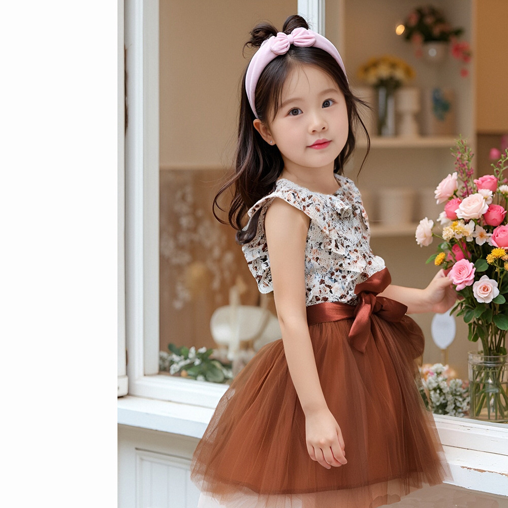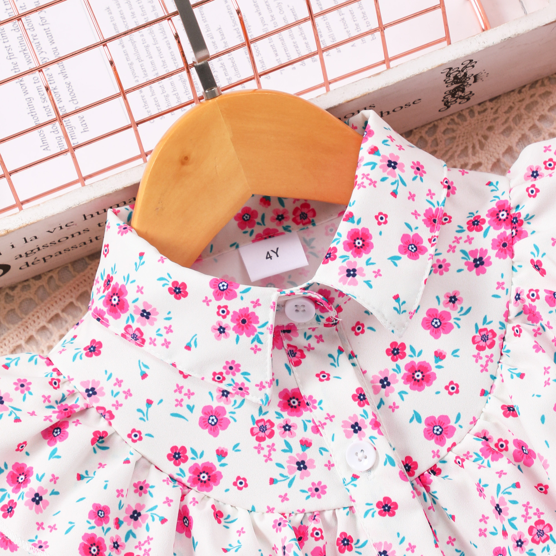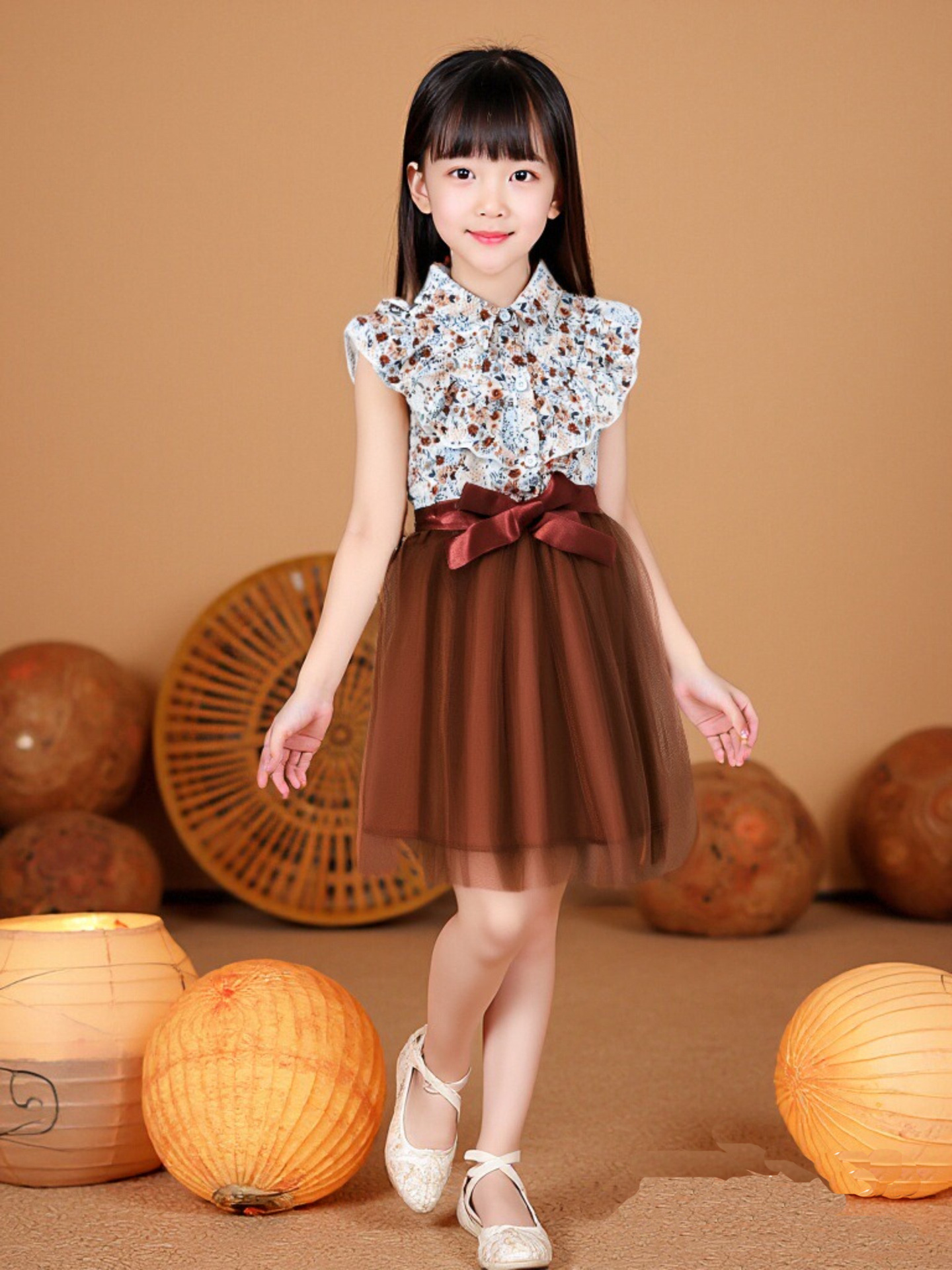 봄과 가을 새로운 소녀 긴 소매 옷깃 꽃 메쉬 인쇄 원피스 짠 벨트 유럽과 미국의 소녀 공주 원피스스토어 가기