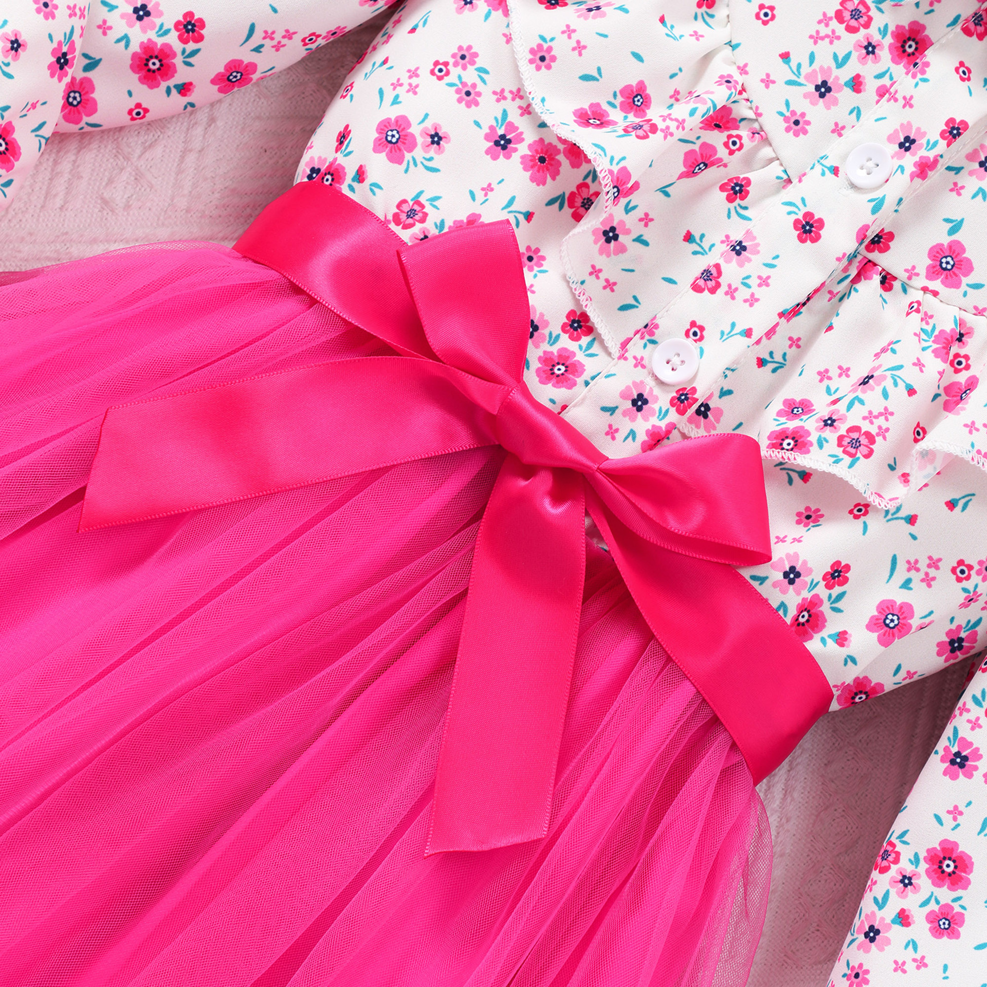 봄과 가을 새로운 소녀 긴 소매 옷깃 꽃 메쉬 인쇄 원피스 짠 벨트 유럽과 미국의 소녀 공주 원피스
