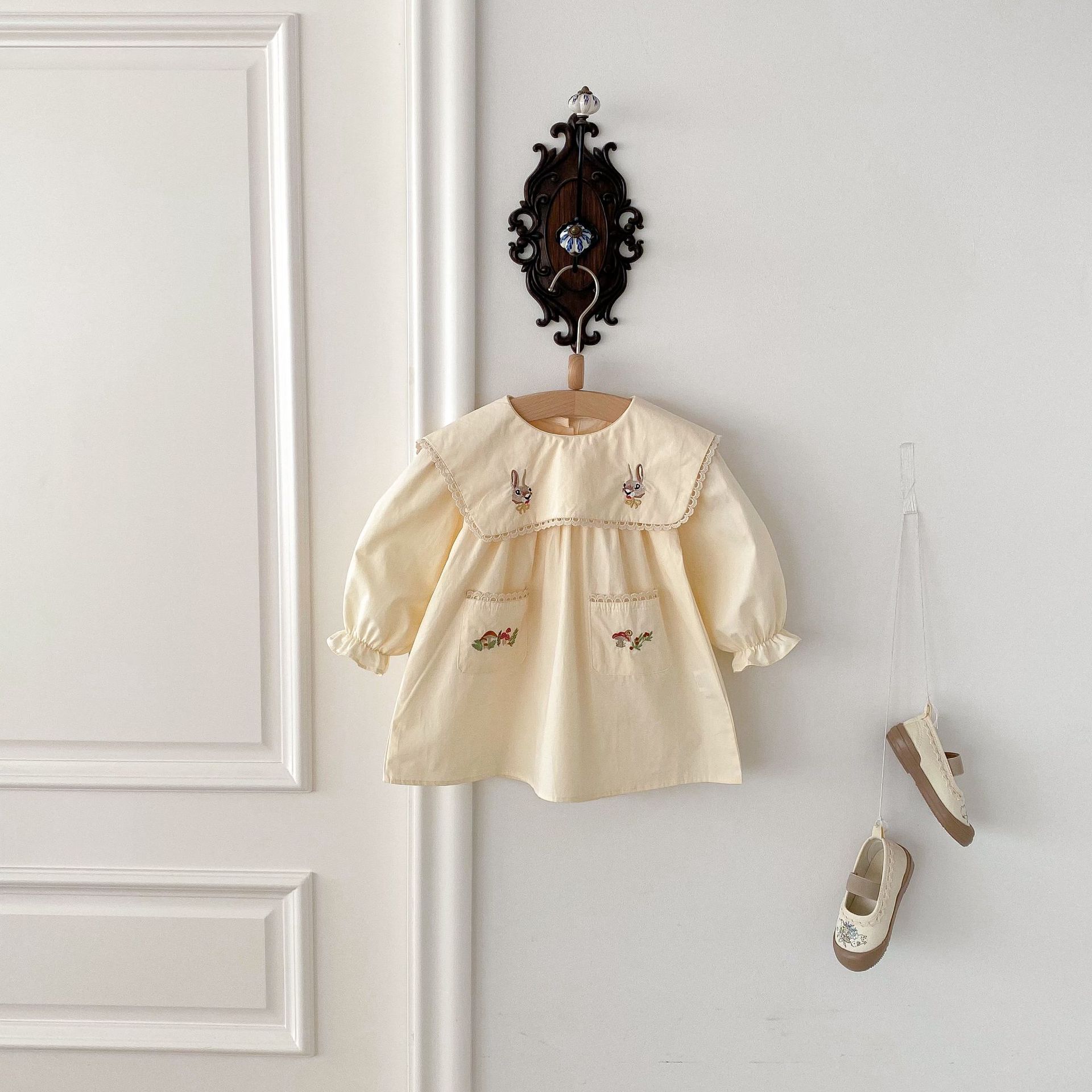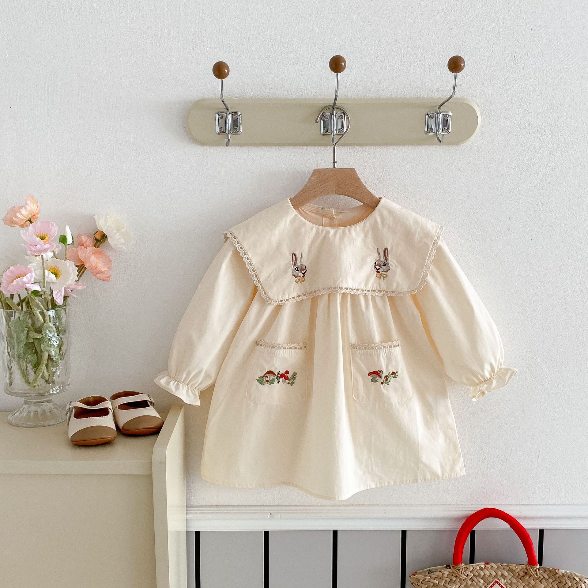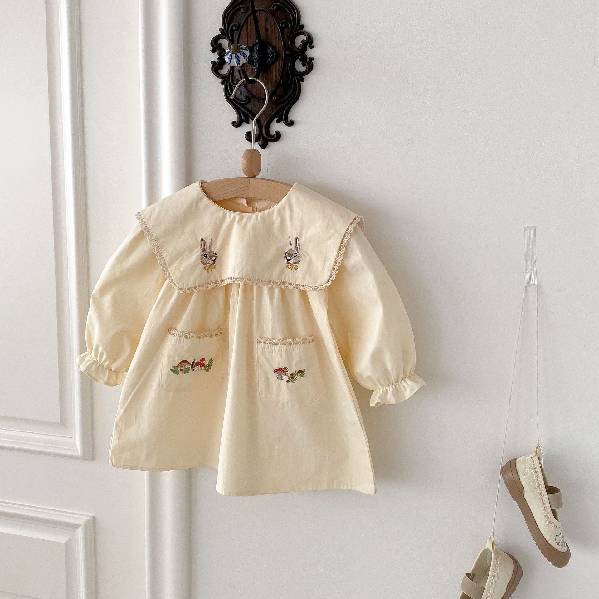 봄 2025 새로운 만화 토끼 수 놓은 한국 스타일 소녀의 원피스 옷깃 포켓 버섯 원피스스토어 가기