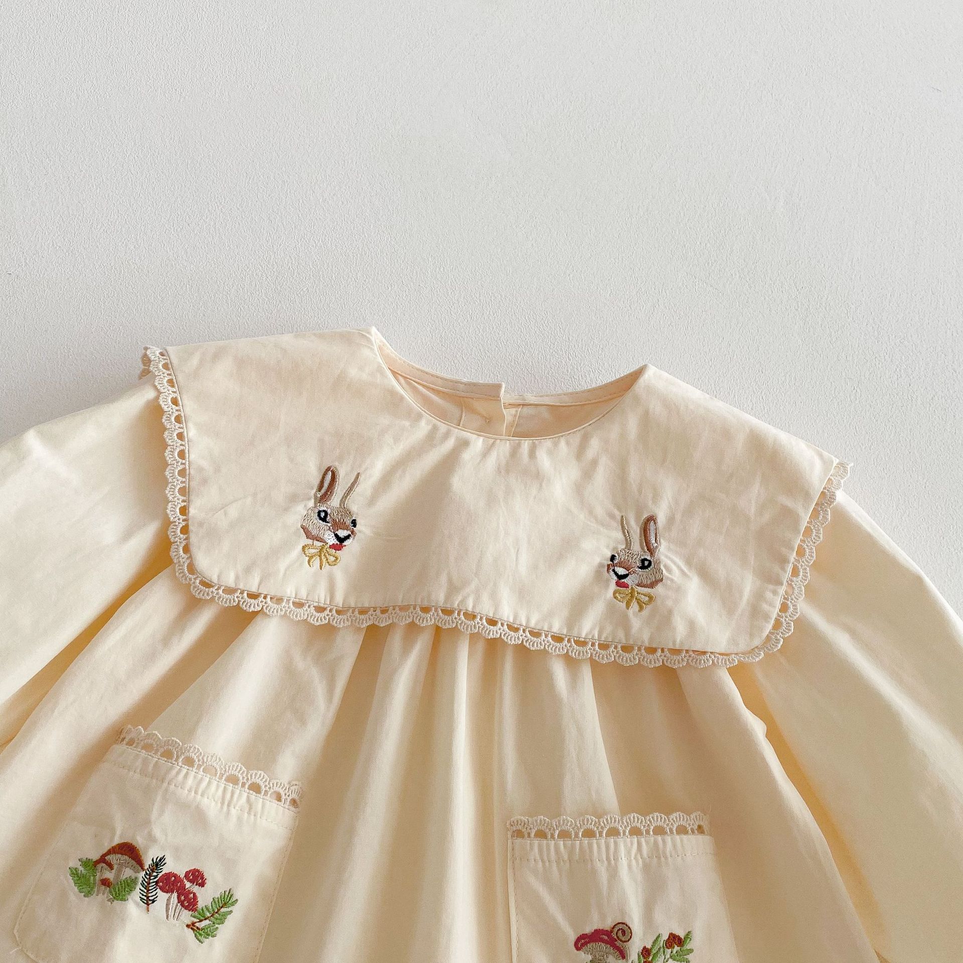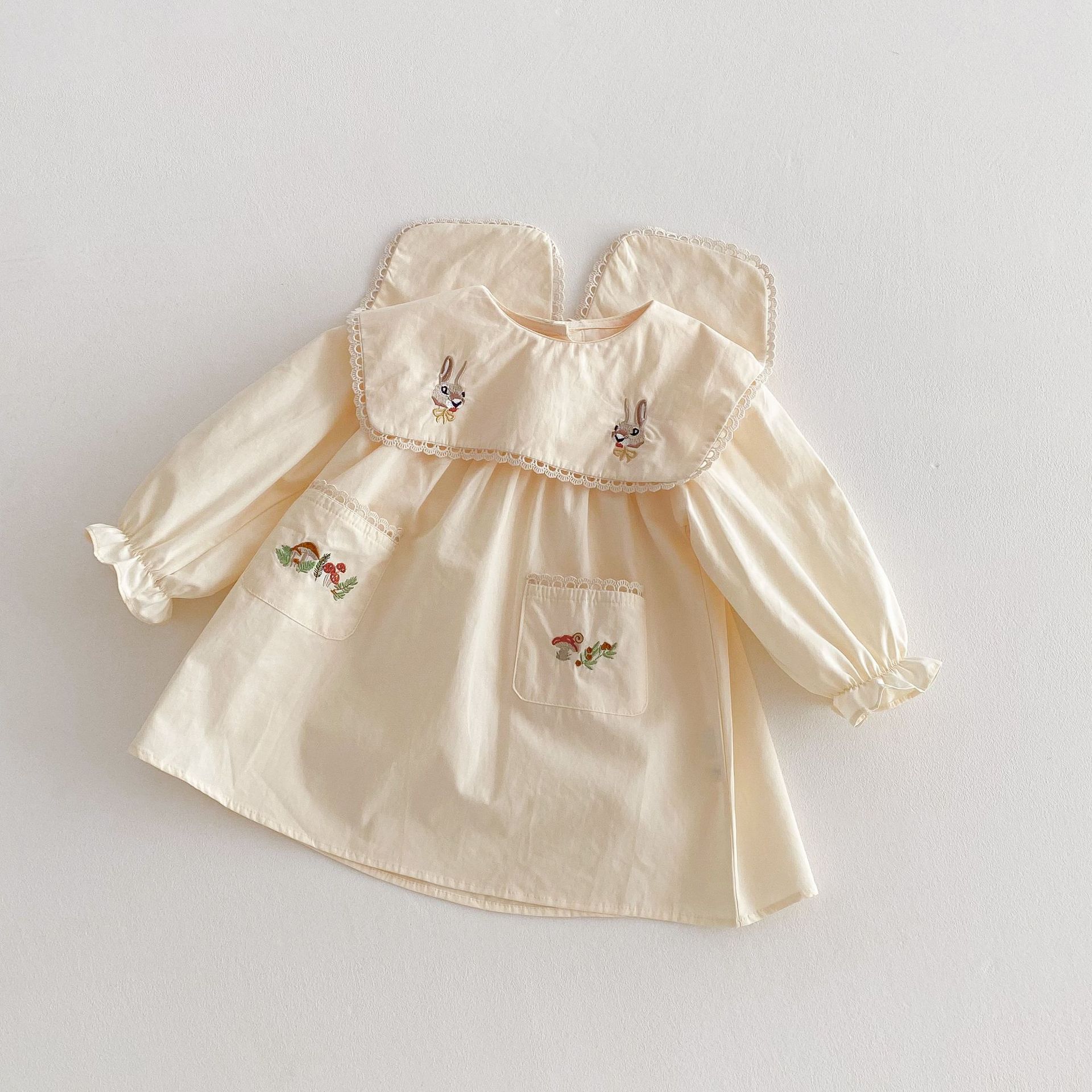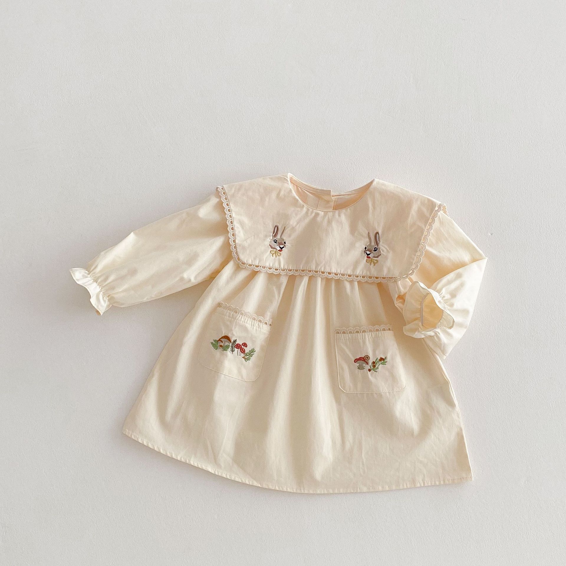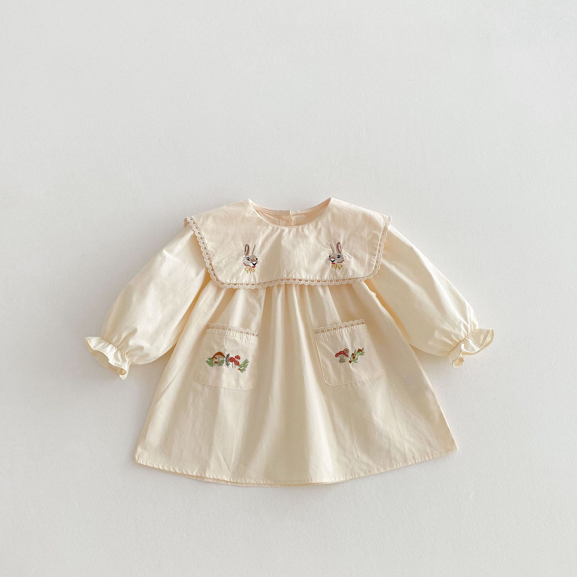 봄 2025 새로운 만화 토끼 수 놓은 한국 스타일 소녀의 원피스 옷깃 포켓 버섯 원피스