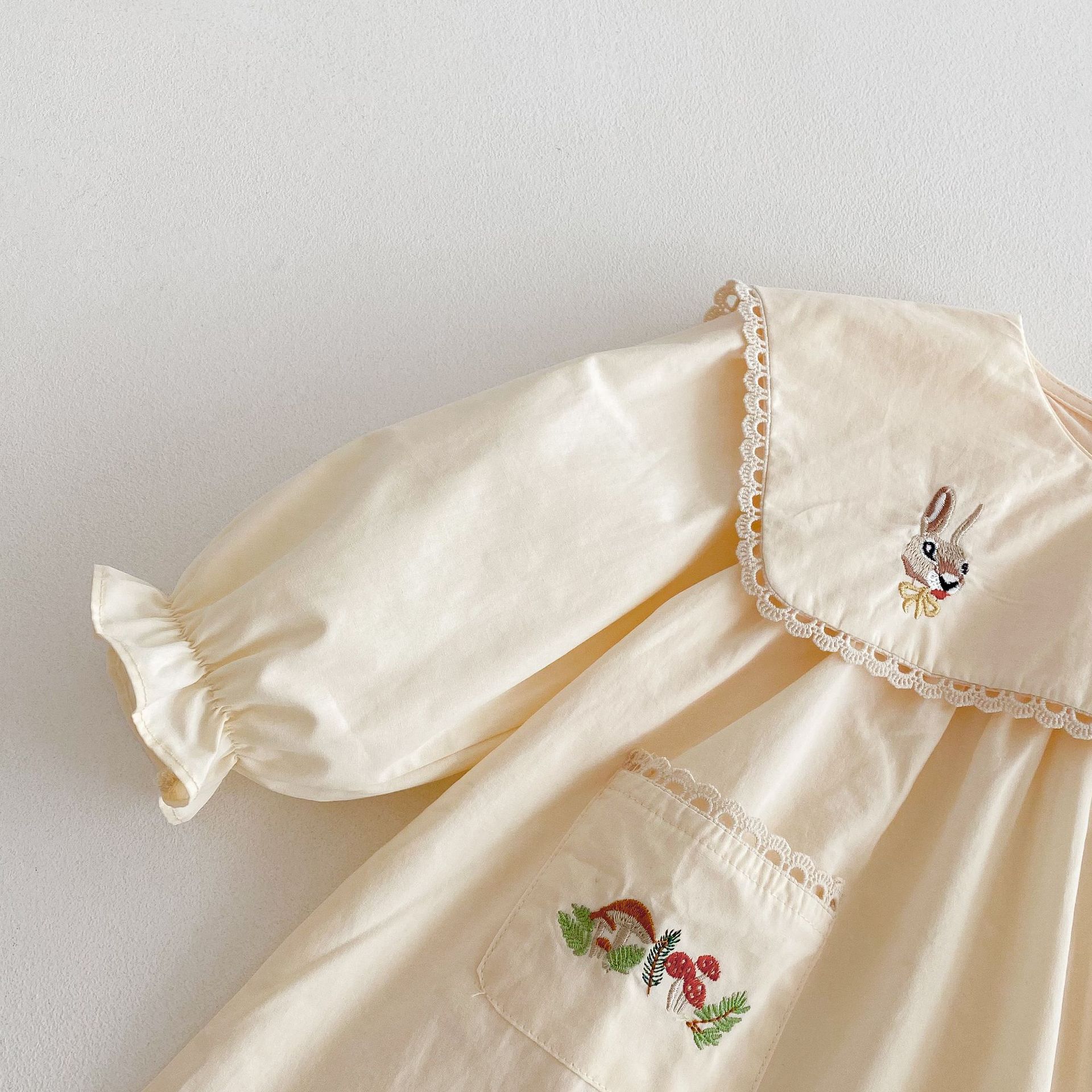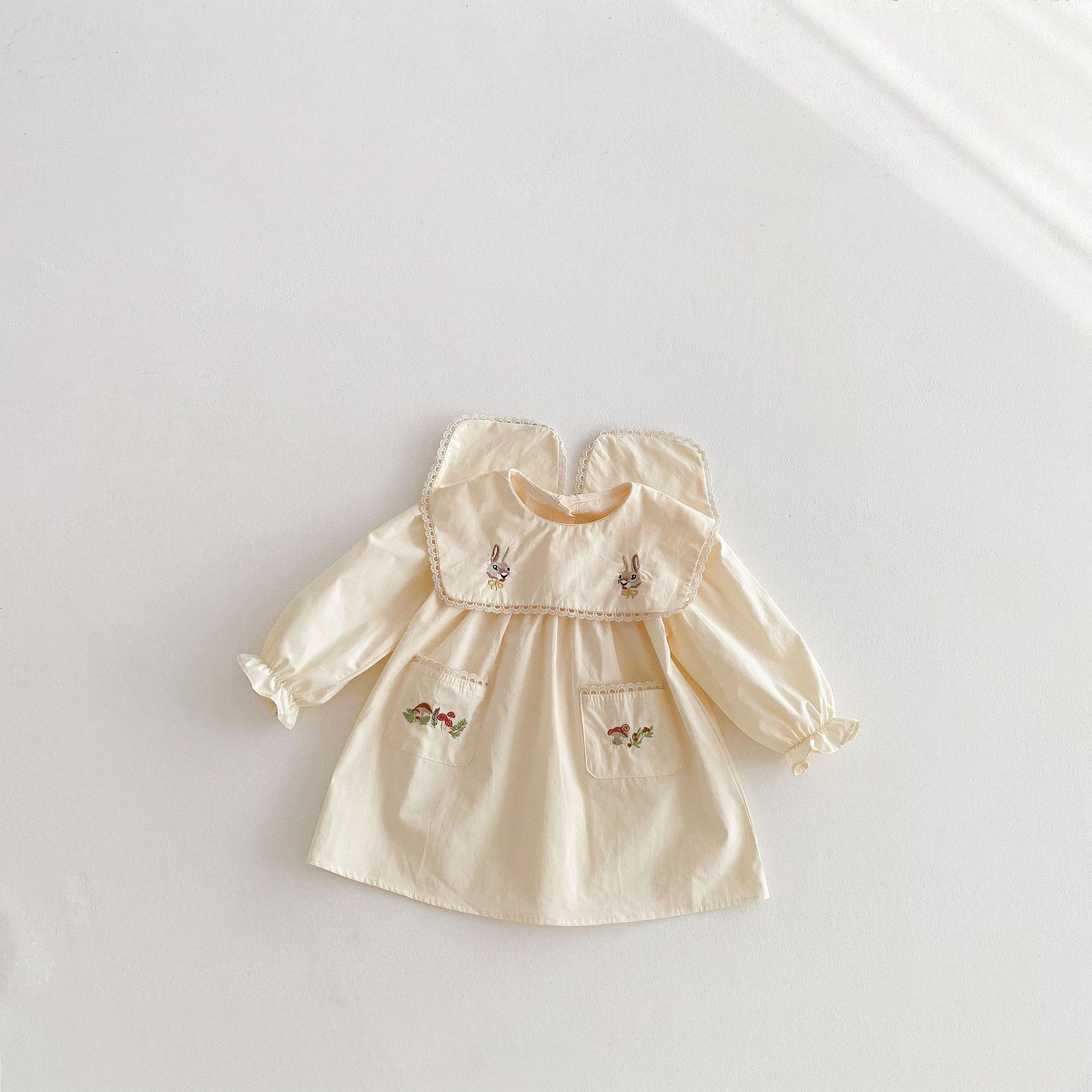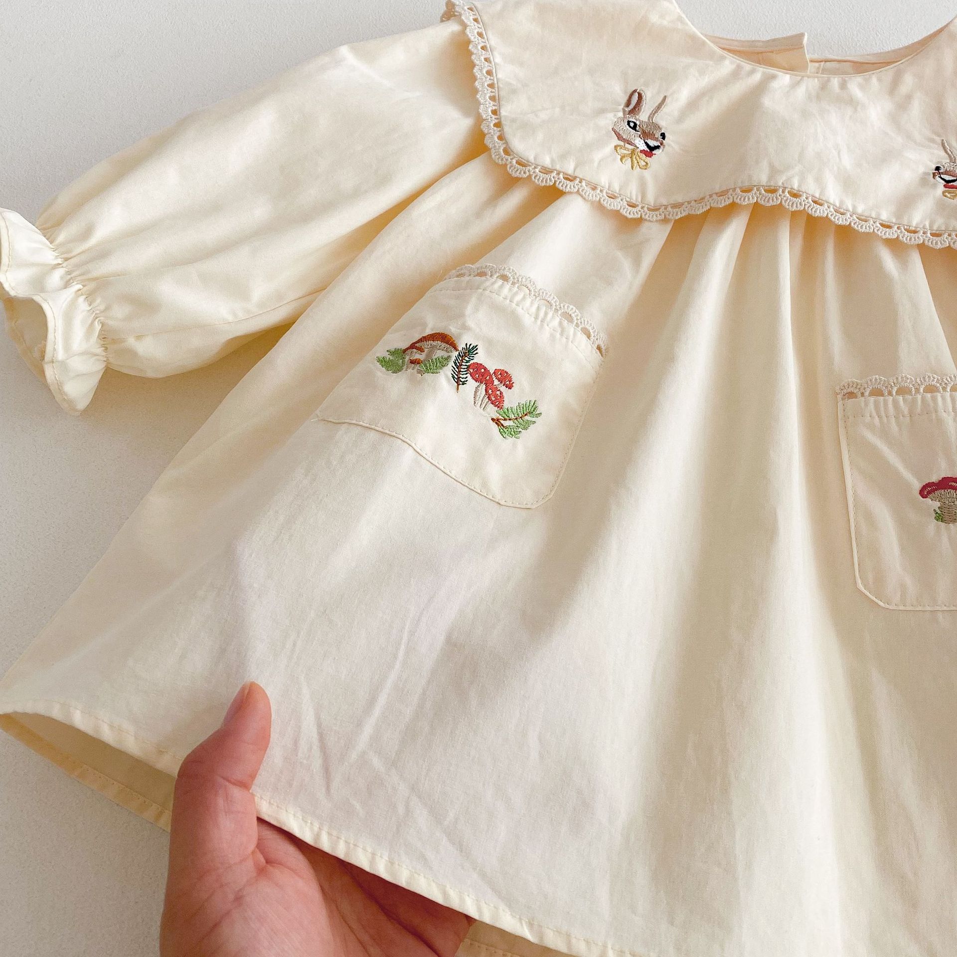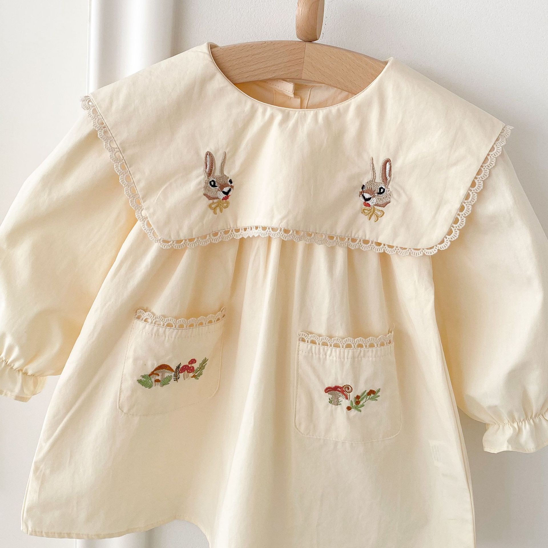 봄 2025 새로운 만화 토끼 수 놓은 한국 스타일 소녀의 원피스 옷깃 포켓 버섯 원피스