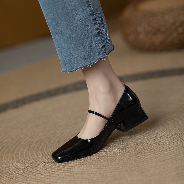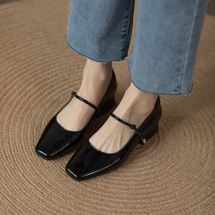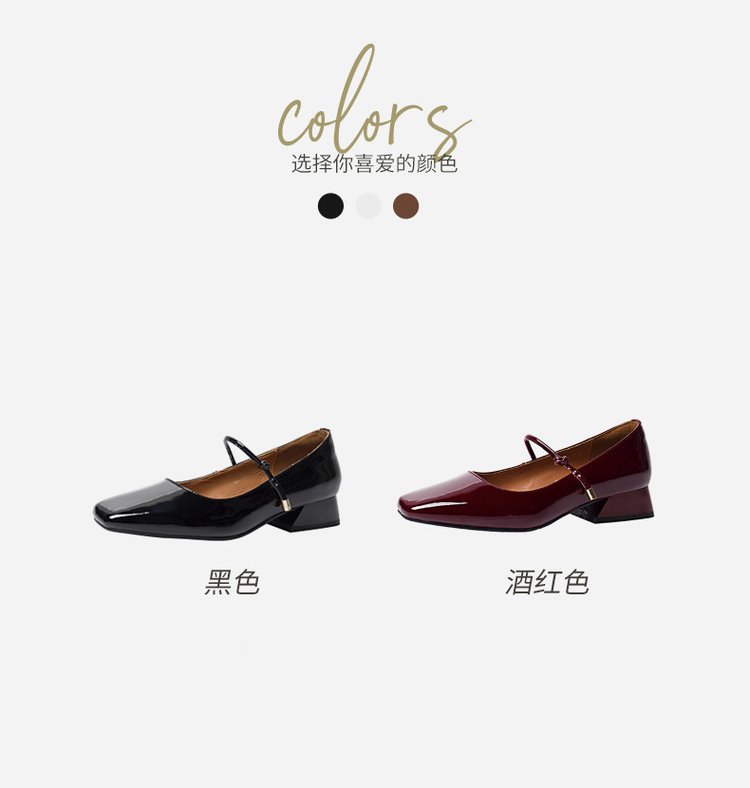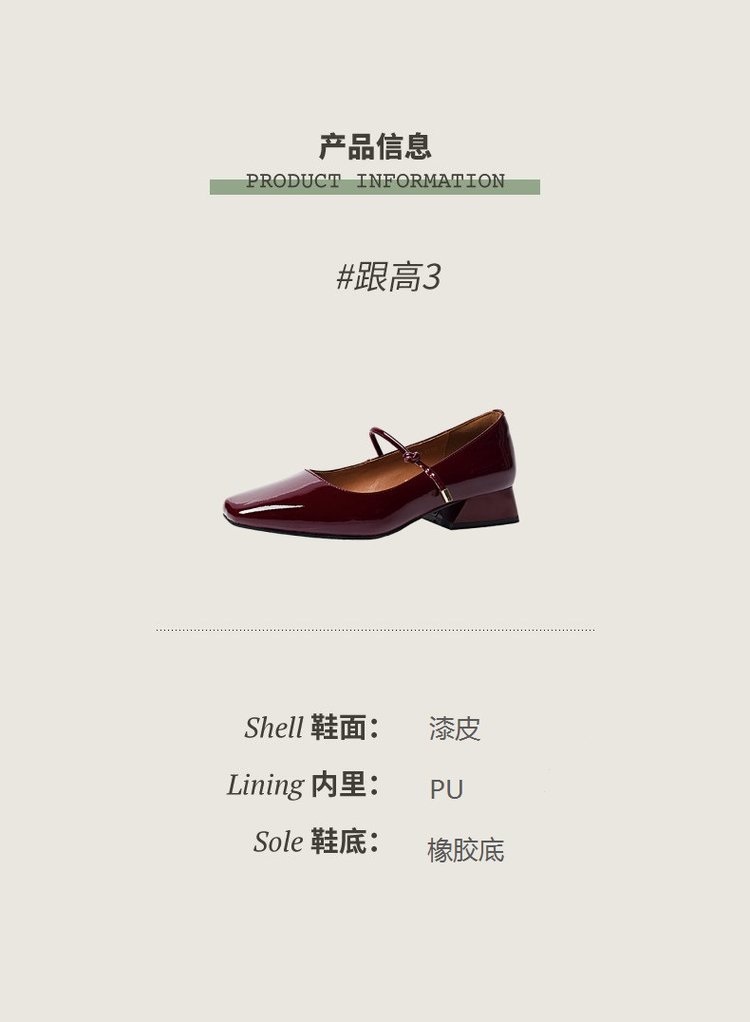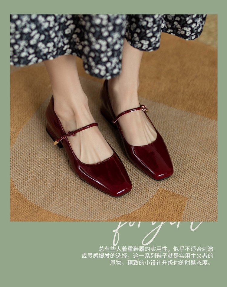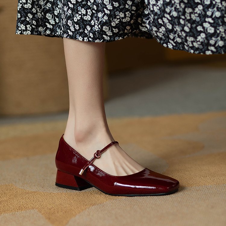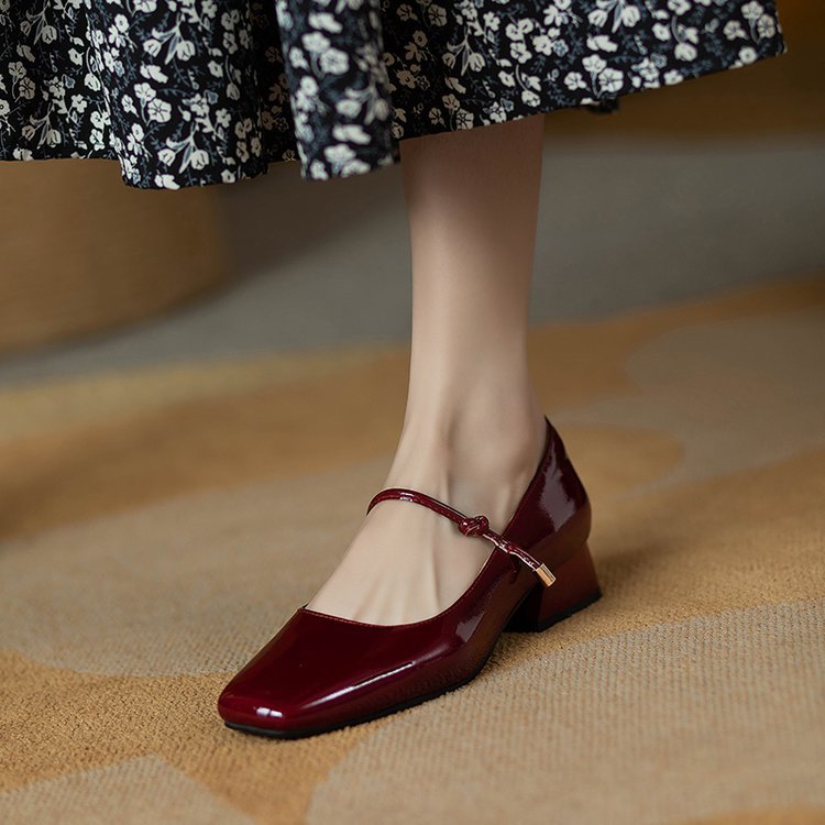 한 단어 벨트 메리 제인 버건디 스퀘어 토 작은 가죽 신발 빈티지 특허 가죽 싱글 레이어 신발 여성 프렌치 스타일 신발 두꺼운 힐 로우 싱글 레이어 신발