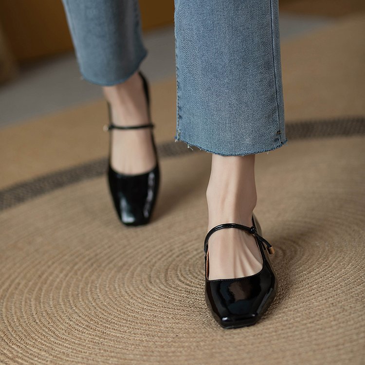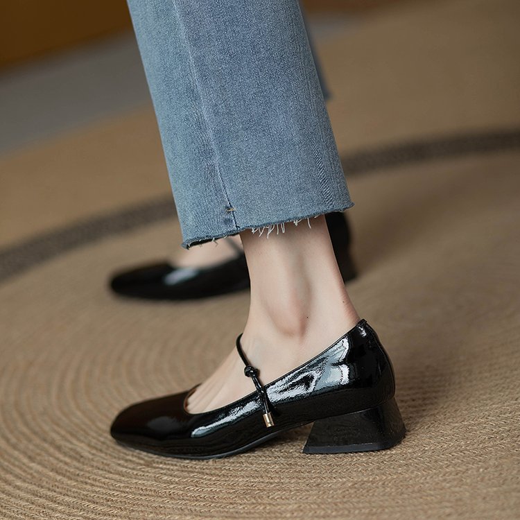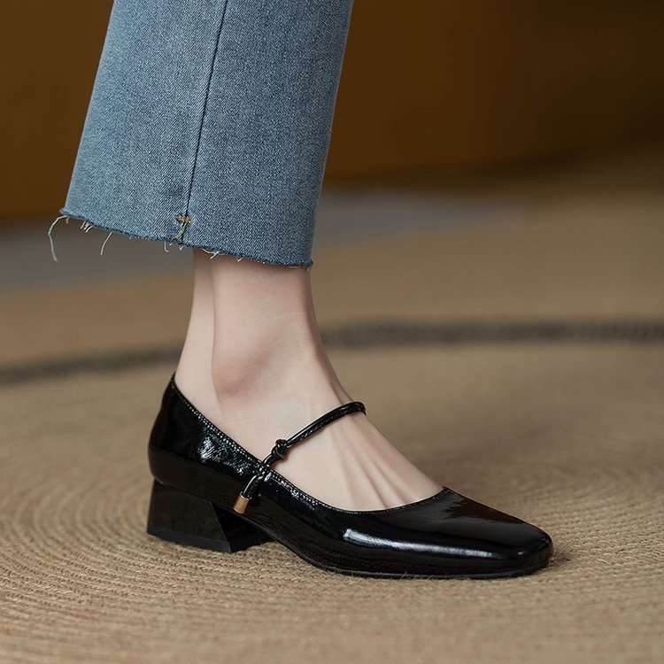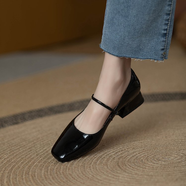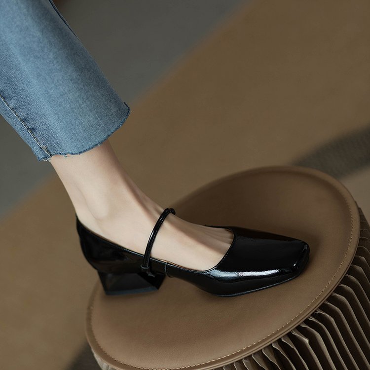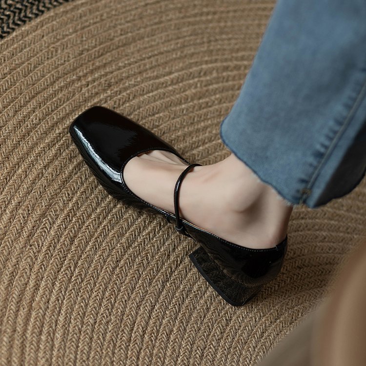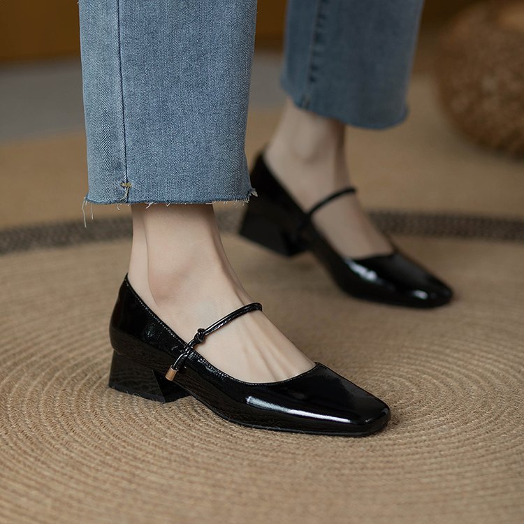 한 단어 벨트 메리 제인 버건디 스퀘어 토 작은 가죽 신발 빈티지 특허 가죽 싱글 레이어 신발 여성 프렌치 스타일 신발 두꺼운 힐 로우 싱글 레이어 신발