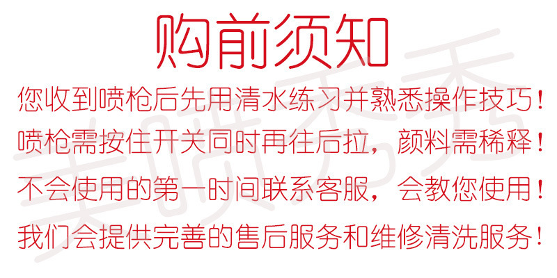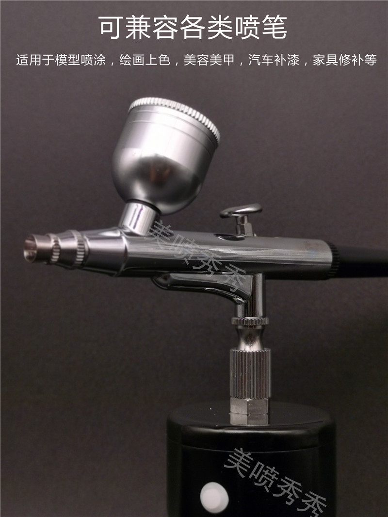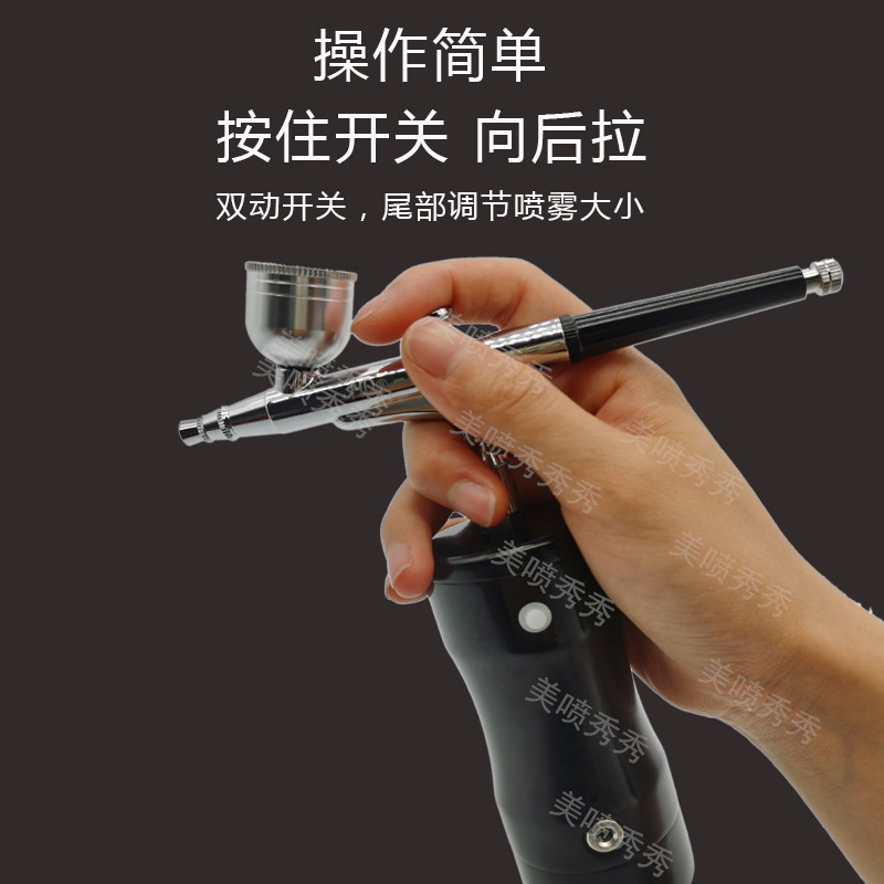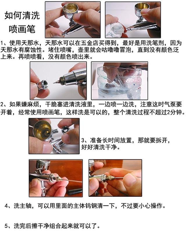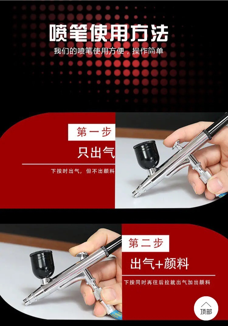 提示:手持部分的气泵是电子产品不能用水清洗、泡水或进水,否则将影响气泵正常工作使用,不支持售后服务的。上半部分喷笔可以旋下来浸泡或清洗残留的颜料。