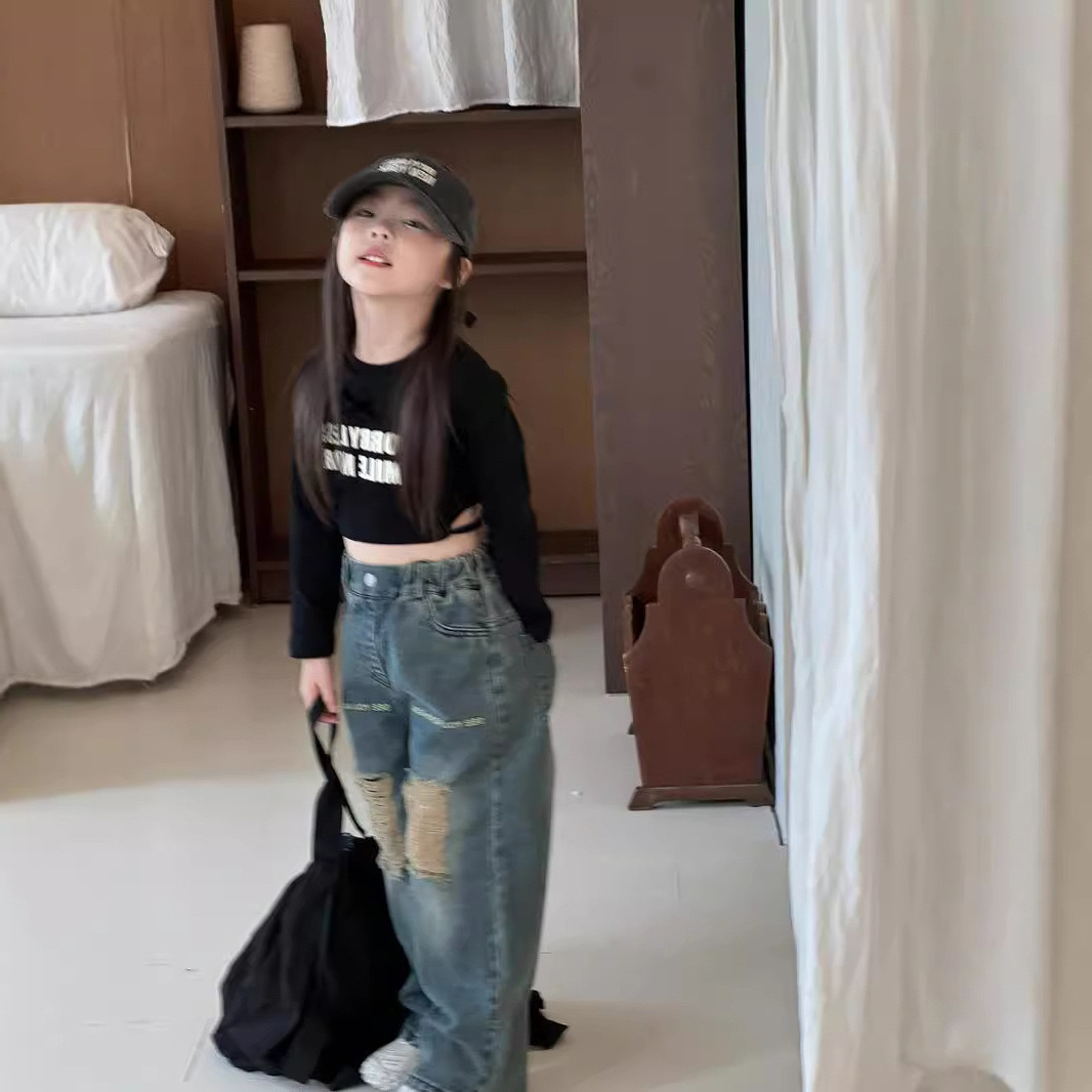 소녀 청바지 가을 새로운 한국 팬 복고풍 오래된 구멍 스트레이트 바지 넓은 다리 바지 어린이 머리카락 세대스토어 가기